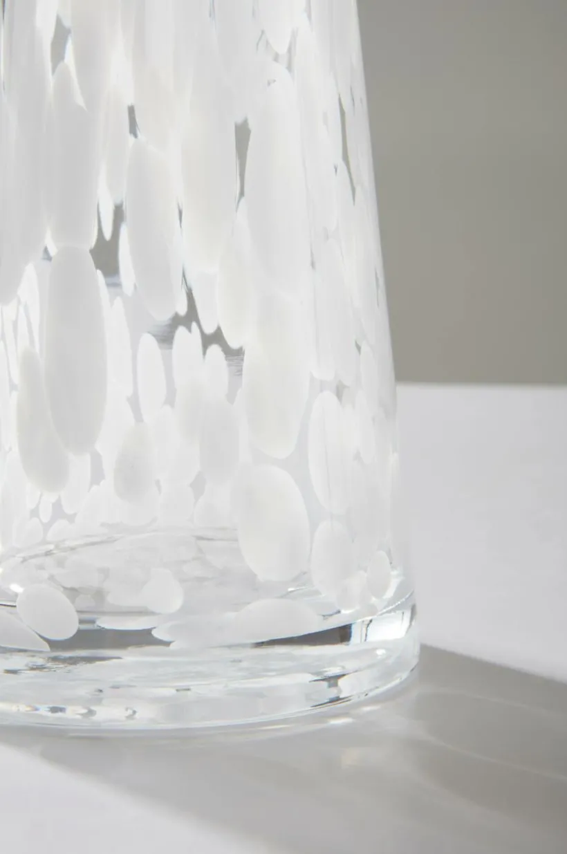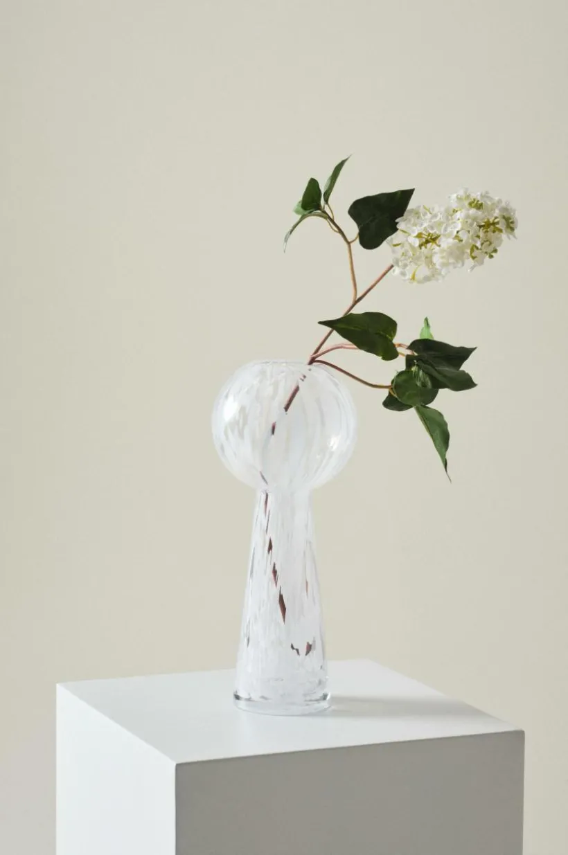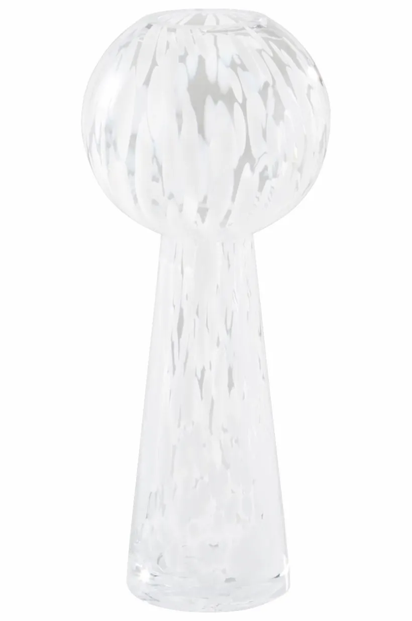 Handgjord glasvas i klarglas med vit dekor i glaset. Den speciellt formade vasen lyfter fram skönheten hos höga snittblommor. Hantverket gör varje vas unik.