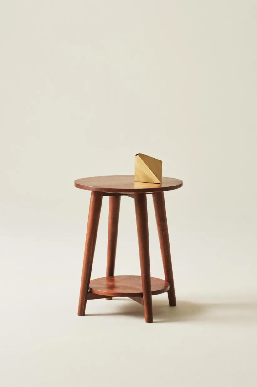 Rustikt sidobord av massivt mangoträ med ytbehandling som ger träet vacker färgton och som gör att den fina ådringen bibehålls. Det runda bordet har fyra lätt utställda ben och en avlastningsskiva nära golvet. Det här bordet är också fint som piedestal med en lummig växt på varje bordsskiva, gröna växter ger rummet en inbjudande känsla. Viss montering krävs. Monteringsanvisning medföljer.