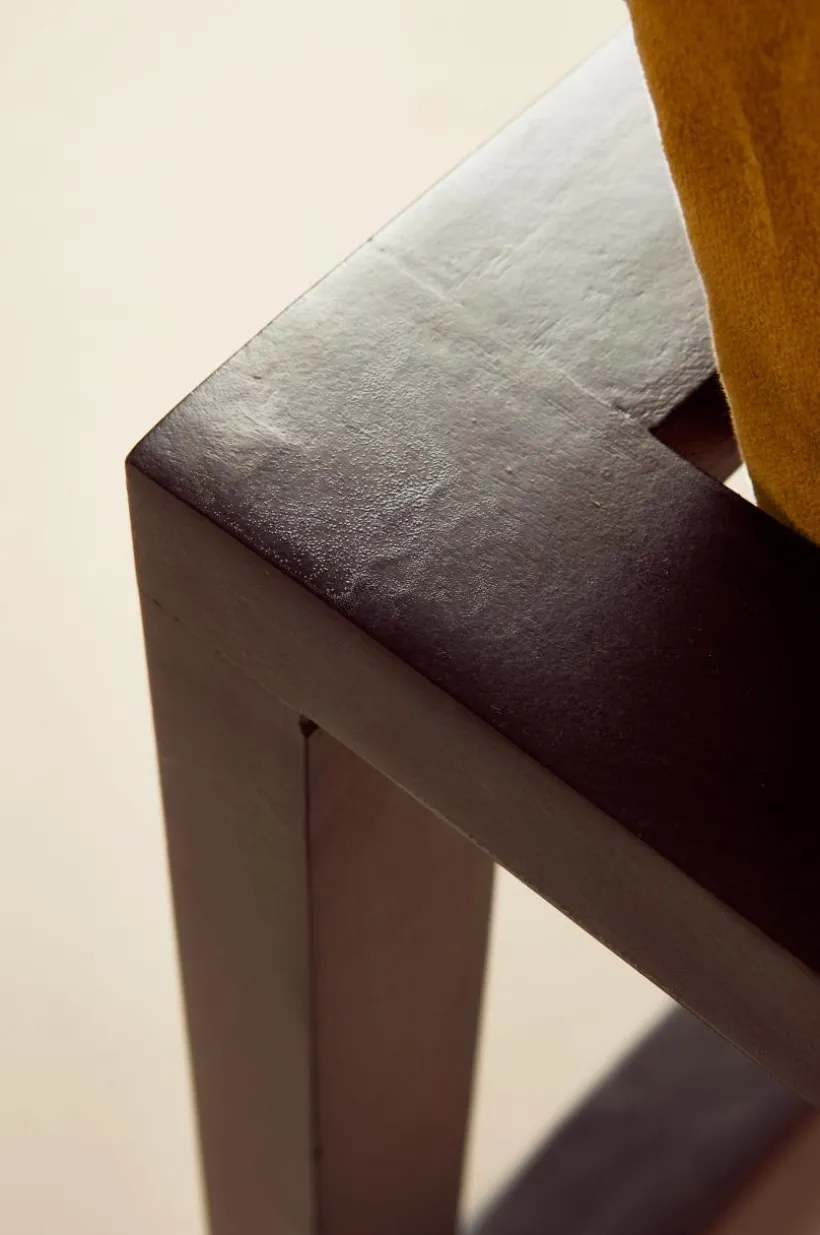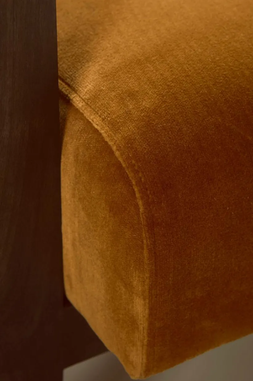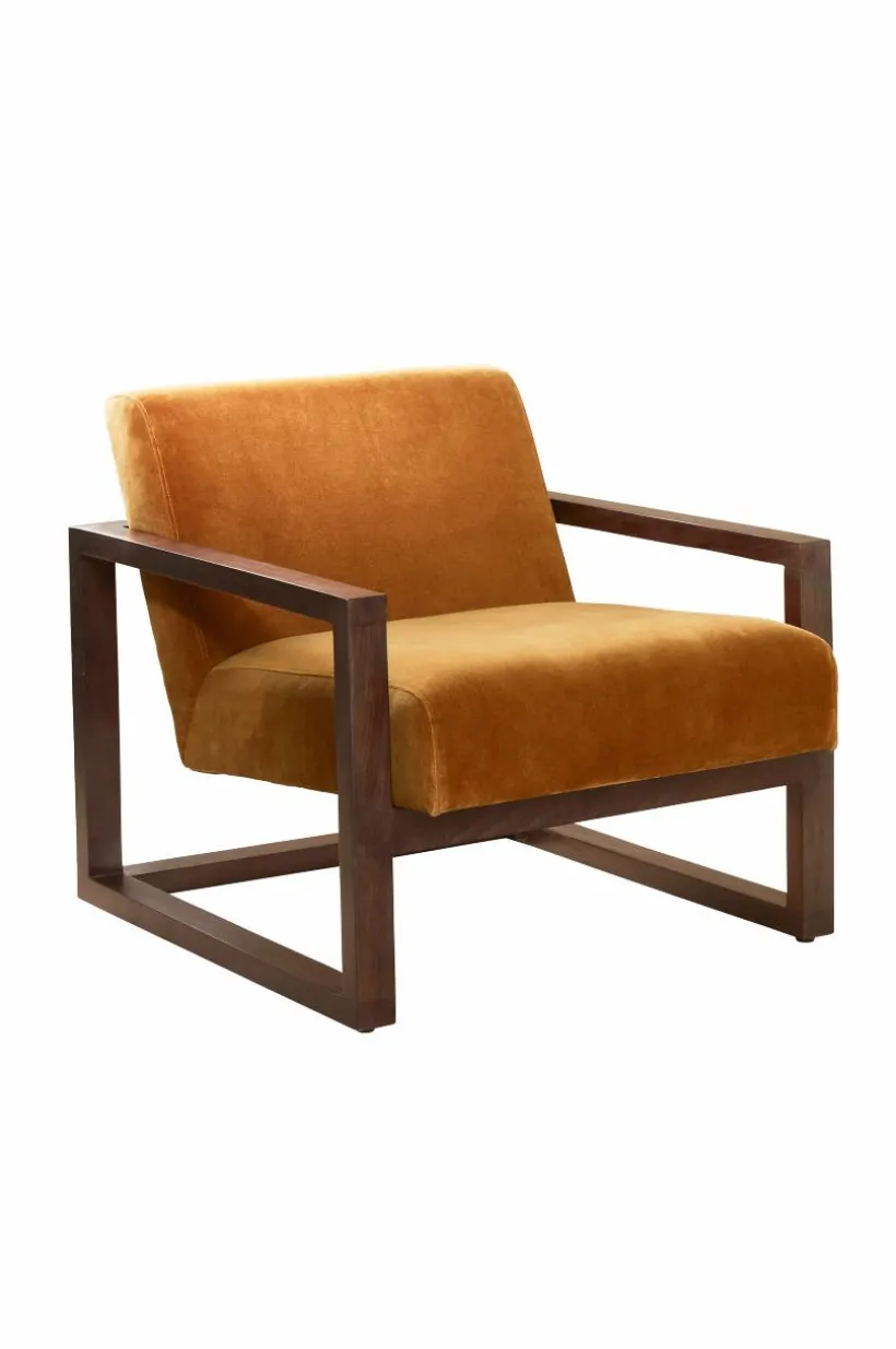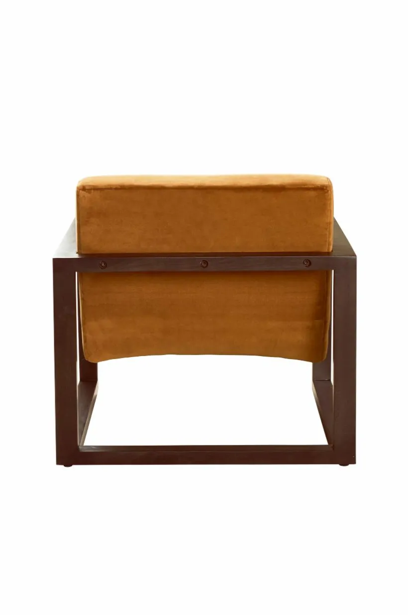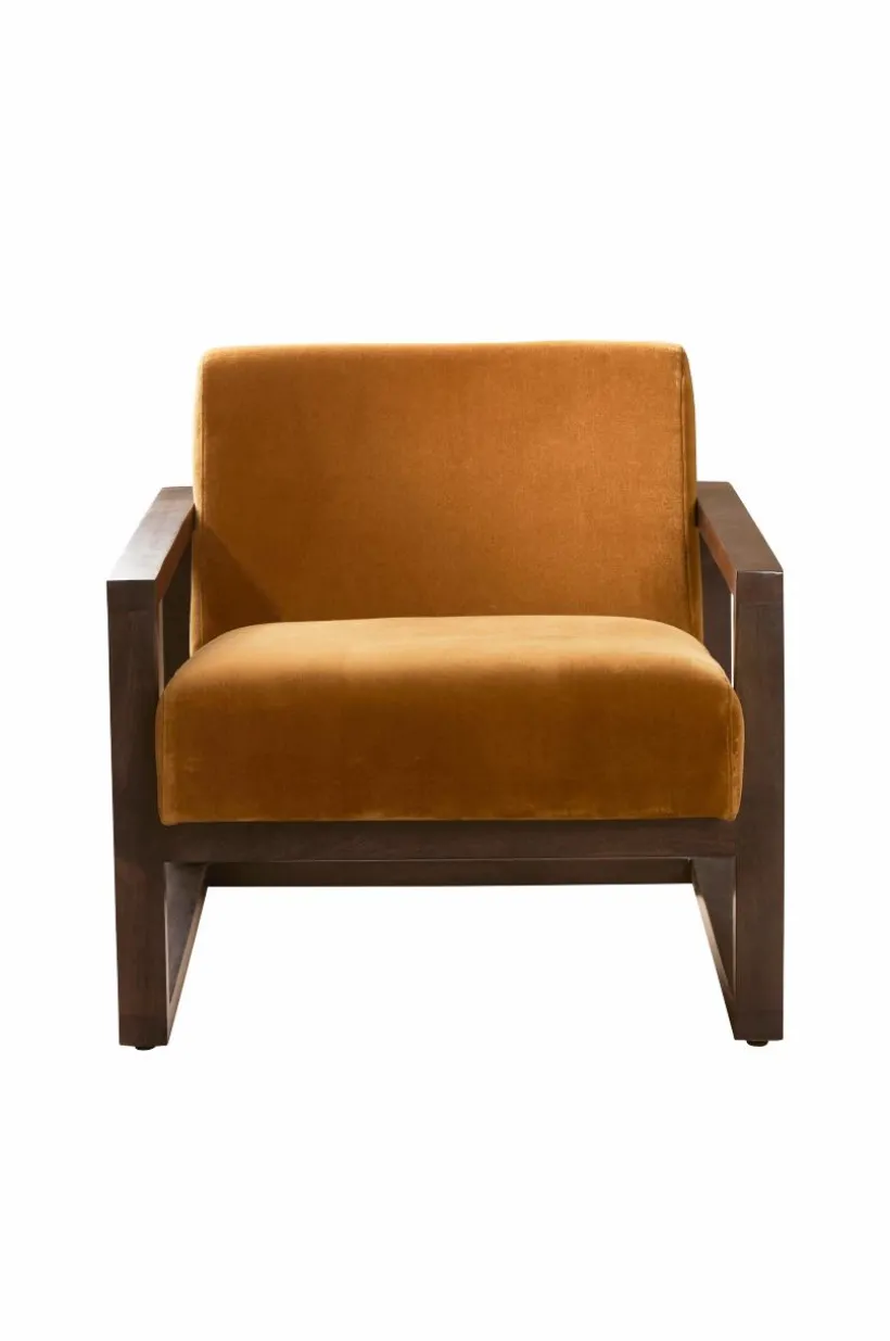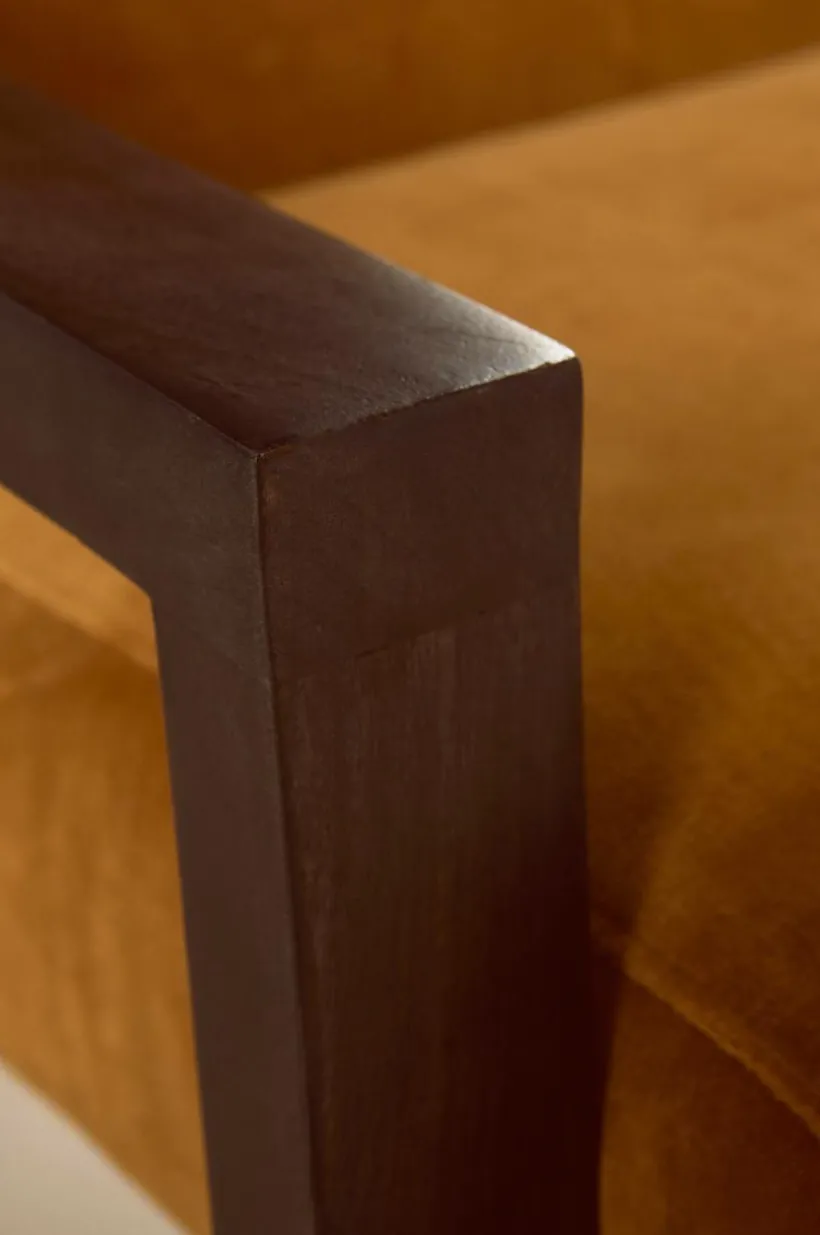 Fåtölj med sidor av mörkt mangoträ och klädsel av sammet. Bekväm sits och rygg med träram som är mjukstoppad med polyester så att den blir bekväm att sitta i.
