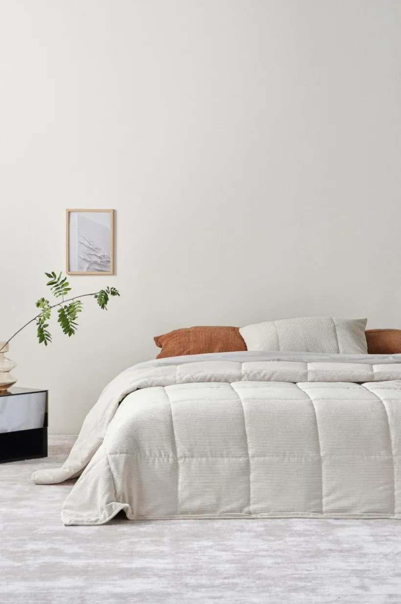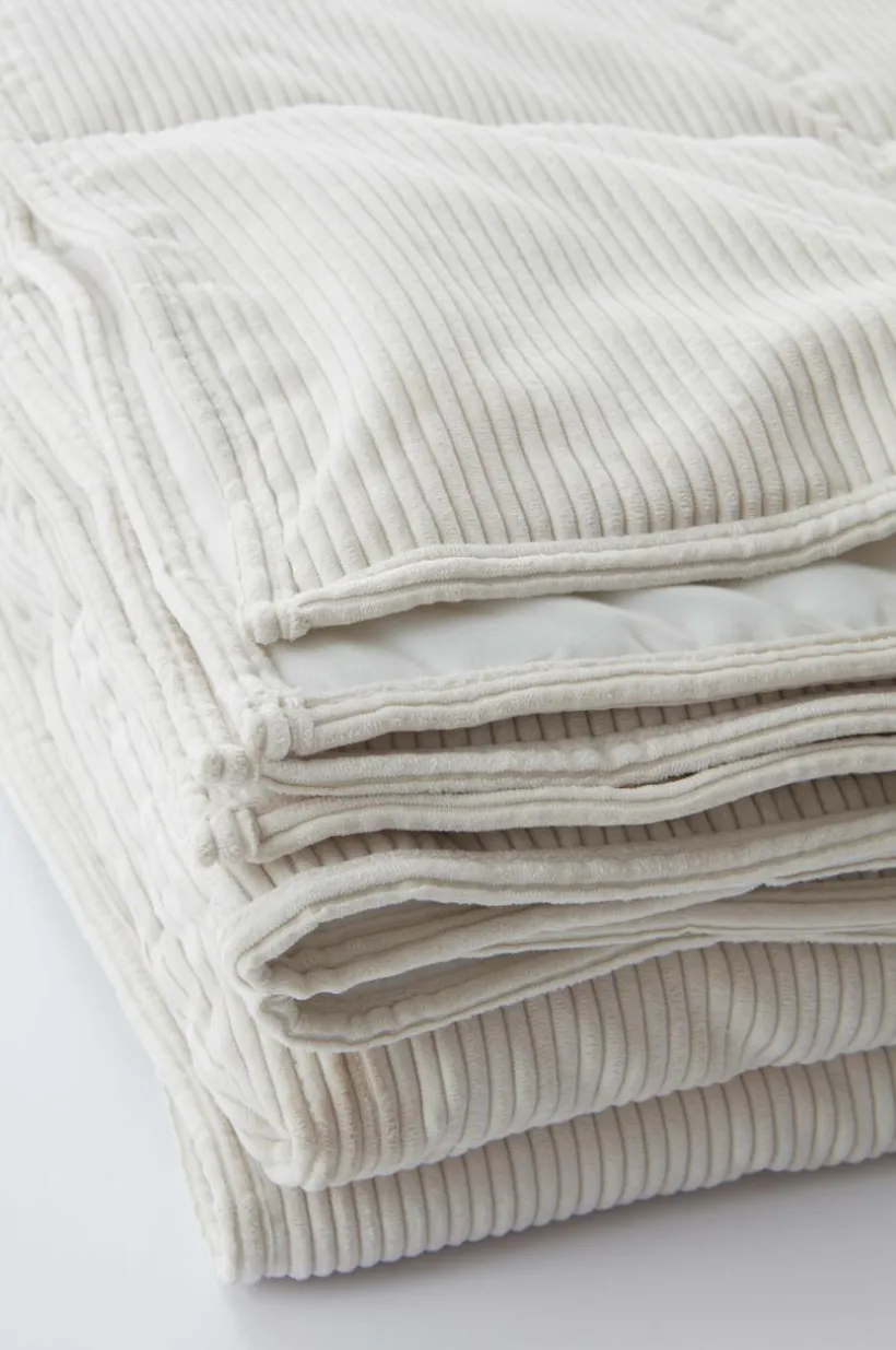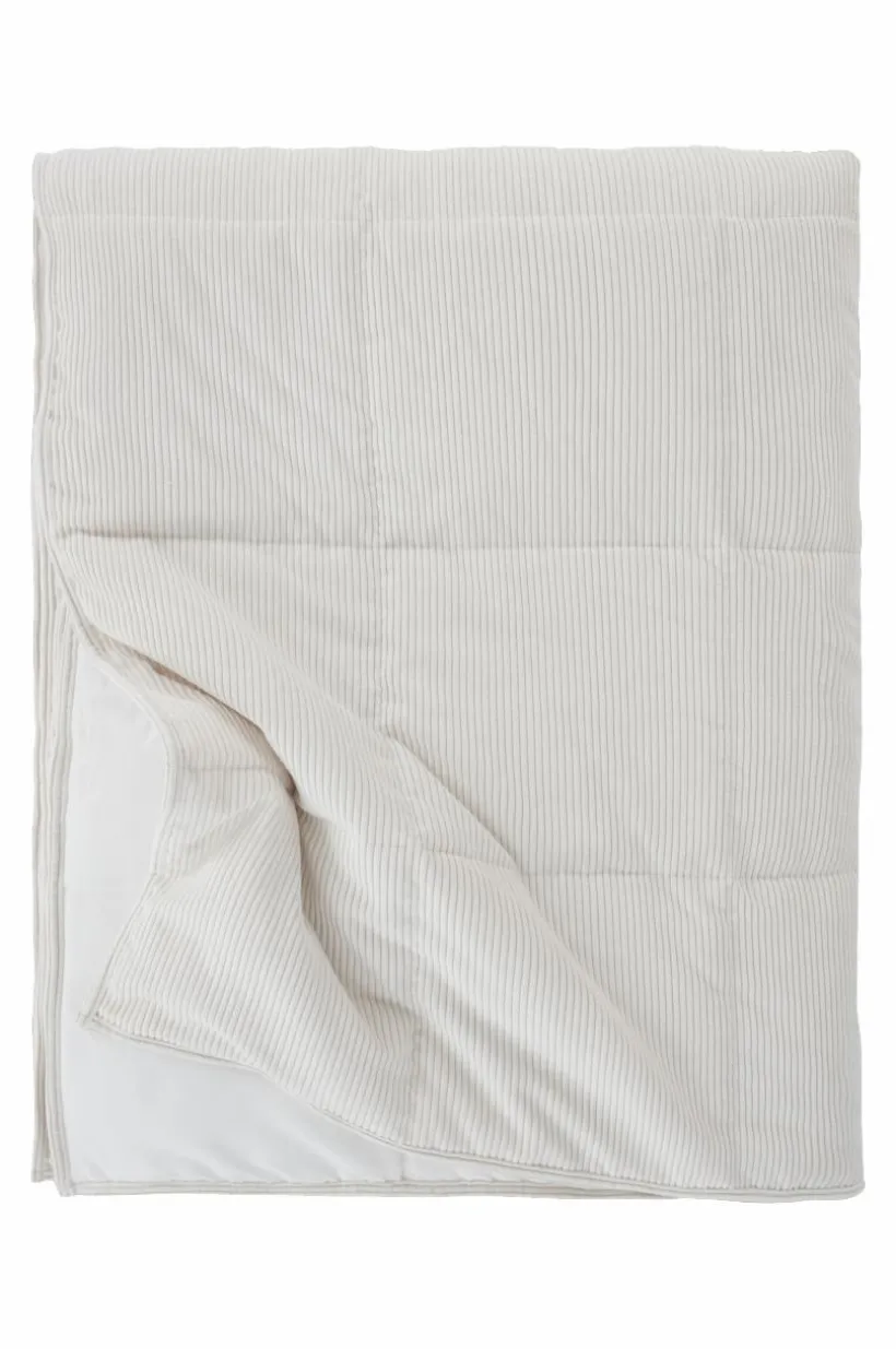 Överkast av enfärgad manchester med quiltstickning. Överkastet är smidigt och lätt att hantera. Det är fodrat med ett ljust, vävt tyg och har fållad kant runt om. Tyget är av polyester med polyamid inblandat och den lätta vadderingen är av polyester vilket även fodret är. Kuddfodral ingår ej.