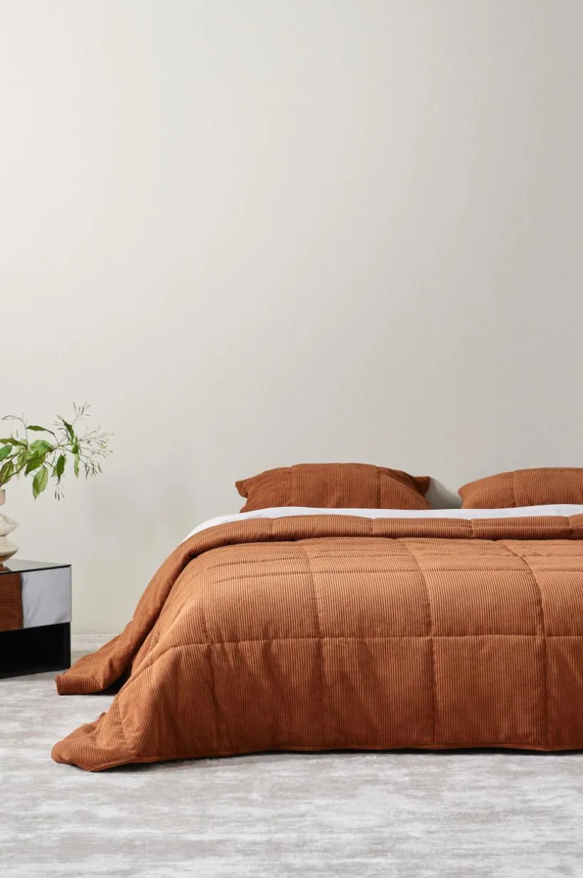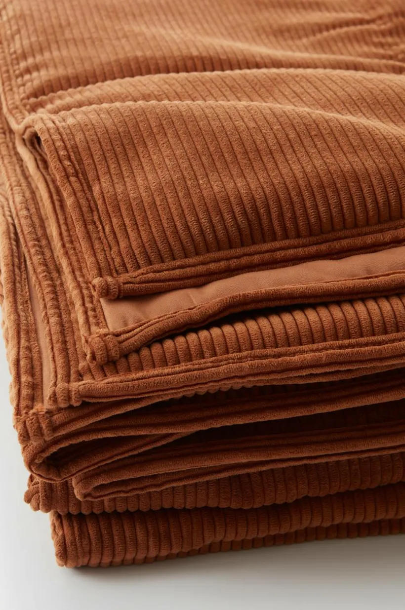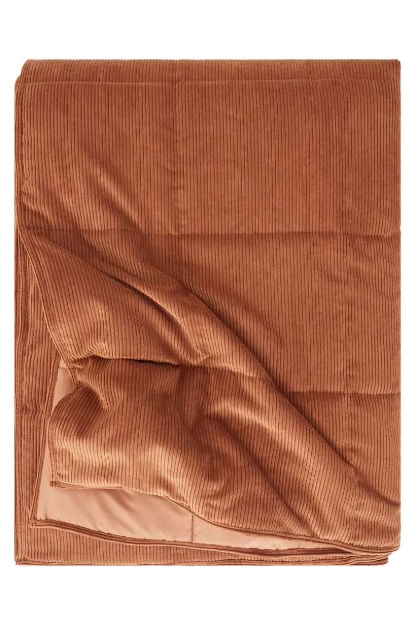Överkast av enfärgad manchester med quiltstickning. Överkastet är smidigt och lätt att hantera. Det är fodrat med ett ljust, vävt tyg och har fållad kant runt om. Tyget är av polyester med polyamid inblandat och den lätta vadderingen är av polyester vilket även fodret är. Kuddfodral ingår ej.