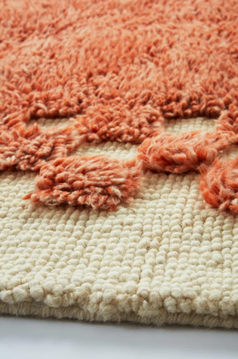 Handtuftad ullmatta med rutmönster som skapas av olika vävteknik, lugglängd och färg på garnet. Det ljusa garnet som skapar ramen runt om har vävts i öglor medan den mörkare luggen är klippt och lite längre. Ull ger en naturligt varm och praktiskt smutsavvisande matta. Lugghöjd öglor 1-1,1 cm, klippt lugg 3-3,2 cm. Tjocklek 3,2-3,4 cm. 3800-4000 g/m².