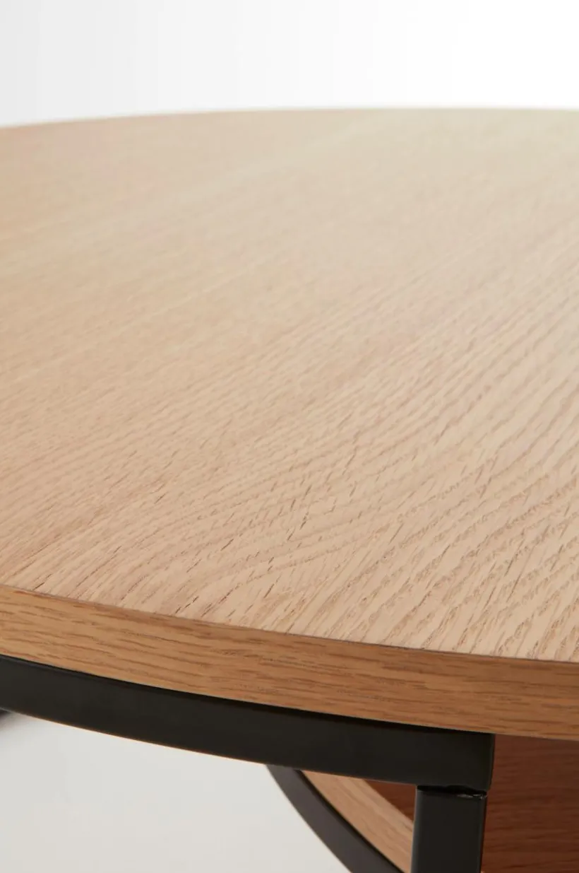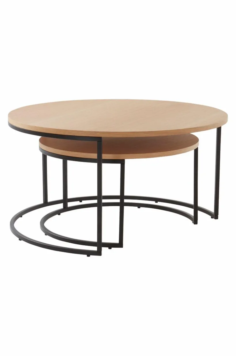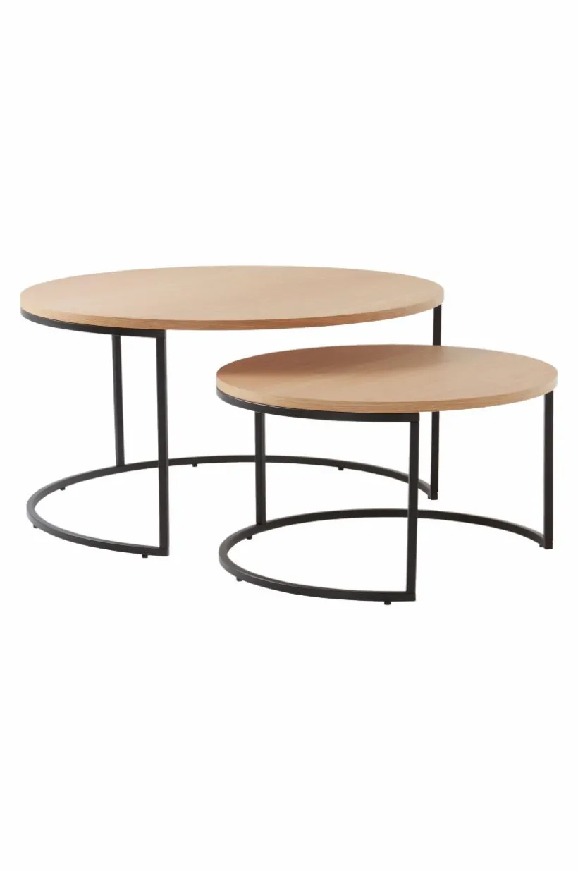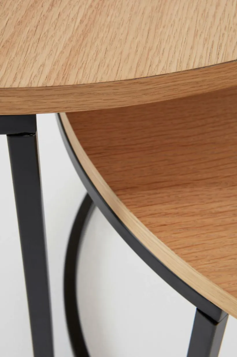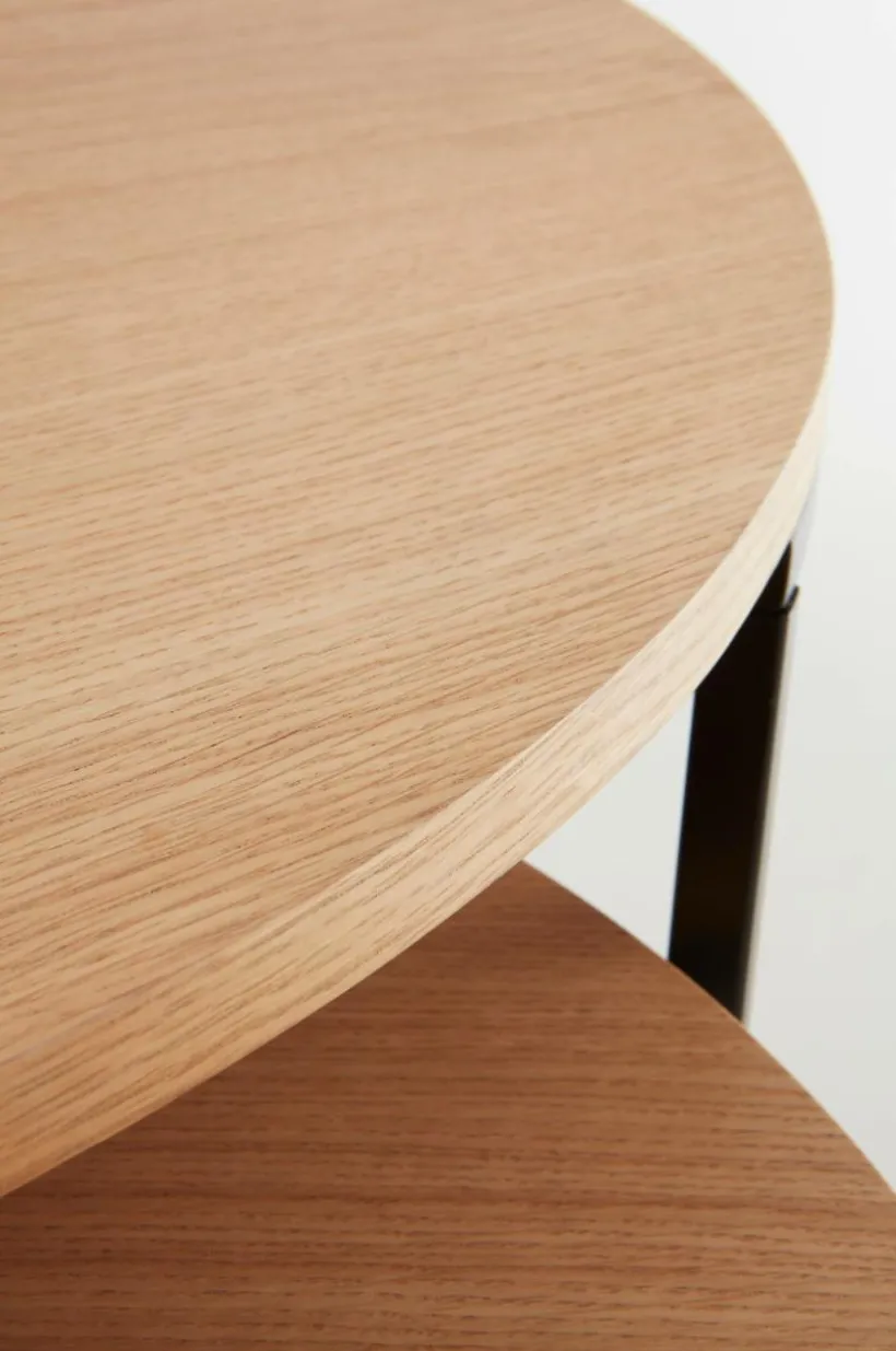 Två runda soffbord, med funktion som ett satsbord. Bordsskivan är av MDF med faner av ask eller valnöt. Bordens underrede är av stål med matt pulverlack.