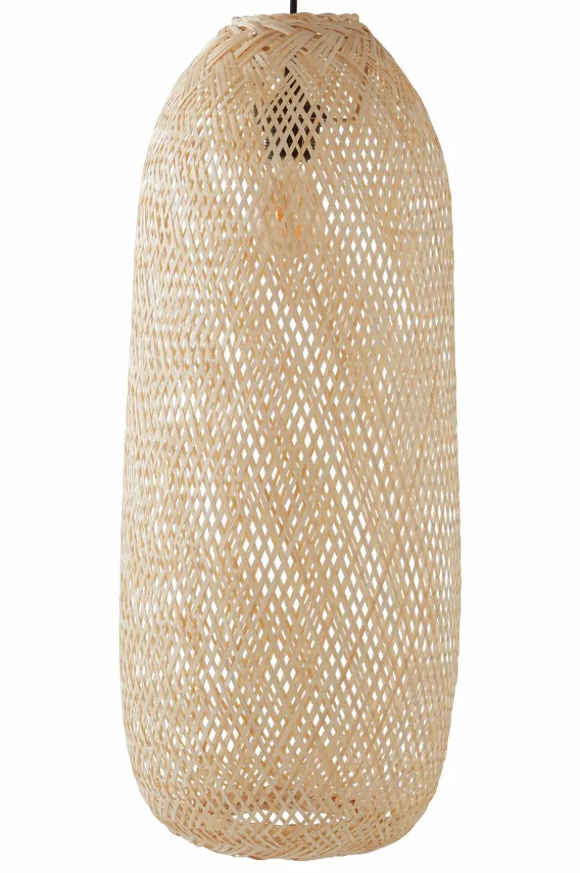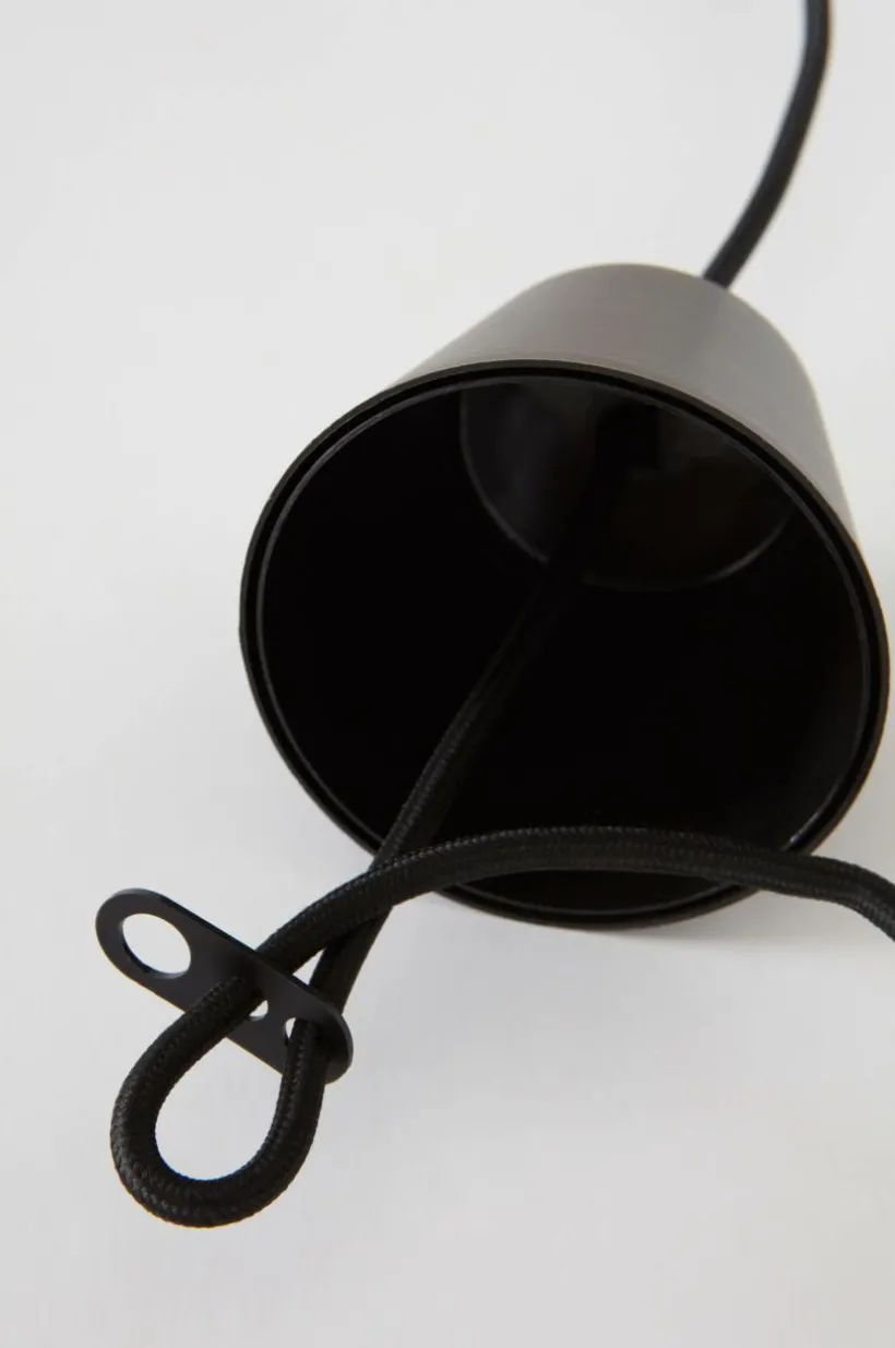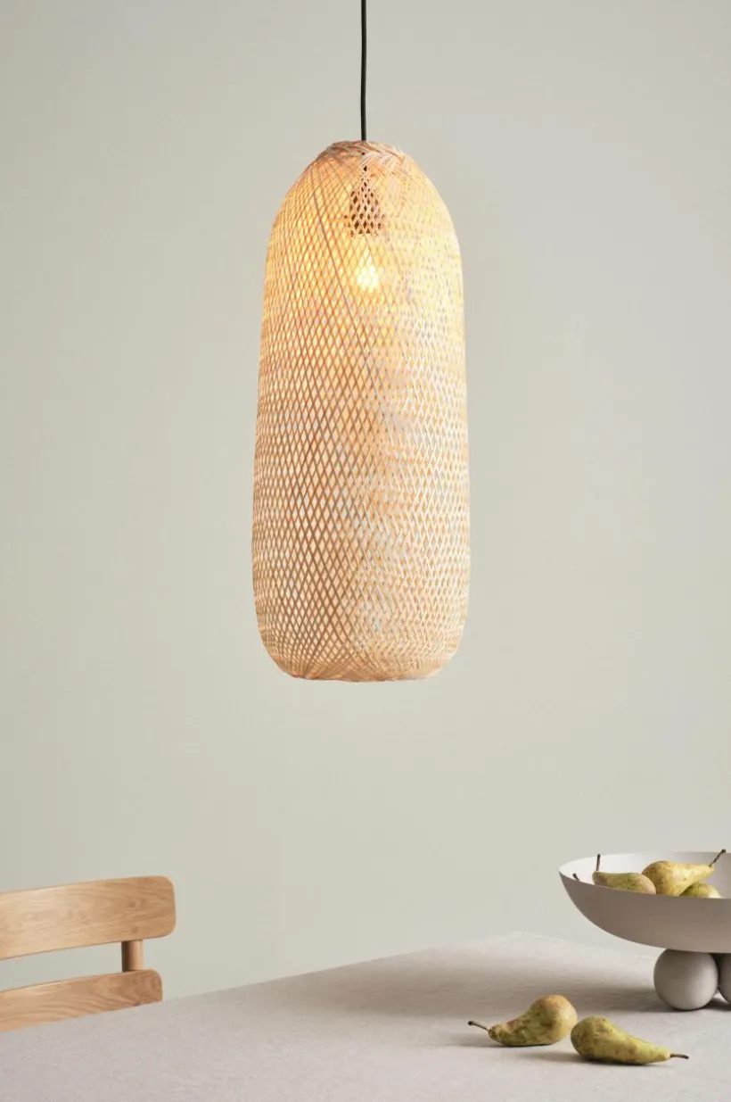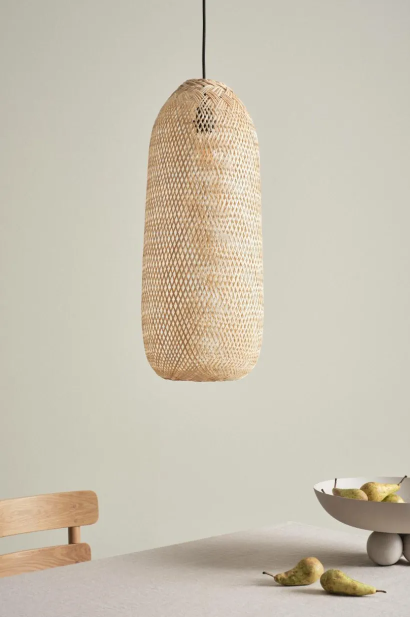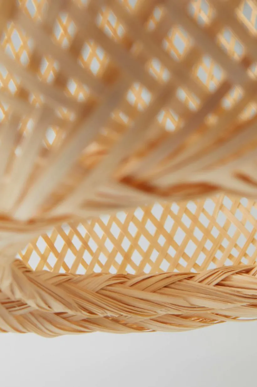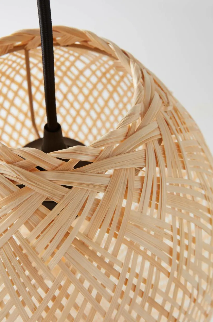 Taklampa med mjukt formad skärm av flätad bambu. Flätningen i kombination med det naturliga materialet gör att lampan sprider ett mysigt sken. Lamphållaren och sladden är dekorativt svart, textilsladd ger gedigen känsla. Lampkopp av plast. Lampan är ojordad, klass 2. På grund av EU-regler behövs en separat takkontakt i vissa länder. Takkontakten ska vara ojordad (klass 2) och köps separat.