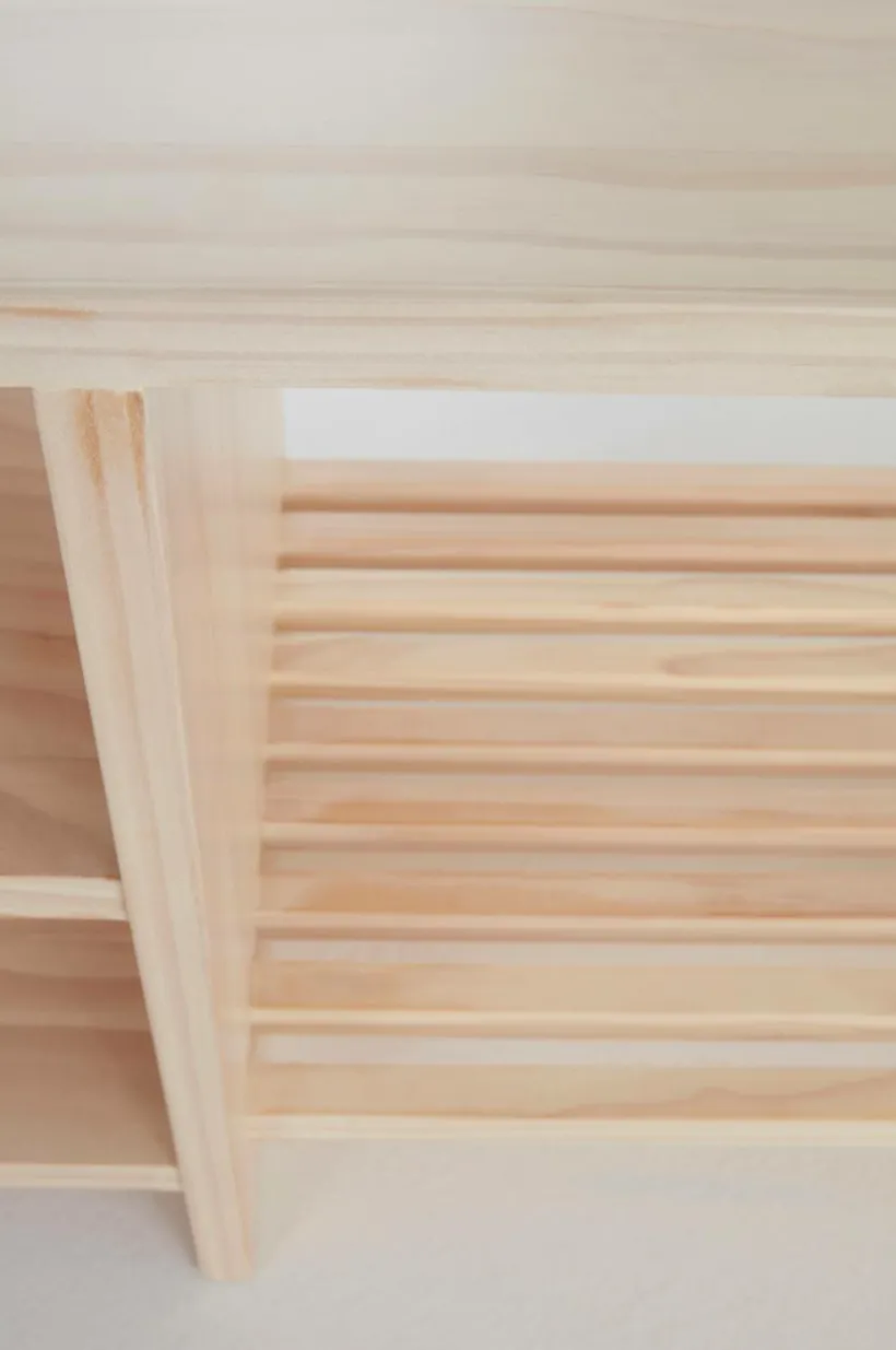 Bänk med förvaringshyllor och skohylla, möbeln är i massiv furu som är FSC-märkt. REYKJAVIK utstrålar nordisk enkelhet och serien har fin, vitsåpad finish. Bänken är stilren och utan bakstycke, så väggen syns effektfullt bakom hyllan. Sidorna har fogats samman genom sinkning vilket ger gedigna, vackra möten och hyllans hörn blir en fin detalj. Bänken har två hyllor för förvaring på ena sidan och en skohylla av fyrkantsstavar. Den praktsika möbeln passar perfekt i hallen och ger dig förvaring och sittplats i samma möbel.