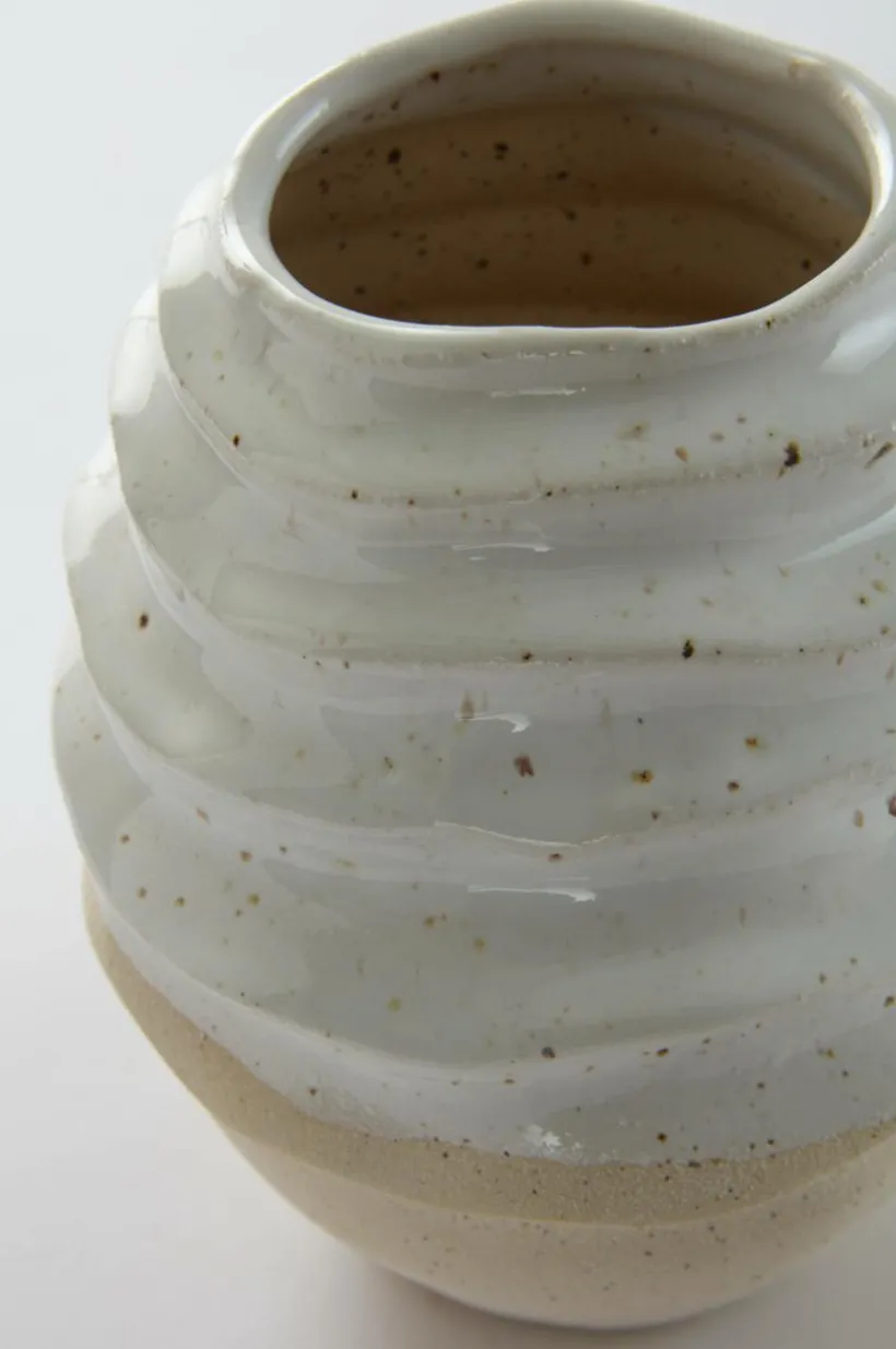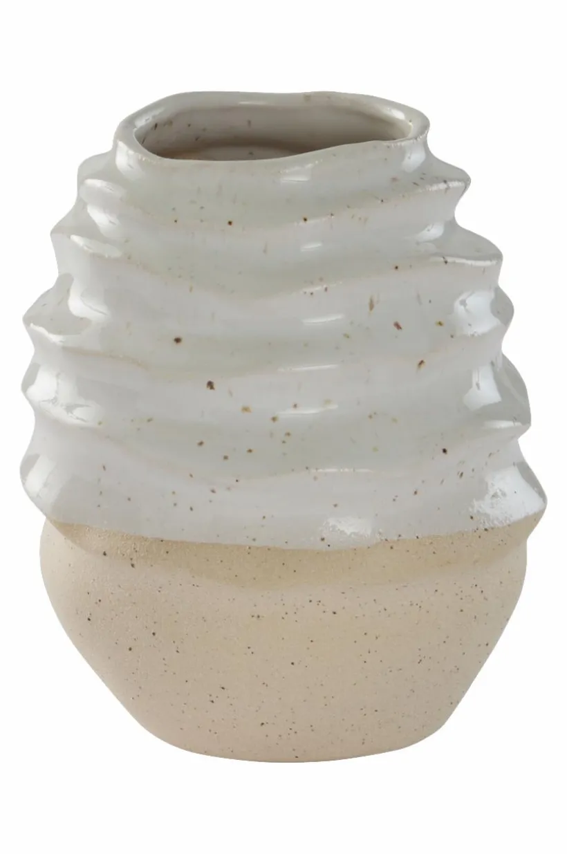 Keramikvas i mjuk och oregelbunden form med delad glasyr. Vasen har glaserats för hand och är melerad i ljus, blank färg upptill, nedtill har den stenfinish. Även insidan är glaserad. Det fina hantverket gör varje vas unik. Keramik kan släppa igenom fukt.