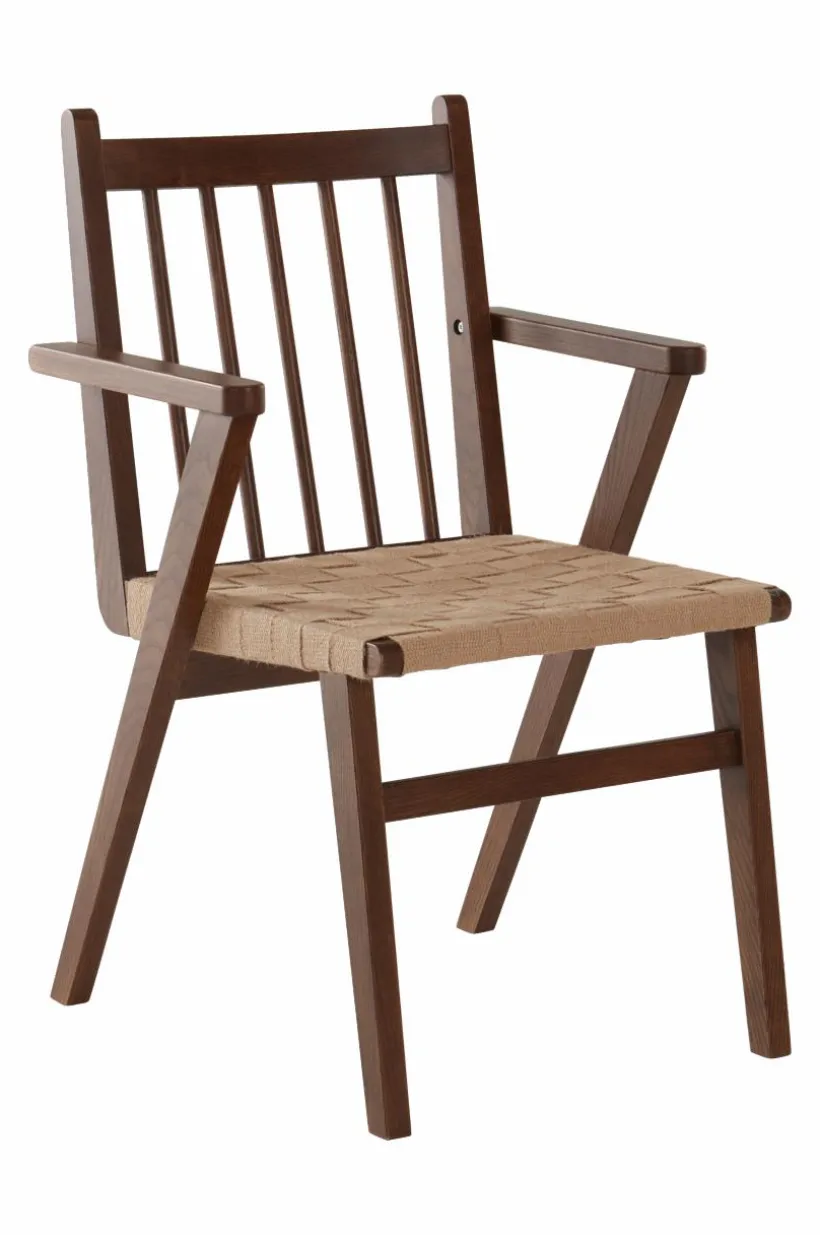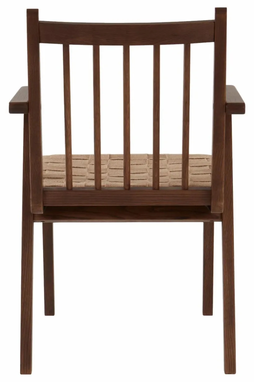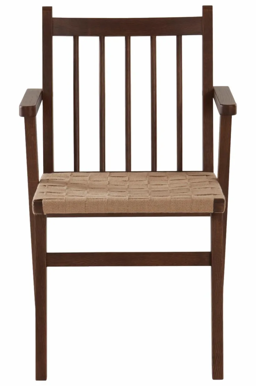 Karmstol av FSC-certifierad ek med flätad sits, sadelgjord av jute. Stolen har försetts med textil under sitsen så att sitsen behåller formen. Stolen är i snygg design med rena linjer i klassisk stil. Eken är målad med vattenbaserad färg i snygg brun kulör.