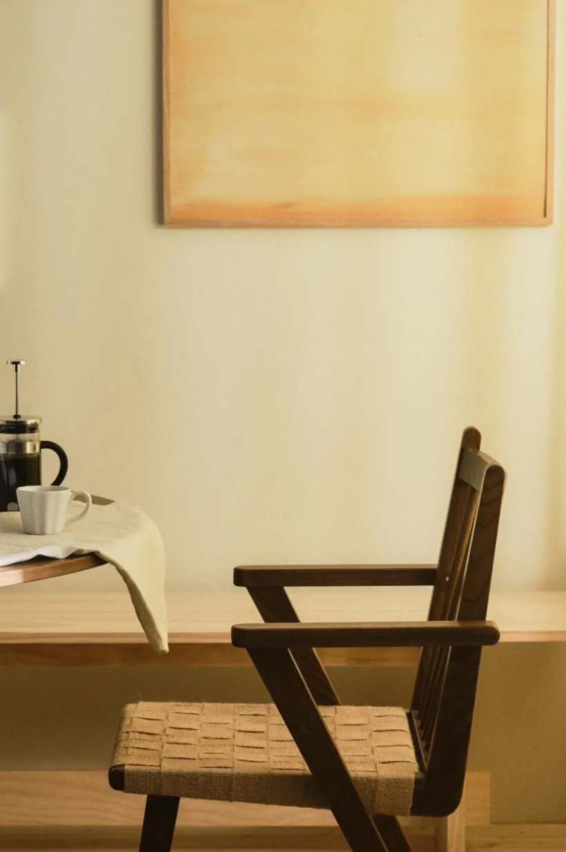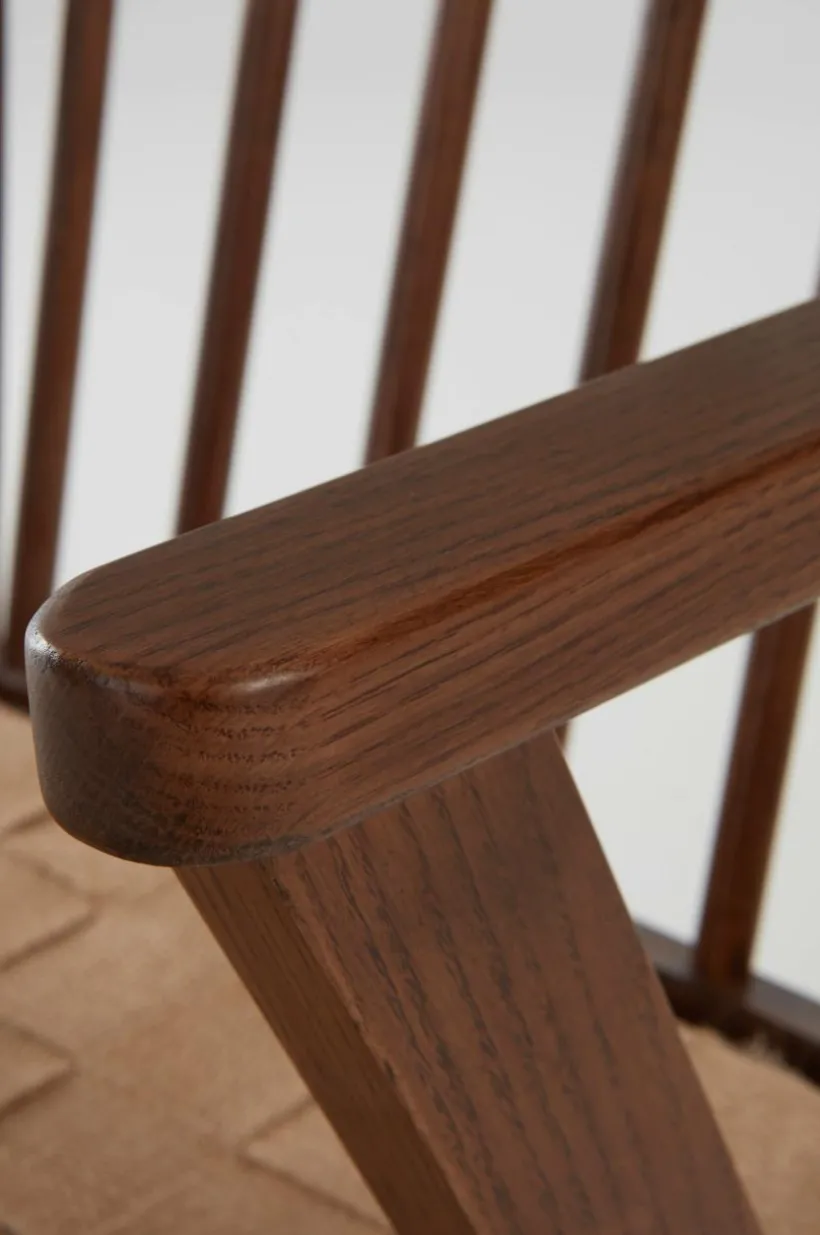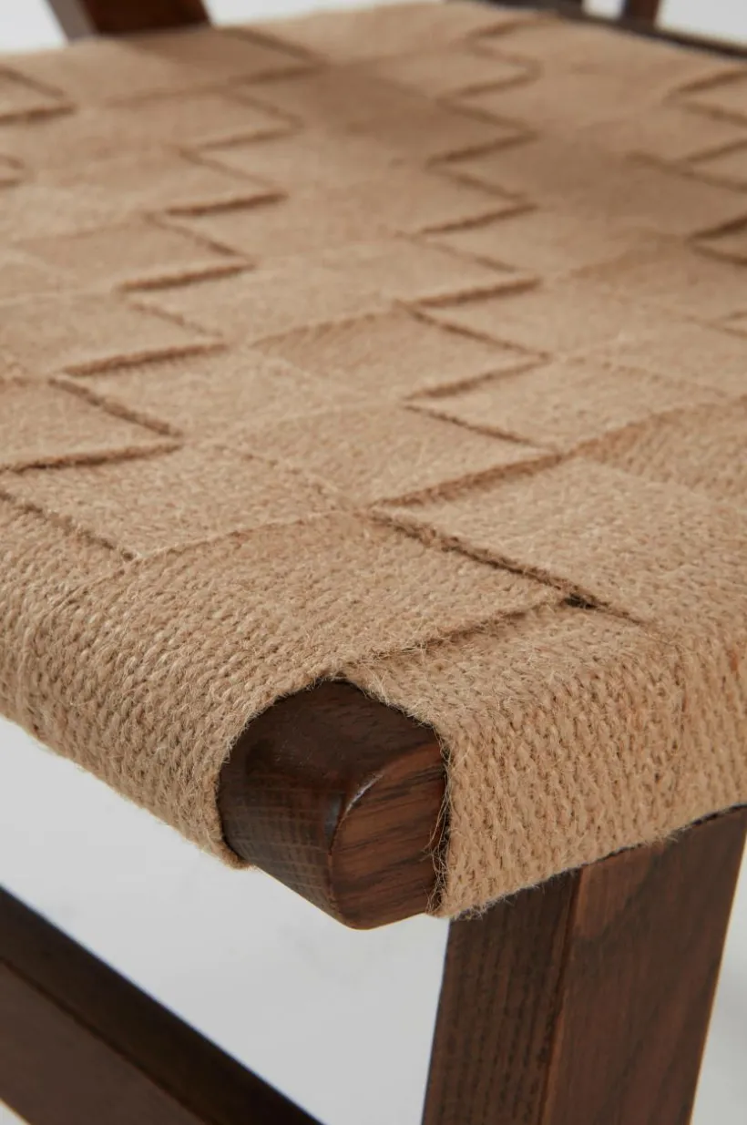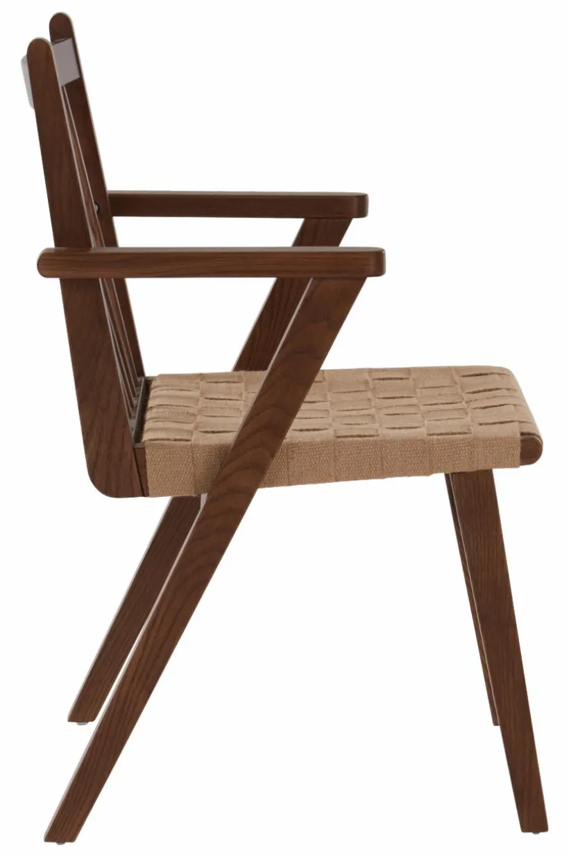 Karmstol av FSC-certifierad ek med flätad sits, sadelgjord av jute. Stolen har försetts med textil under sitsen så att sitsen behåller formen. Stolen är i snygg design med rena linjer i klassisk stil. Eken är målad med vattenbaserad färg i snygg brun kulör.
