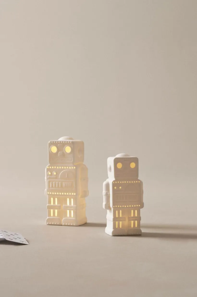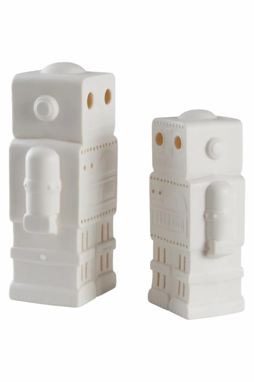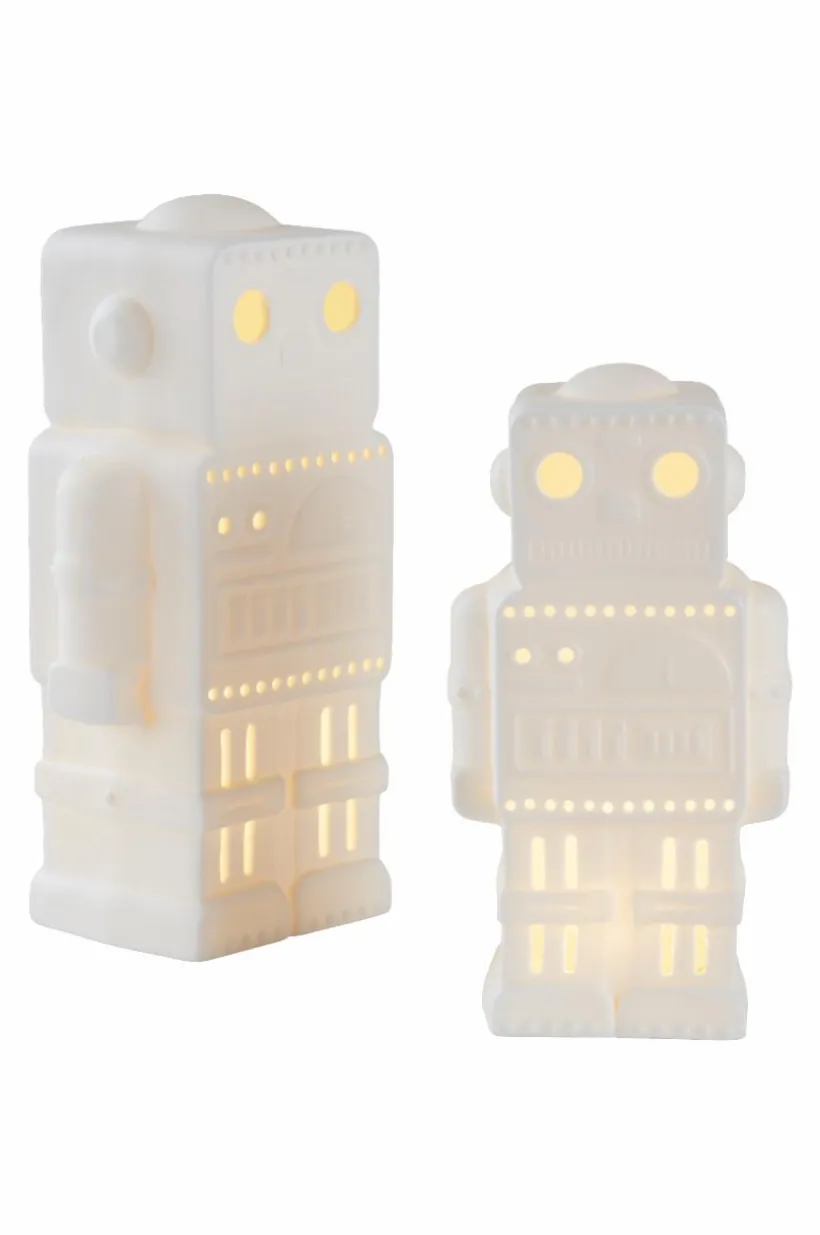 2-pack nattlampor av porslin med LED-belysning. De båda lamporna har formen av en liten robot och de är lätt genomskinliga, så de sprider ett mjukt och mysigt sken. De är perfekta att ha tända på natten, som varsamt ledljus eller för barn som kan känna sig tryggare av att det är lite upplyst runt omkring. Batteridrivna med liten av- och påknapp under lampan.