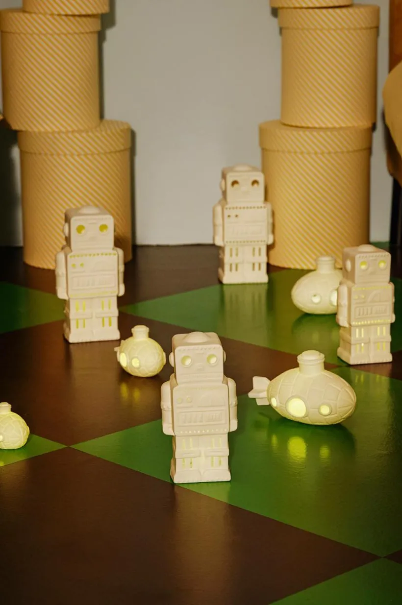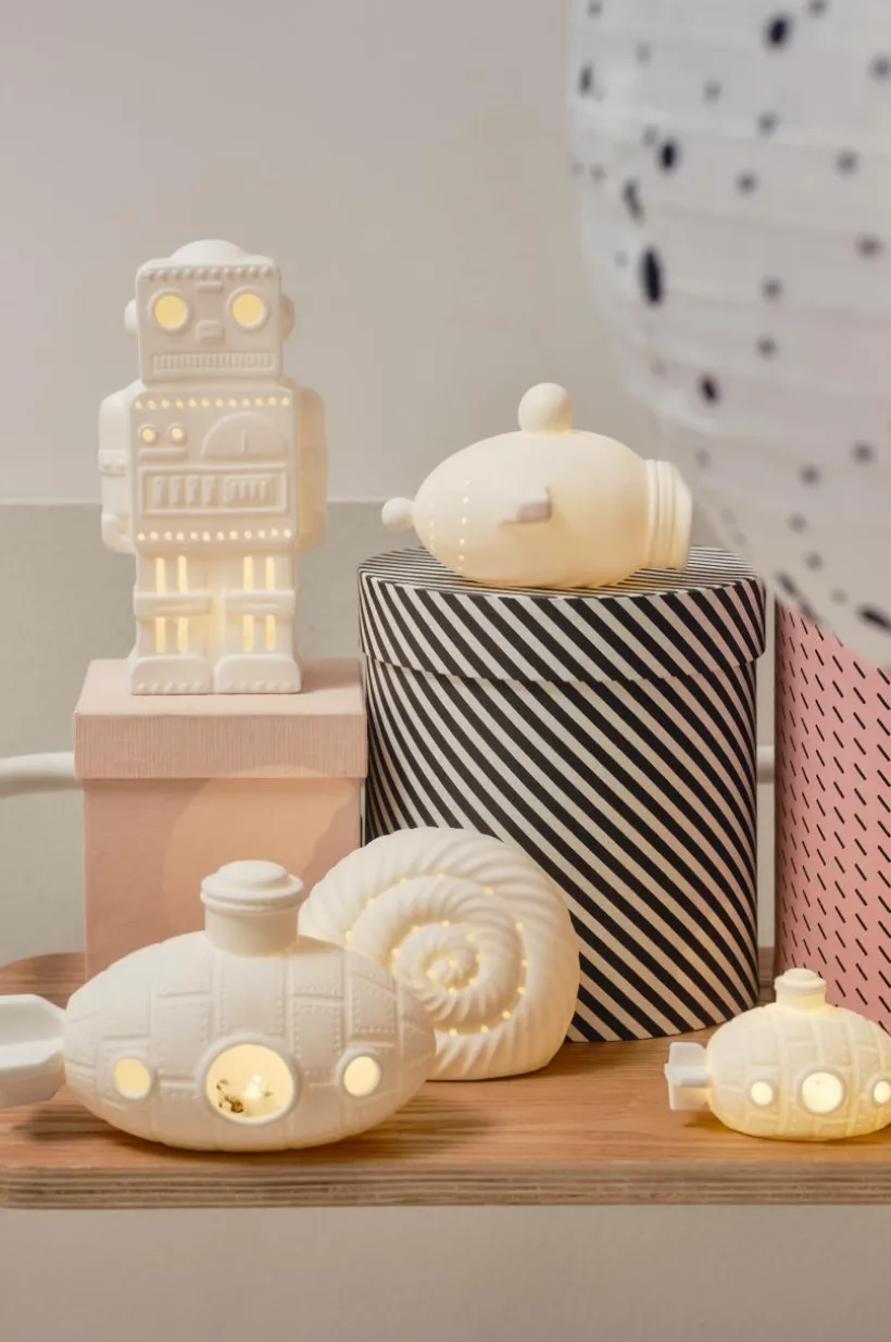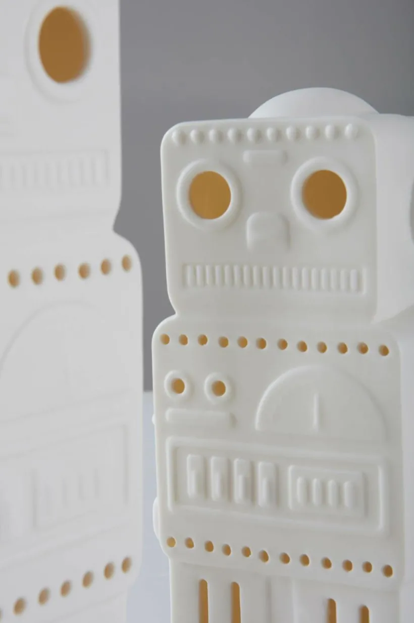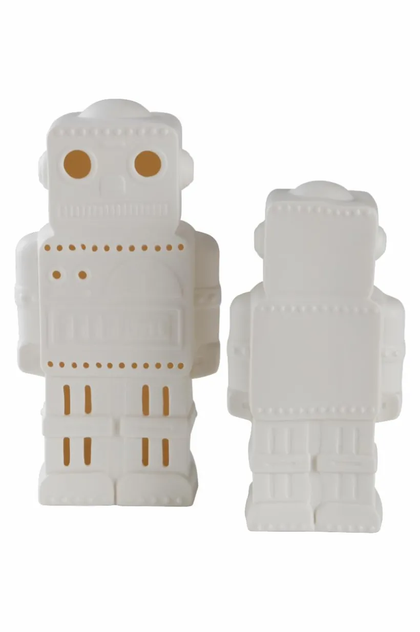 2-pack nattlampor av porslin med LED-belysning. De båda lamporna har formen av en liten robot och de är lätt genomskinliga, så de sprider ett mjukt och mysigt sken. De är perfekta att ha tända på natten, som varsamt ledljus eller för barn som kan känna sig tryggare av att det är lite upplyst runt omkring. Batteridrivna med liten av- och påknapp under lampan.