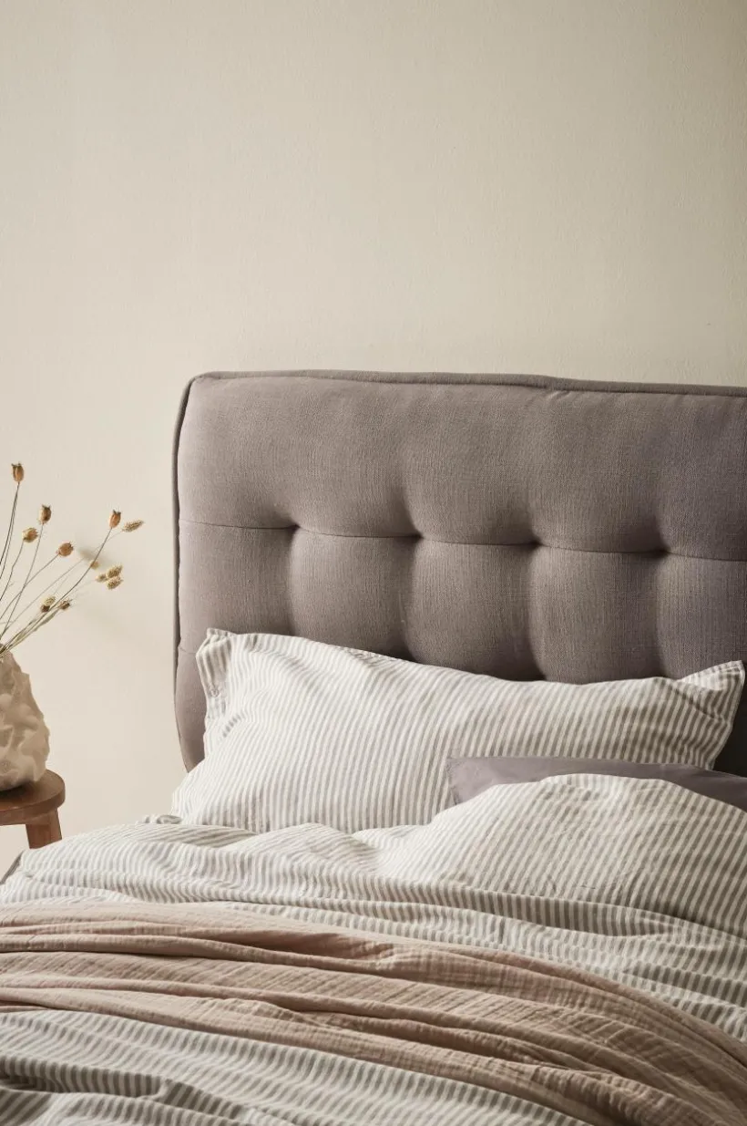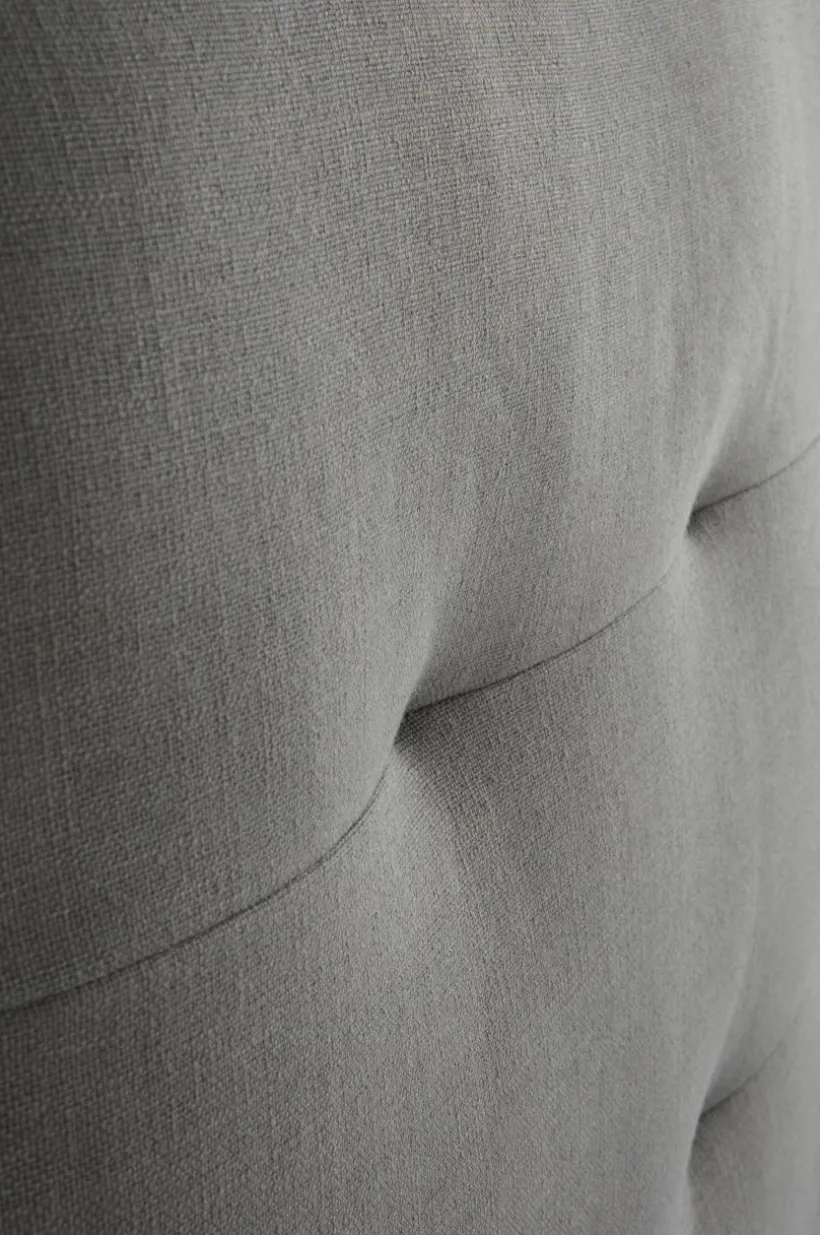 Sänggavel med tyg av lin och polyester som har en skön linnekänsla. Stommen är tillverkad i FSC-certifierat massivt trä och plywood. Den inbjudande sänggaveln har mjuk, tjock vaddering med dekorativa, djuphäftade knappar och en liten vinge runtom. Klädseln är slitstark med Martindale på 30000. ROSARIO blir ett bekvämt ryggstöd om du vill ta morgonkaffet sittandes i sängen. Den fristående sänggaveln placeras mellan resårmadrassen och väggen. Väggfäste medföljer.