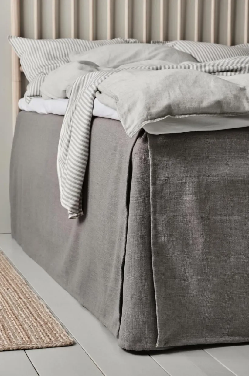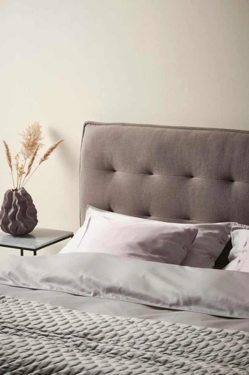 Sänggavel med tyg av lin och polyester som har en skön linnekänsla. Stommen är tillverkad i FSC-certifierat massivt trä och plywood. Den inbjudande sänggaveln har mjuk, tjock vaddering med dekorativa, djuphäftade knappar och en liten vinge runtom. Klädseln är slitstark med Martindale på 30000. ROSARIO blir ett bekvämt ryggstöd om du vill ta morgonkaffet sittandes i sängen. Den fristående sänggaveln placeras mellan resårmadrassen och väggen. Väggfäste medföljer.
