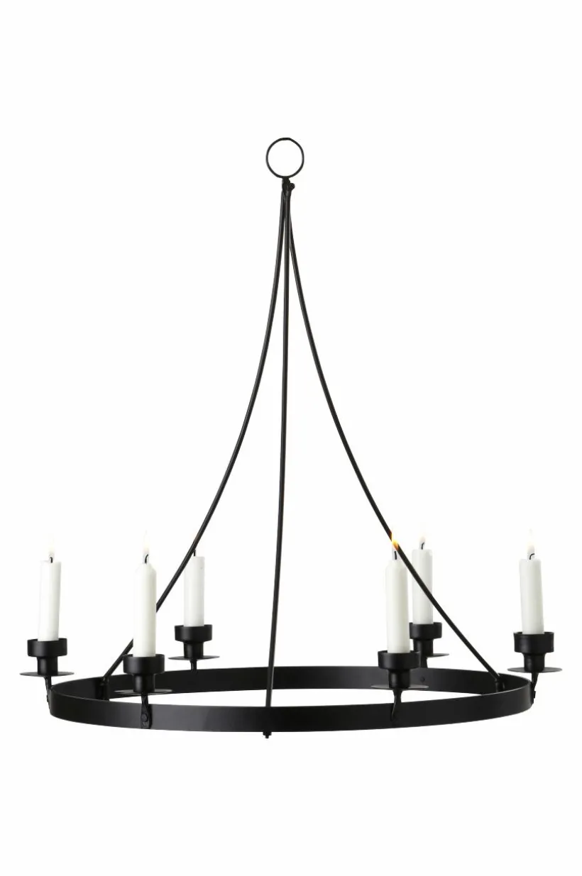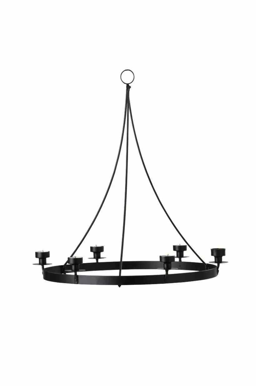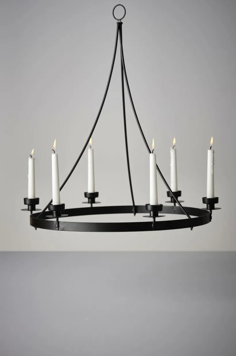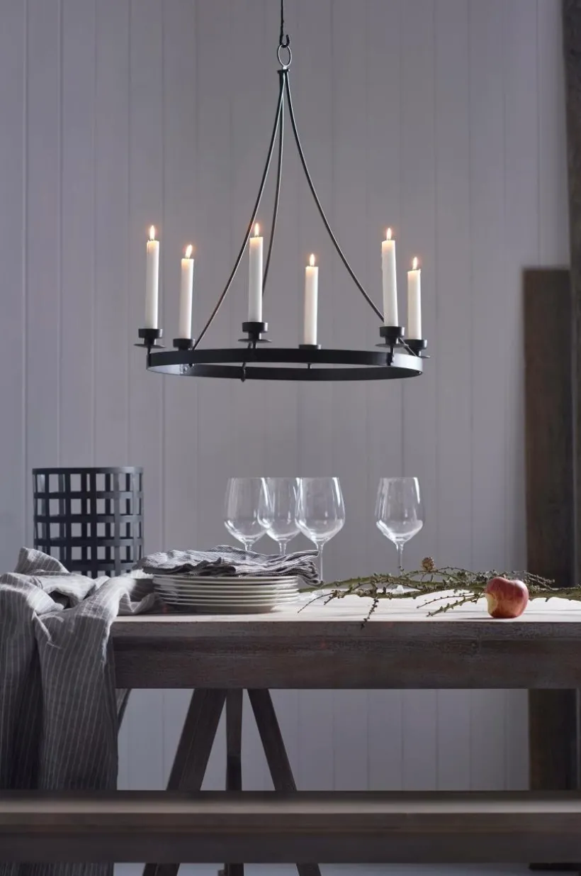 Ljuskrona av pulverlackad metall med 6 st ljushållare för ljus eller värmeljus. En stilren takljuskrona som förgyller din matsalsplats. Med enkla medel blir den extra dekorativ till årets olika middagar, grankvistar till jul, blommor till midsommar eller eukalyptuskvistar som är fina året om.