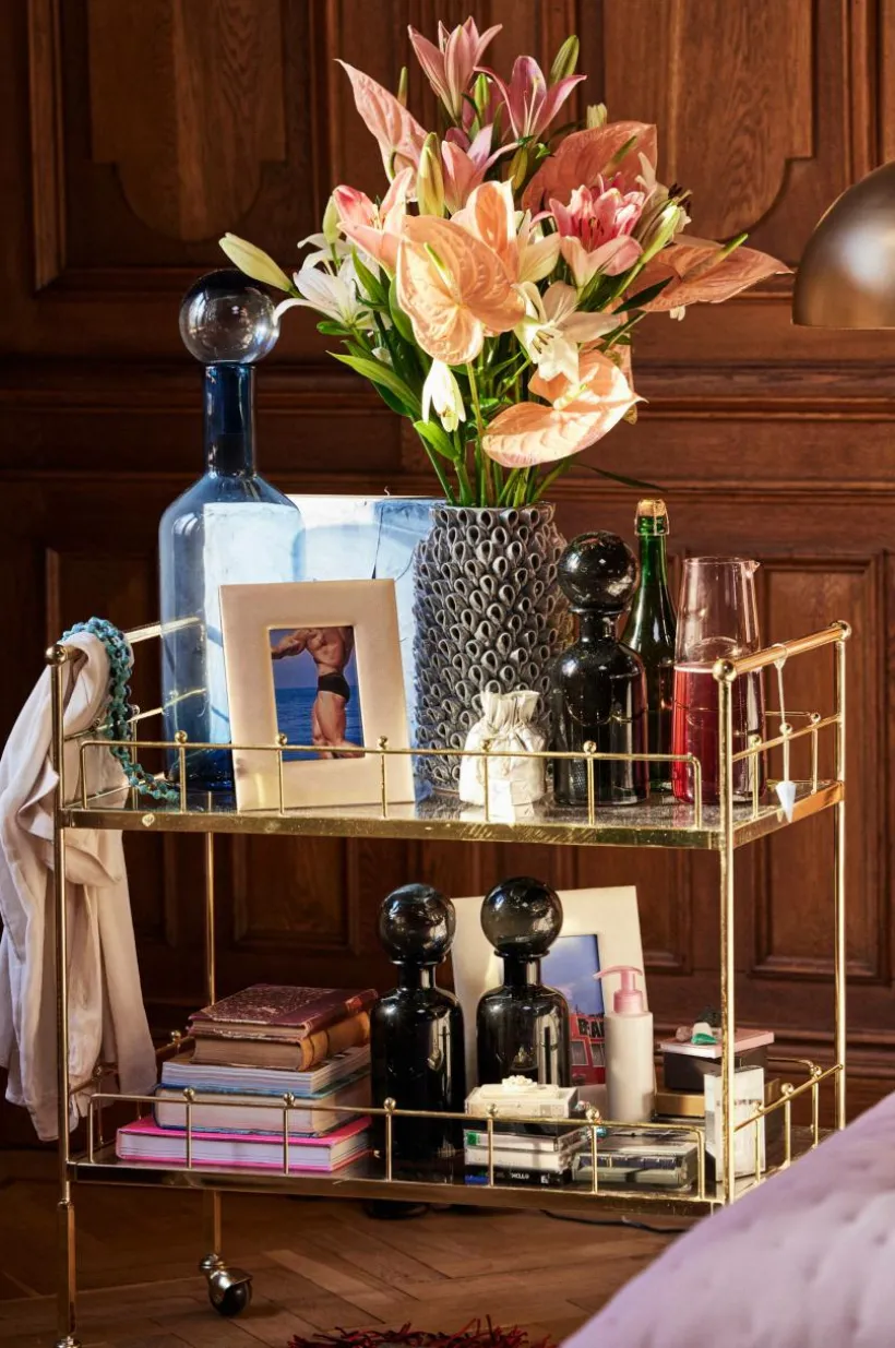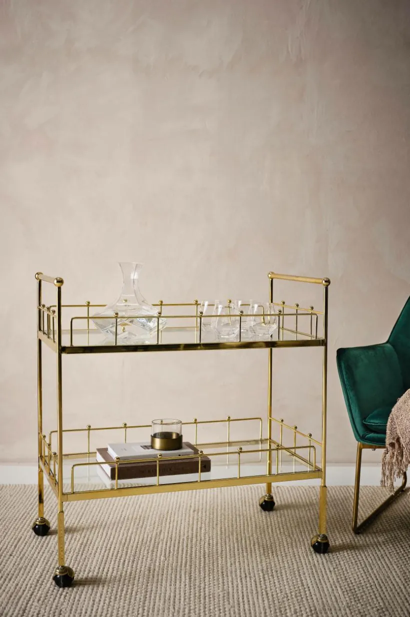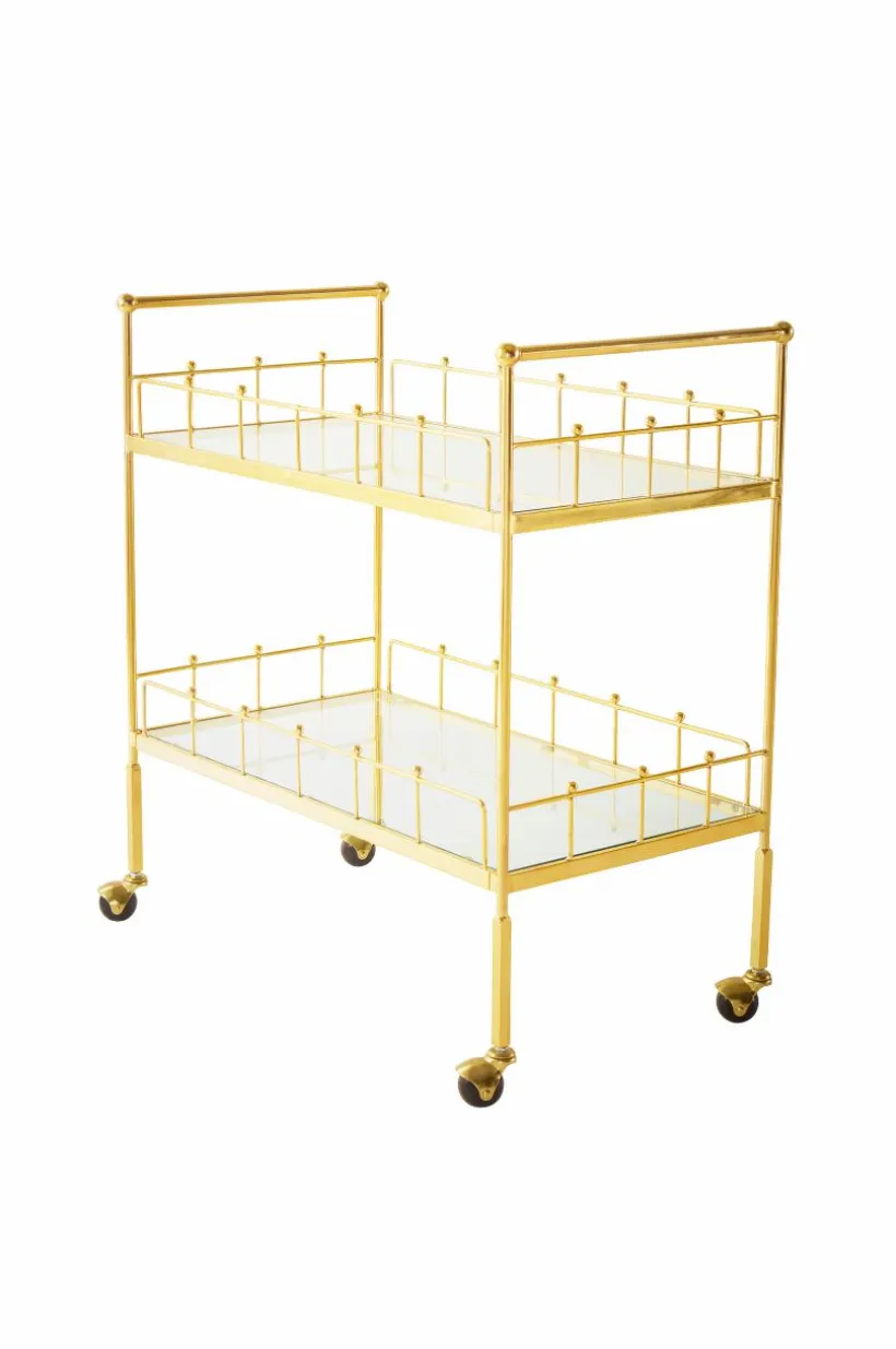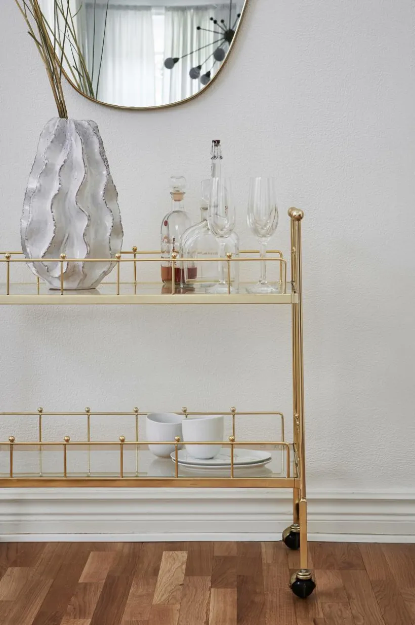 Serveringsvagn på hjul i pläterad metall med hyllplan av glas. Serveringsvagnen förtjänar en renässans i hemmet, en rolig möbel med stor flexibilitet. Du rullar enkelt med dig vagnen och kan ha den som fikabord, avlastningsbord, sidobord, eller barvagn. Den eleganta stilen med glashyllor blir ett glamouröst inslag i din inredning. Viss montering krävs.