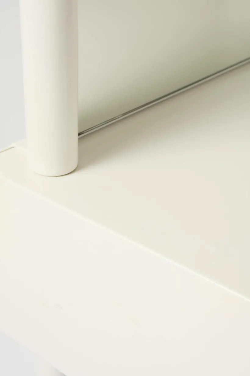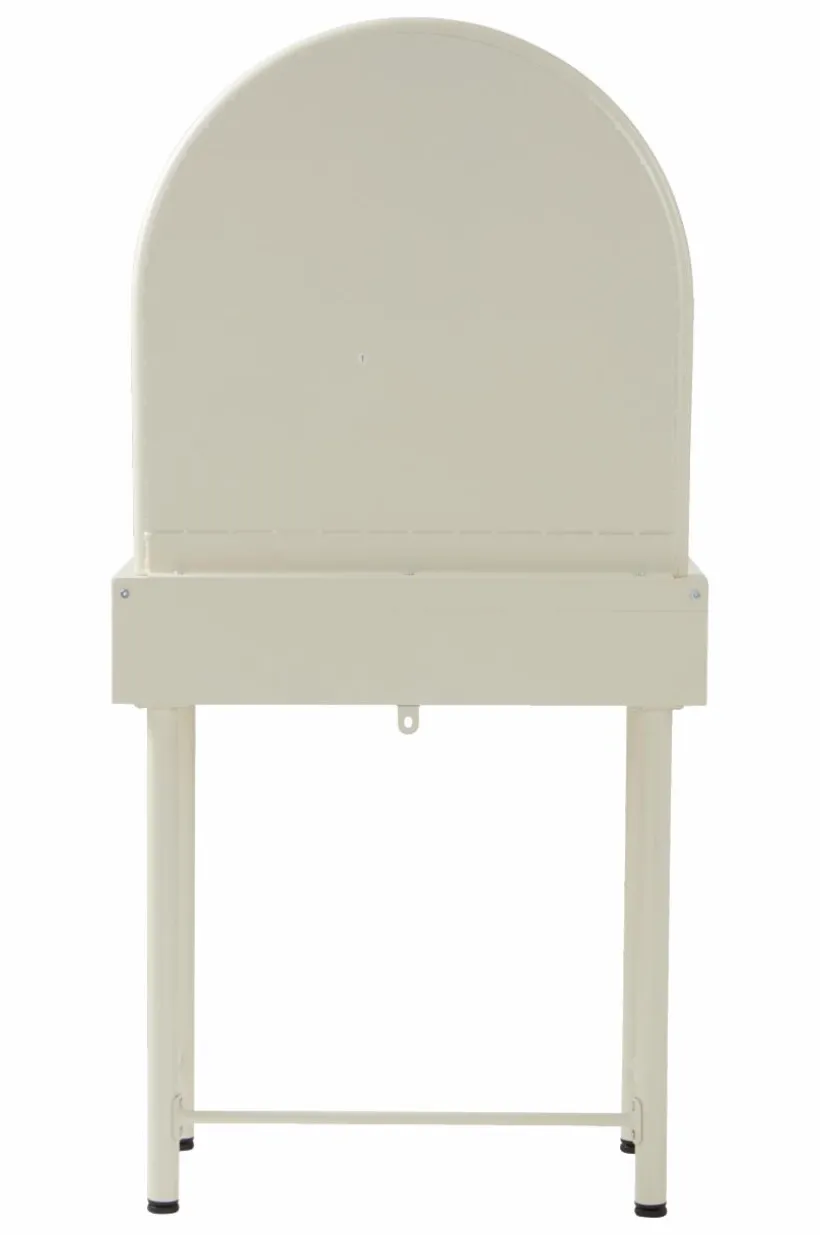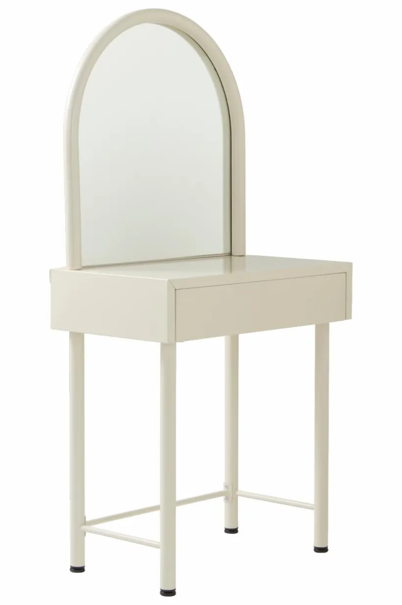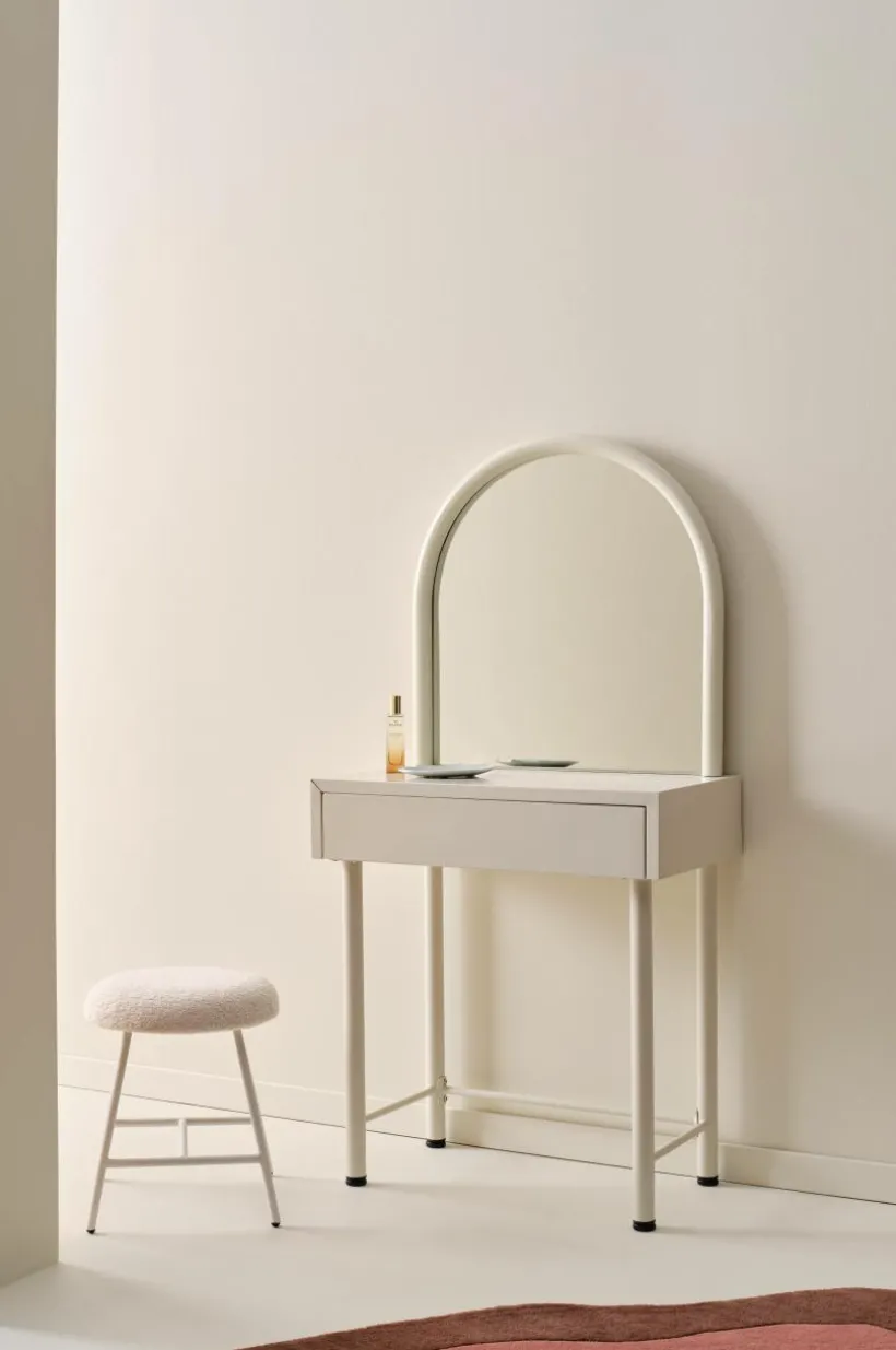 RUE sminkbord är ett charmigt tillskott till alla barnrum och kombinerar stil och funktionalitet. Det har en elegant metallram med en hållbar pulverlackerad yta och en enkel men elegant design. Den integrerade spegeln och den praktiska lådan gör det enkelt att organisera tillbehören. Det här bordet är perfekt för unga modeentusiaster och gör det till en härlig upplevelse att göra sig i ordning på morgonen och ger de dagliga rutinerna en praktisk och elegant känsla.