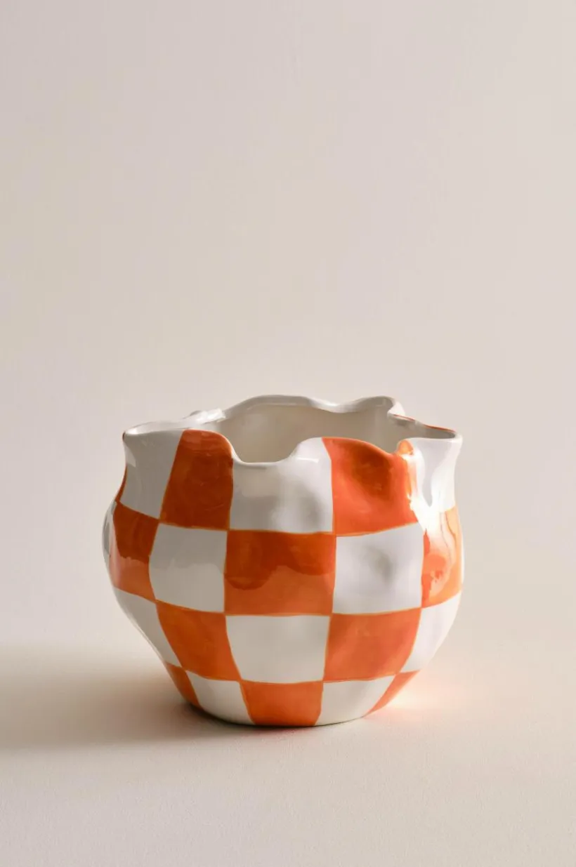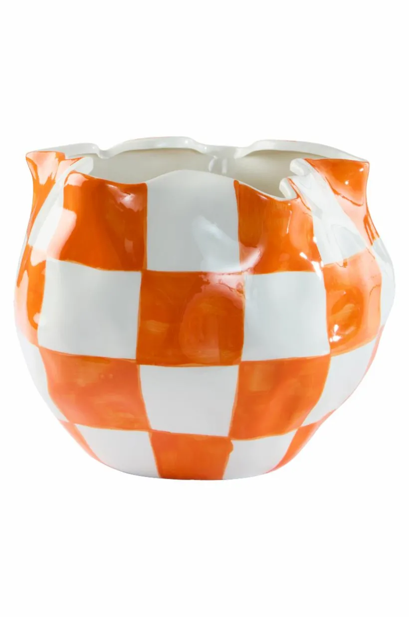 Handgjord kruka av keramik i böljande, asymmetrisk form med svartvitt schackmönster, mönster och form står i skön kontrast. Krukan har blank glasyr och även insidan är glaserad. Det fina hantverket gör varje kruka unik. Tänk på att keramik kan släppa igenom fukt.