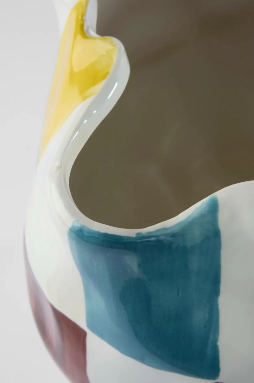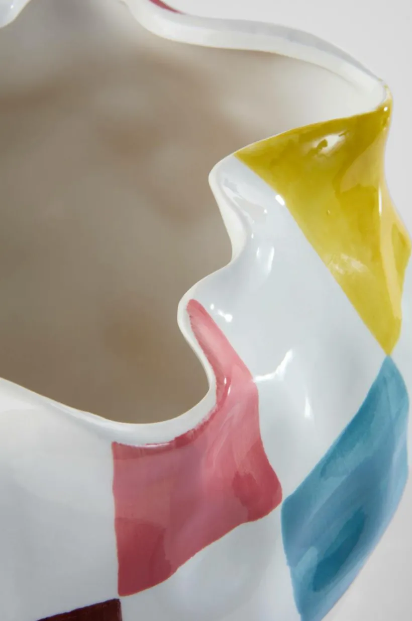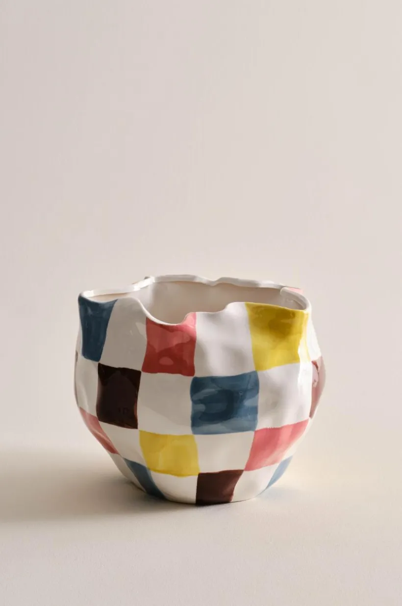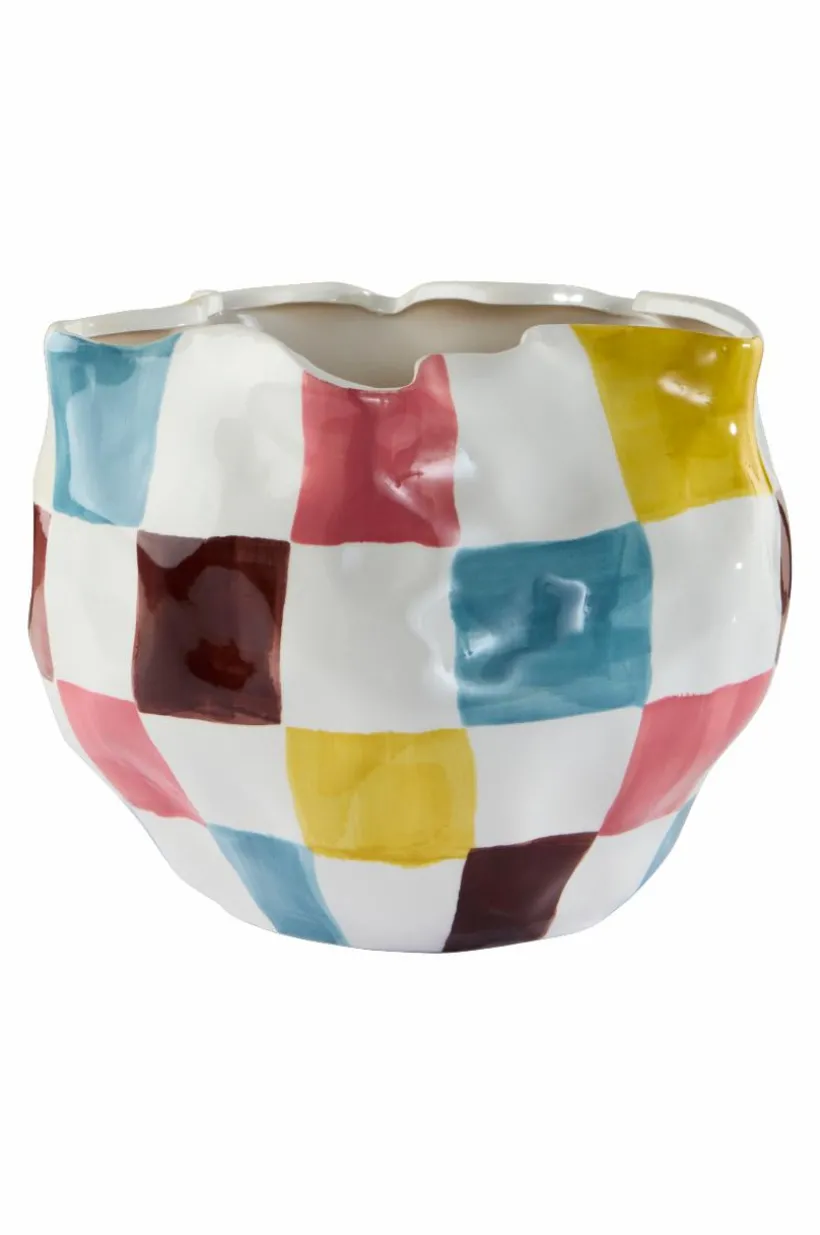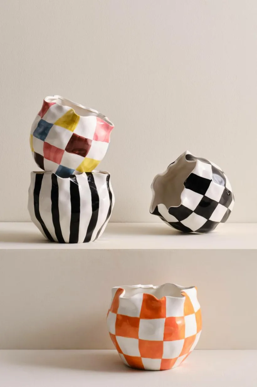 Handgjord kruka av keramik i böljande, asymmetrisk form med svartvitt schackmönster, mönster och form står i skön kontrast. Krukan har blank glasyr och även insidan är glaserad. Det fina hantverket gör varje kruka unik. Tänk på att keramik kan släppa igenom fukt.