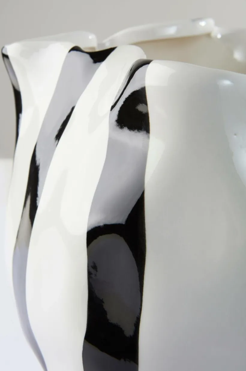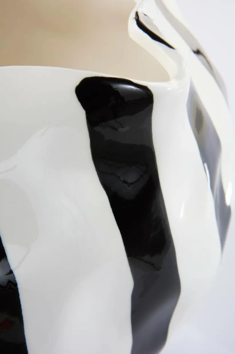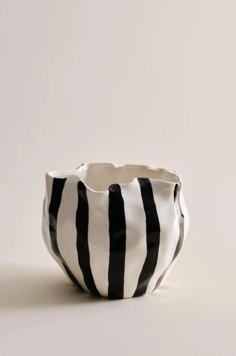 Handgjord keramikkruka i böljande, asymmetrisk form med randigt mönster, mönster och form står i fin kontrast till varandra. Krukan har en blank glasyr och även insidan är glaserad. RUTAN STRIP är vacker som dekoration även utan en växt.