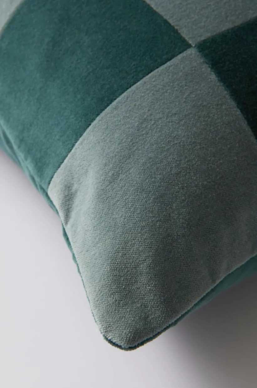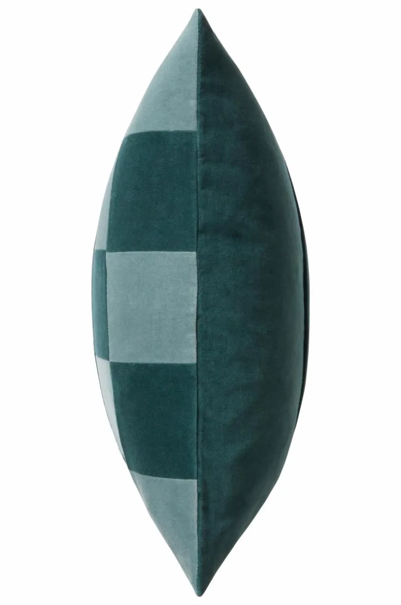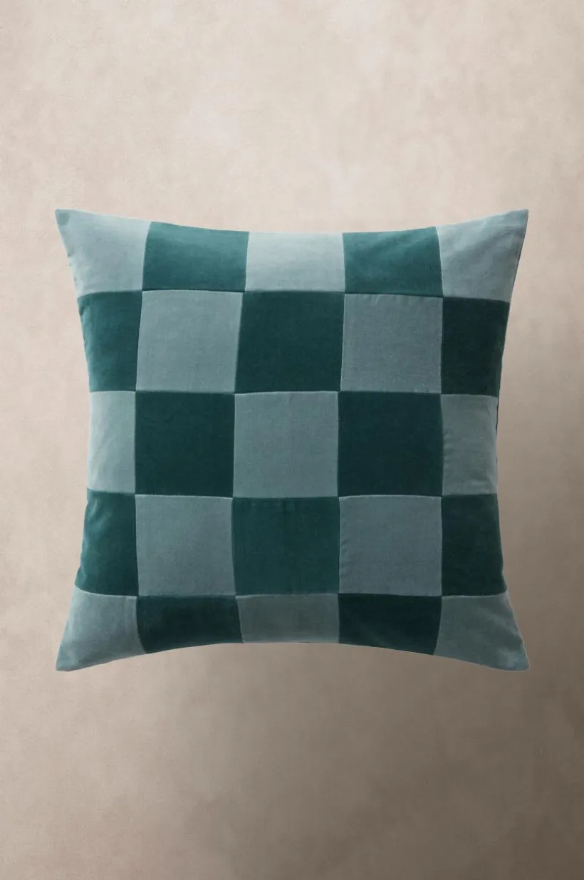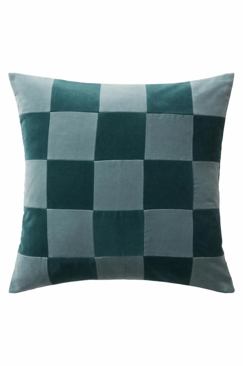 1-pack kuddfodral i mjuk sammet av bomull med matt yta. Framsidan på kuddfodralet är sytt i lapptäcksteknik och schackrutorna är i väl valda nyanser. Sammetstyget har fin lyster och rutorna skimrar i vackra nyanser med ljuset, tyget är tvättat för extra mjuk känsla. Baksidan är enfärgad i en av rutornas kulör. Dold dragkedja på baksidan. Kuddfodralet är fodrat med mikrofiber av polyester. Tygets gramvikt 230 g/m².