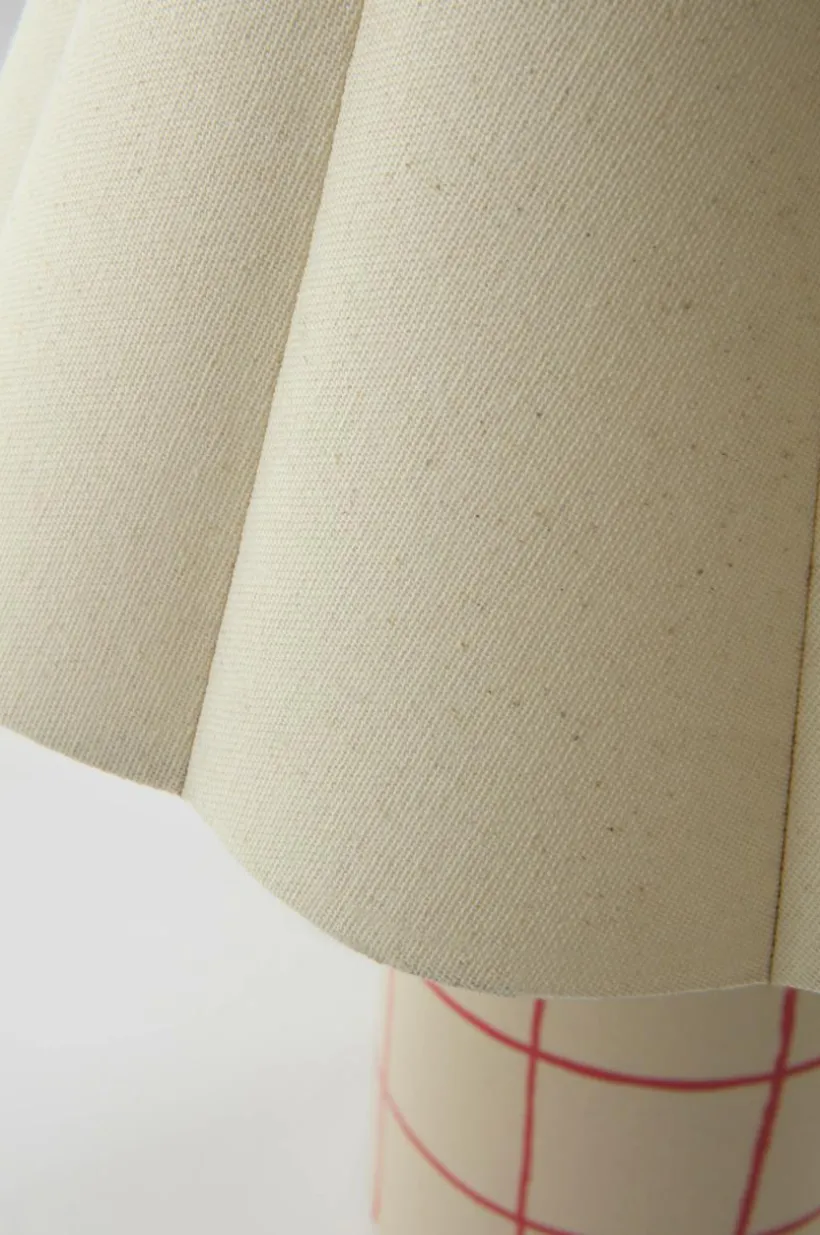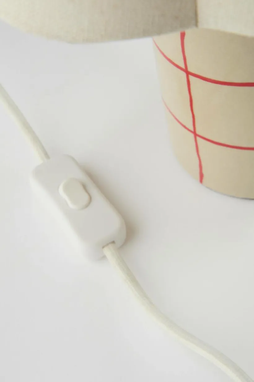 Bordslampa. RUTHIE har en naturfärgad linneskärm och en keramikfot med röda linjer. En vit textilkabel med en strömbrytare fulländar den eleganta designen, perfekt för många olika inredningar.