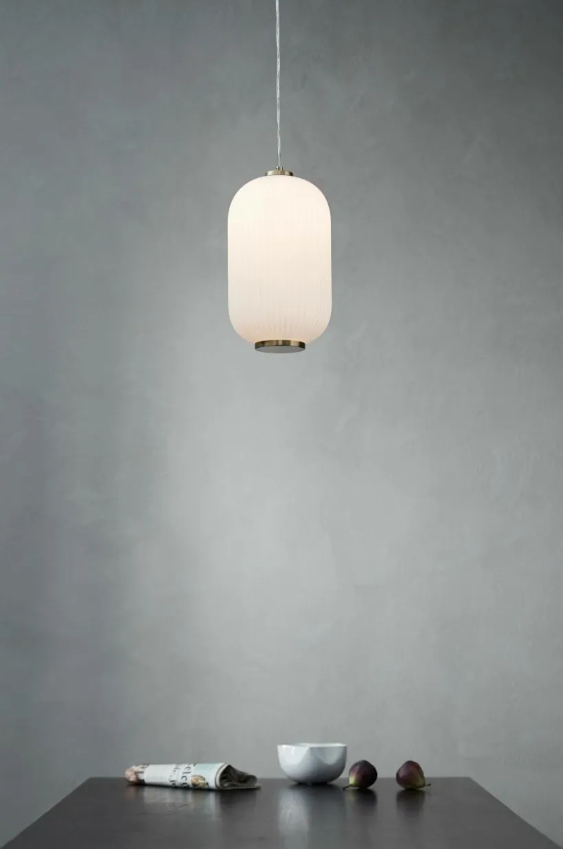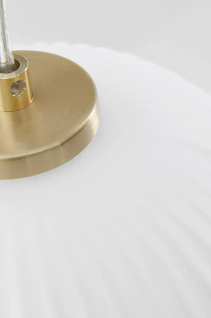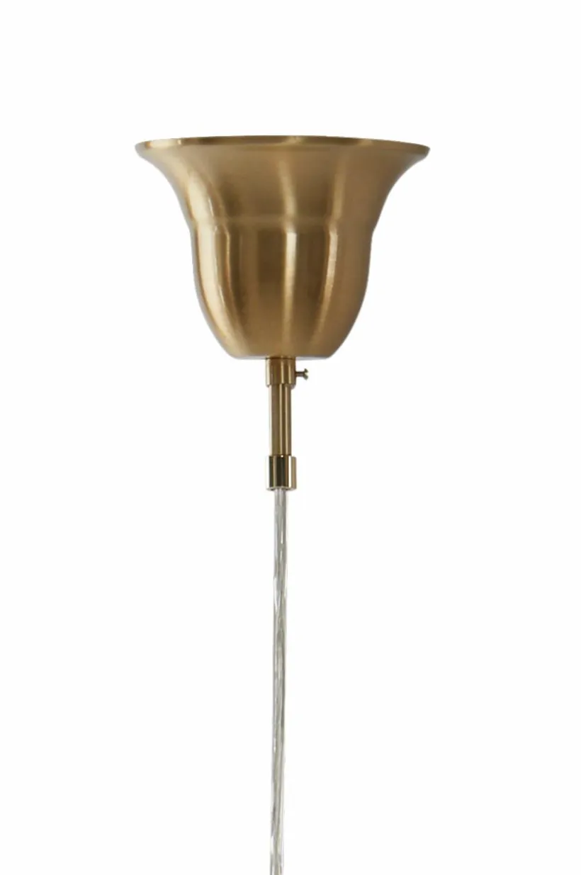 Taklampa av borstad mässing med kupa i vitt glas med vågformad struktur. Lampan har en klassisk och tidlös utstrålning och är mycket lättplacerad. Transparent sladd, sladdlängd 1,1 m.