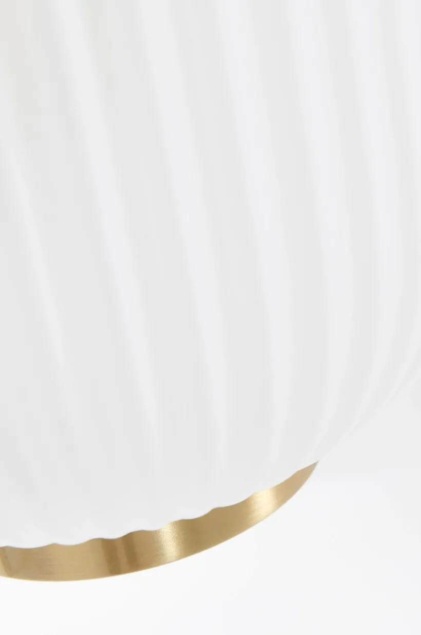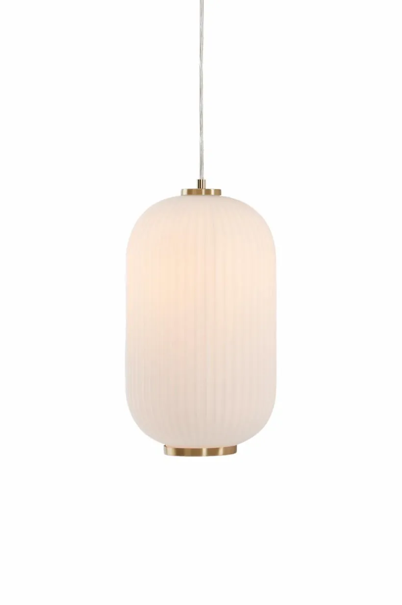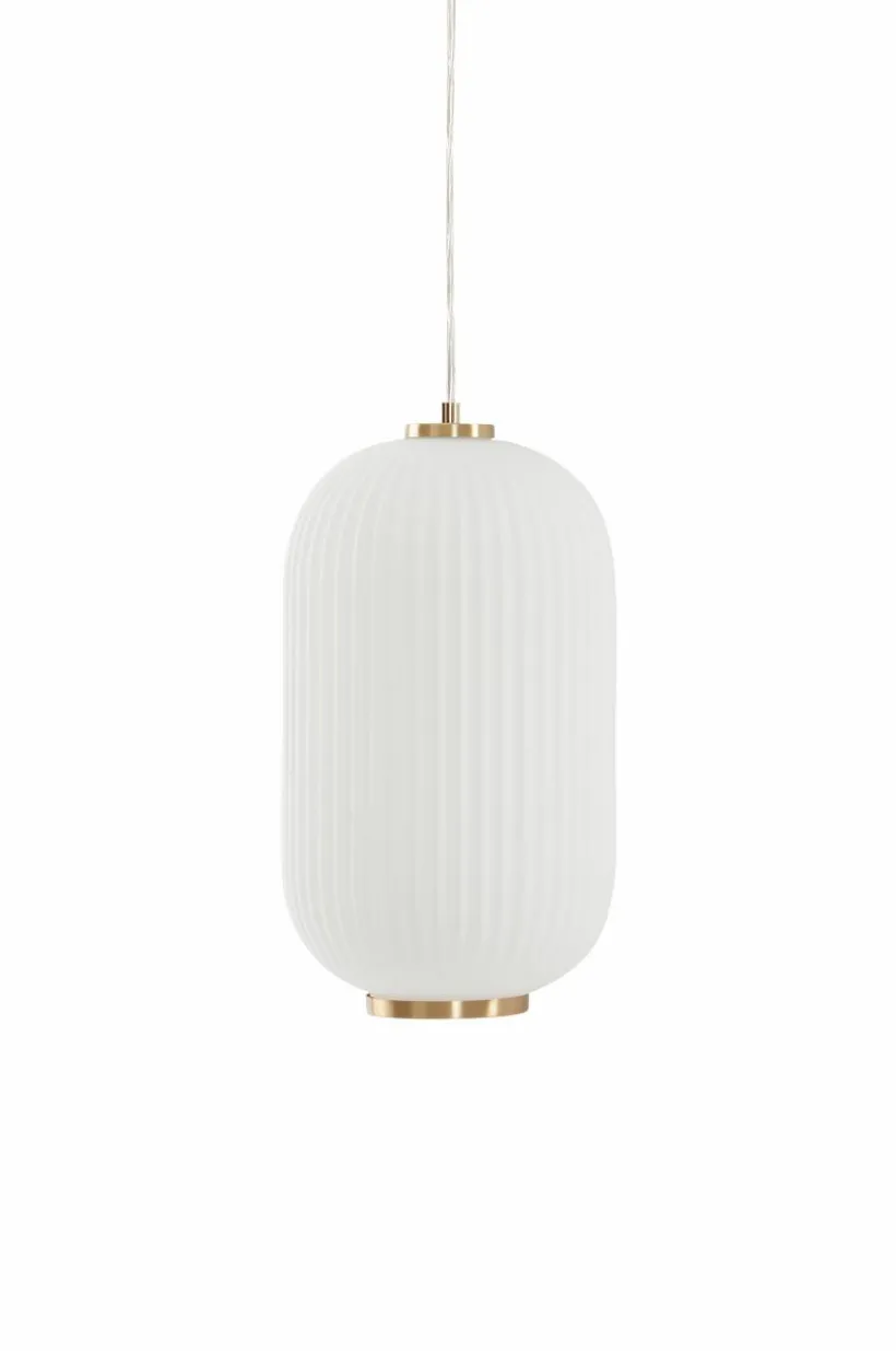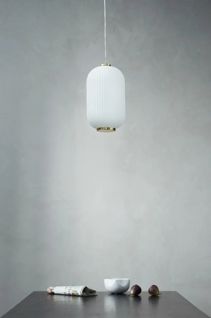 Taklampa av borstad mässing med kupa i vitt glas med vågformad struktur. Lampan har en klassisk och tidlös utstrålning och är mycket lättplacerad. Transparent sladd, sladdlängd 1,1 m.