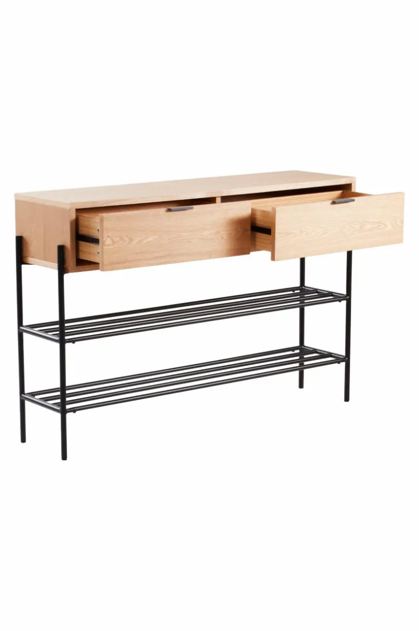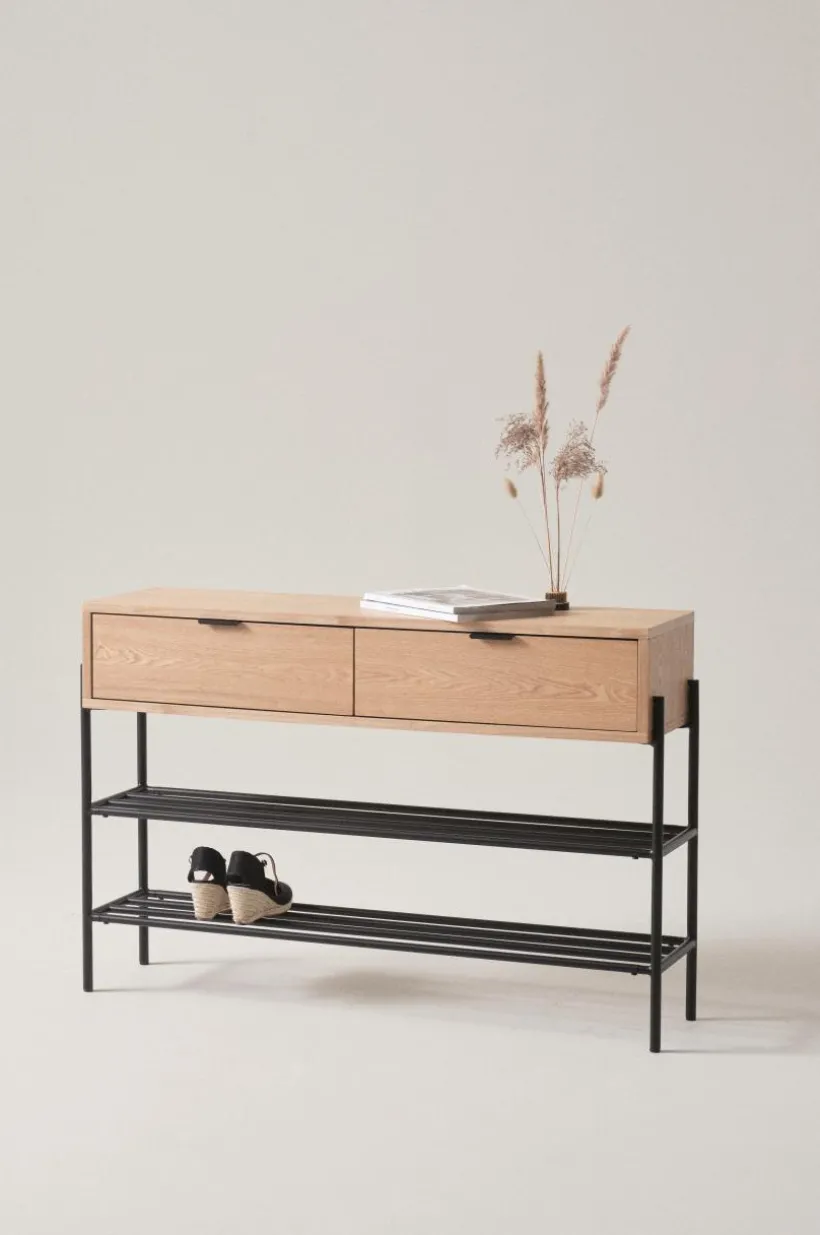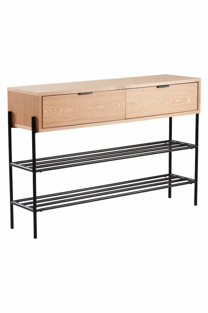 Hallmöbel i askfaner, en praktisk kombination av byrå och skohylla, som spar utrymme. Benen och de två skohyllorna är i stål med matt pulverlack. Den övre låddelen är i MDF med askfaner. De två lådorna har ett diskret, ursågat grepp vardera, så de blir enkla att öppna utan knoppar som sticker ut. Det kan vara tacksamt om hallen är liten. Detta är en praktisk, platsbesparande och snygg hallmöbel med lådor för nycklar, mobiler, vantar och annat nödvändigt samtidigt som skorna står prydligt under. Viss montering krävs. Monteringsanvisning medföljer. Skruvar ingår.