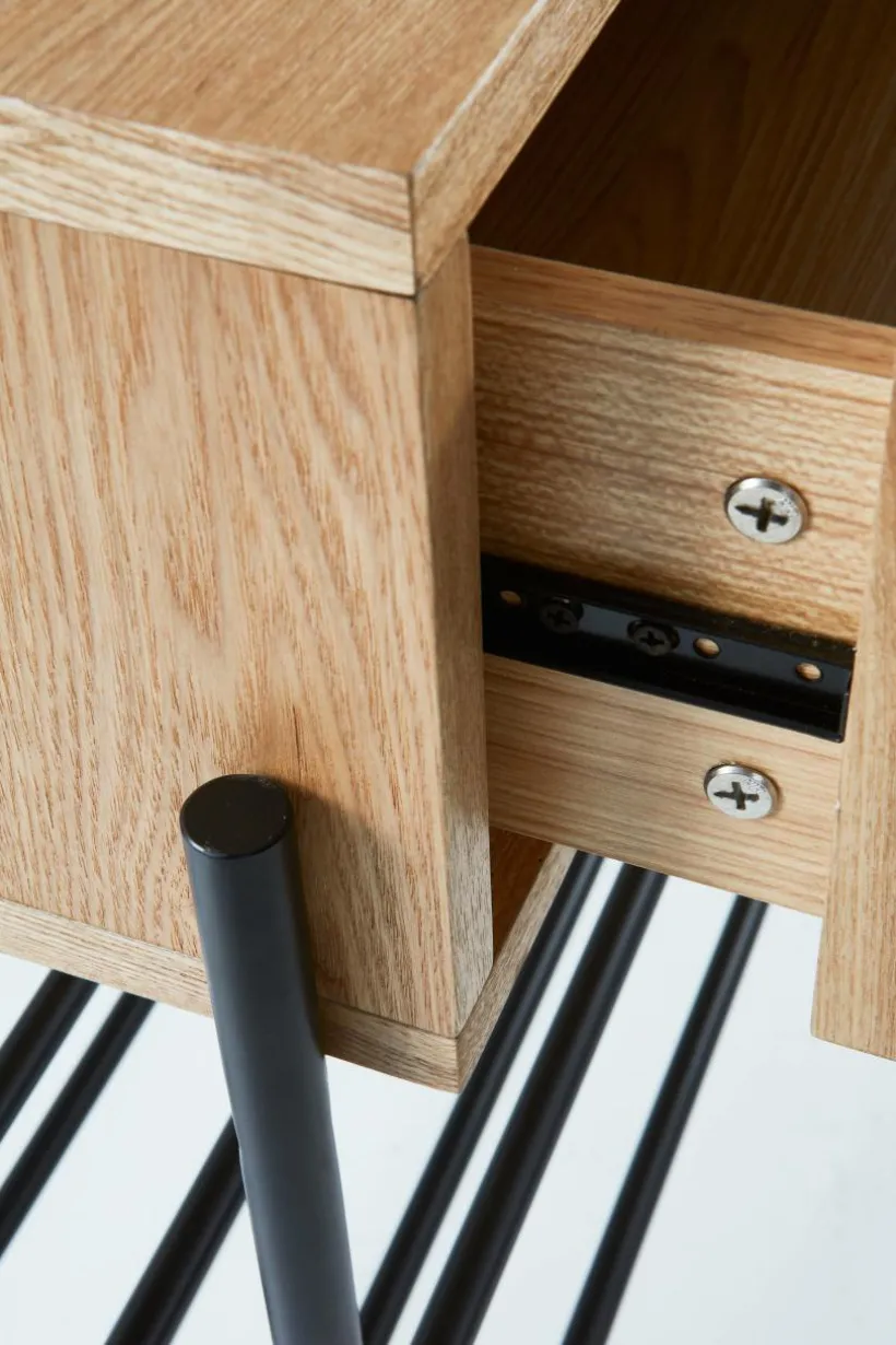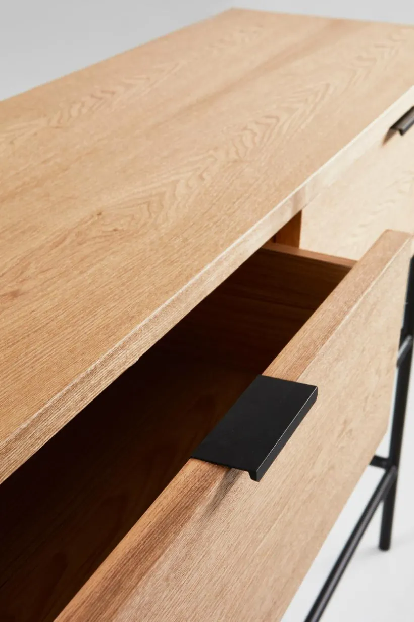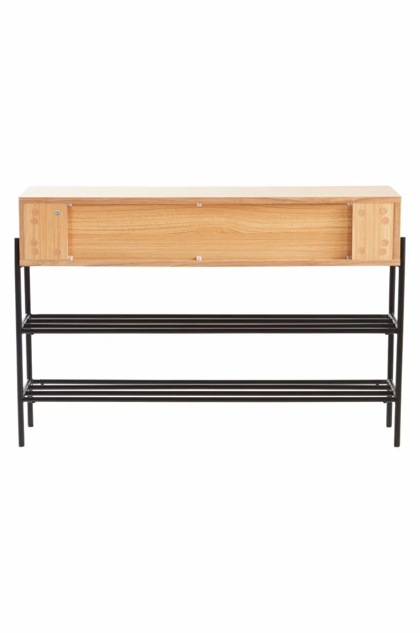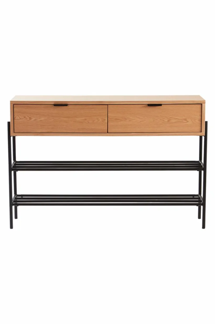 Hallmöbel i askfaner, en praktisk kombination av byrå och skohylla, som spar utrymme. Benen och de två skohyllorna är i stål med matt pulverlack. Den övre låddelen är i MDF med askfaner. De två lådorna har ett diskret, ursågat grepp vardera, så de blir enkla att öppna utan knoppar som sticker ut. Det kan vara tacksamt om hallen är liten. Detta är en praktisk, platsbesparande och snygg hallmöbel med lådor för nycklar, mobiler, vantar och annat nödvändigt samtidigt som skorna står prydligt under. Viss montering krävs. Monteringsanvisning medföljer. Skruvar ingår.