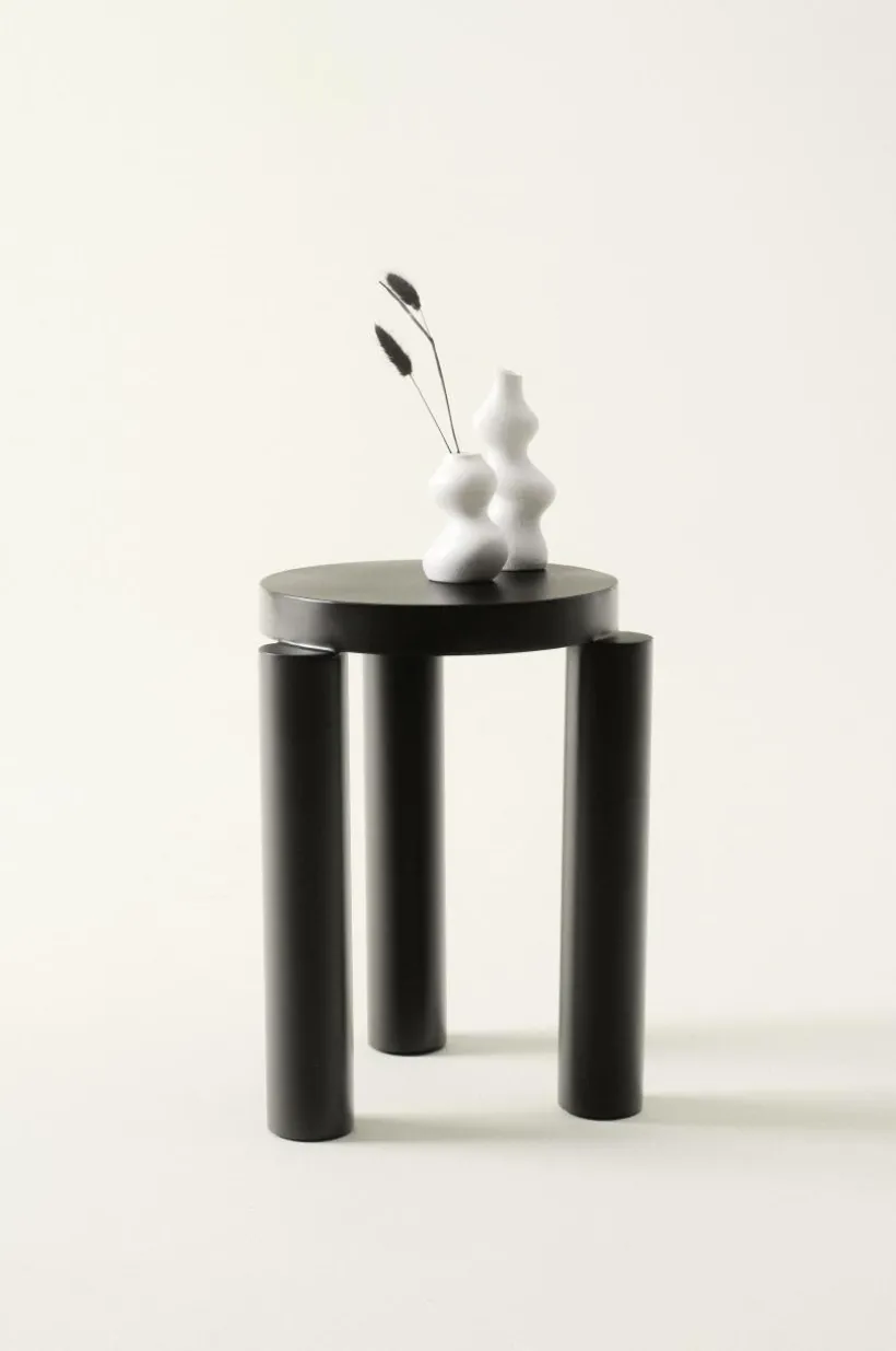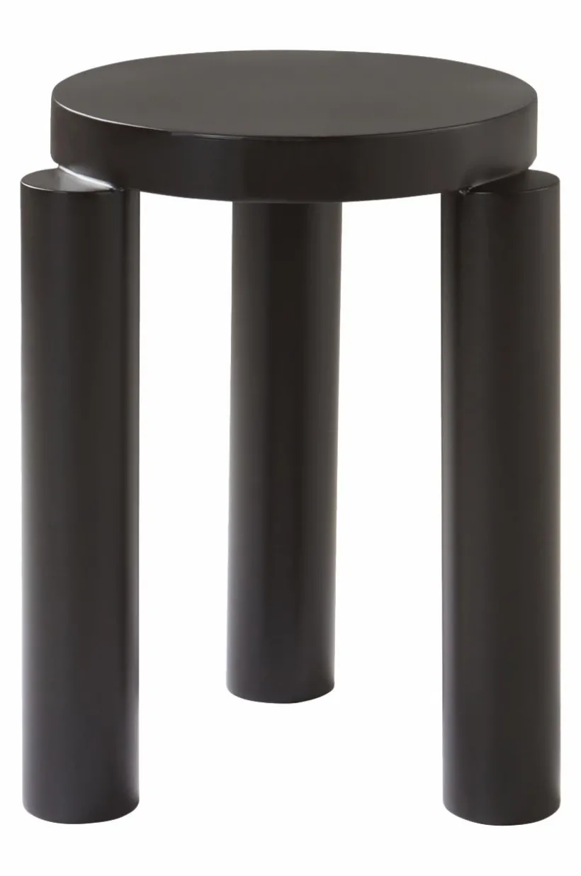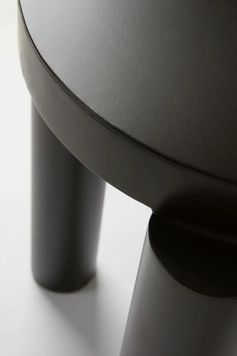Runt sidobord i trebent modell av järn. De runda benen är halvt utanpåliggande, så de sticker utanför själva bordsskivan. Sidobordet är helt enfärgat och pulverlackerat med matt färg.