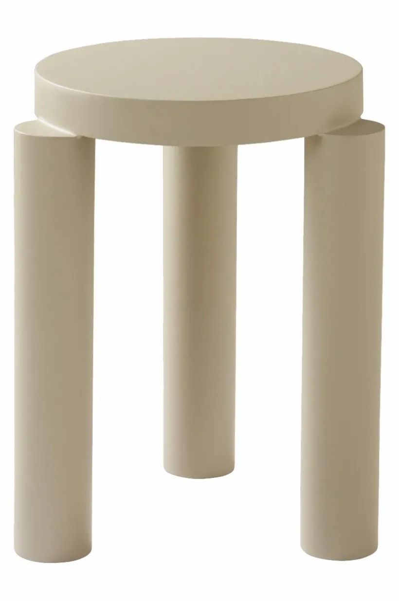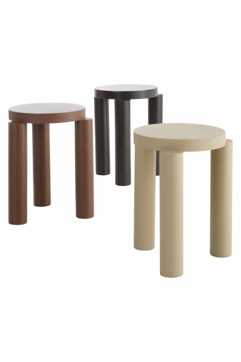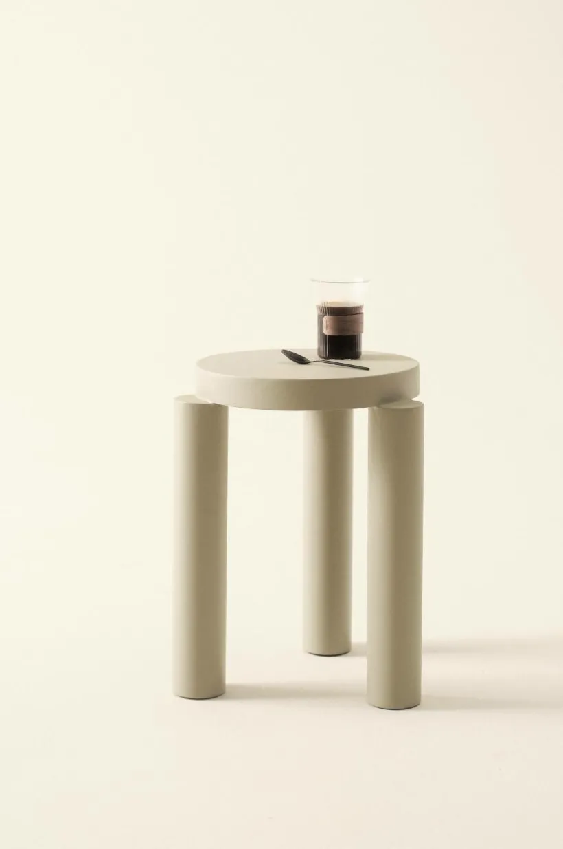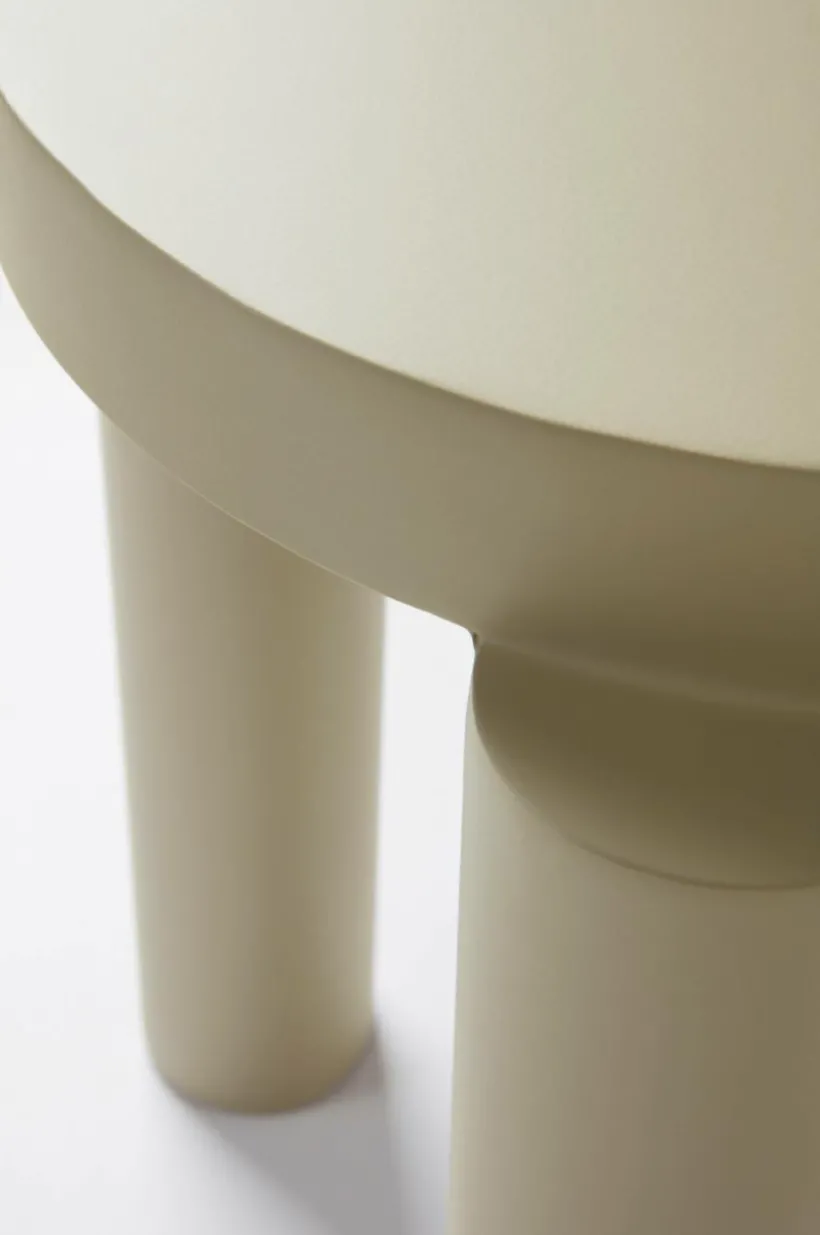 Runt sidobord i trebent modell av järn. De runda benen är halvt utanpåliggande, så de sticker utanför själva bordsskivan. Sidobordet är helt enfärgat och pulverlackerat med matt färg.