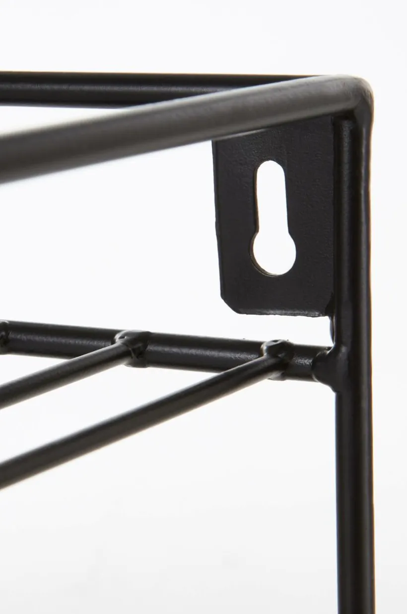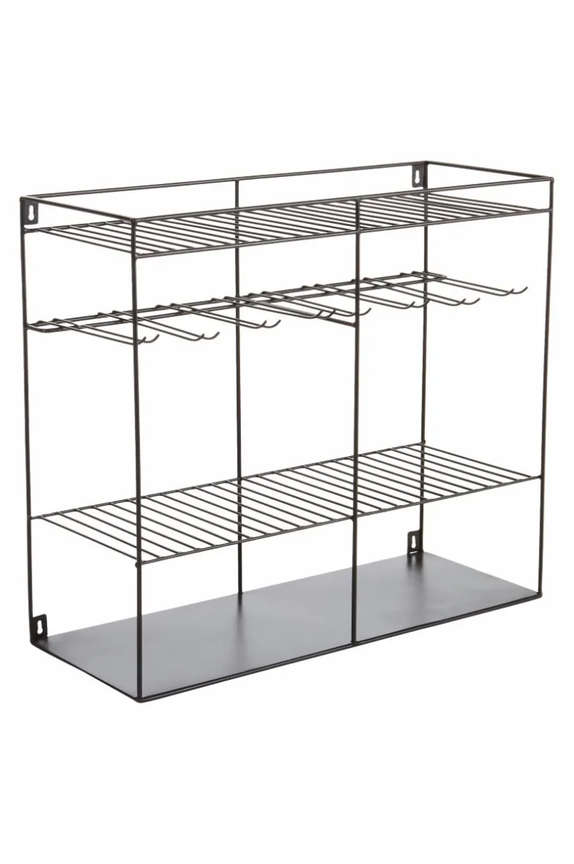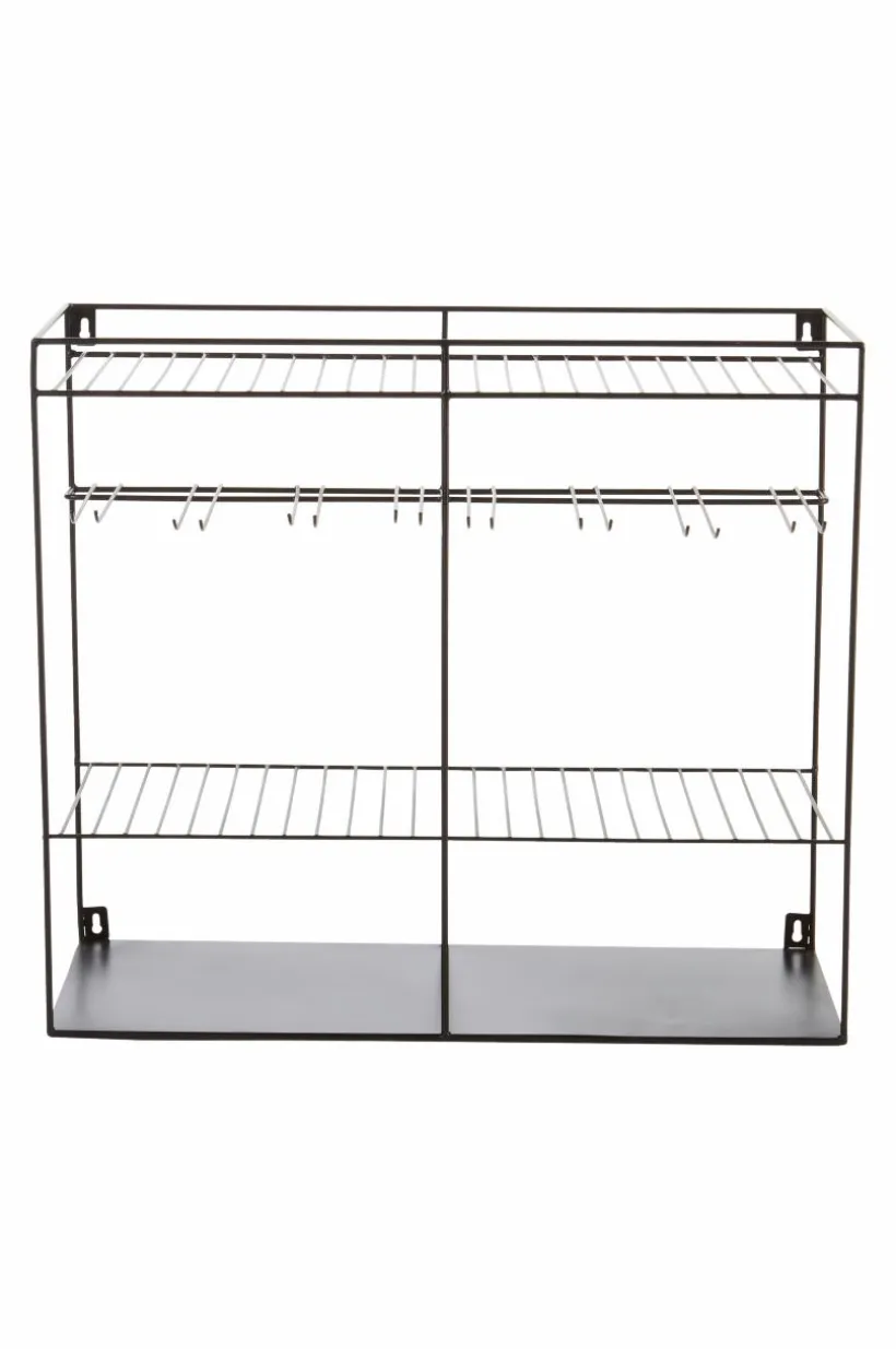 Handgjord vägghylla av järn, en hylla som ger dig extra förvaring i köket på på ett snyggt sätt. Hyllan har tre hyllplan och speciella hängare för glas på fot. Fyra hål i bakkant för upphängning. Att förvara porslin och glas öppet gör köket hemtrevligt samtidigt som de exponeras på ett fint sätt även när de inte används.