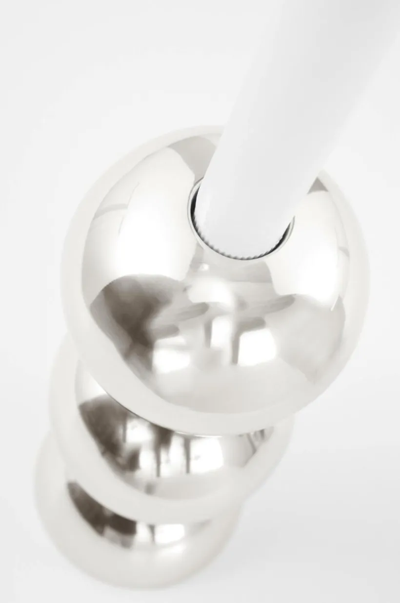 Ljusstake av aluminium som byggts upp av två hela runda klot och ett halvt, därav namnet. Ljusstaken är kromad med polerad och blank lyster. Ljus medföljer ej.