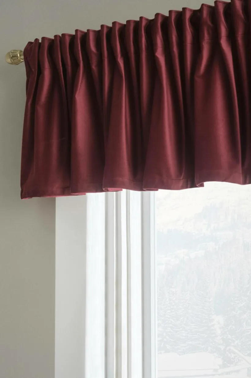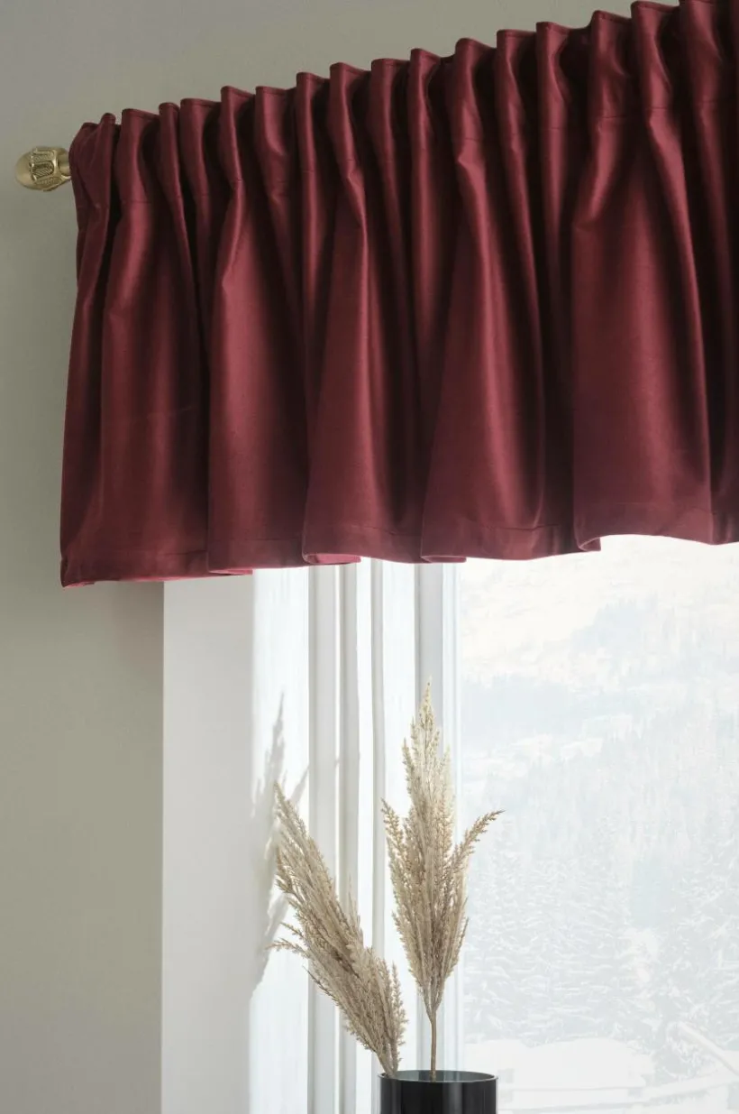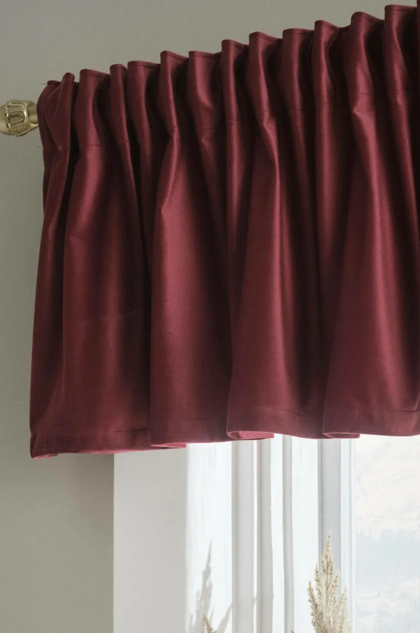 Gardinkappa i enfärgad sammet av polyester. Sammet har fin lyster och mjuk känsla, färgen skimrar vackert i olika ljus. Påsytt multifunktionsband upptill och kappan kan hängas upp med fingerkrokar, kanal samt dold hälla.