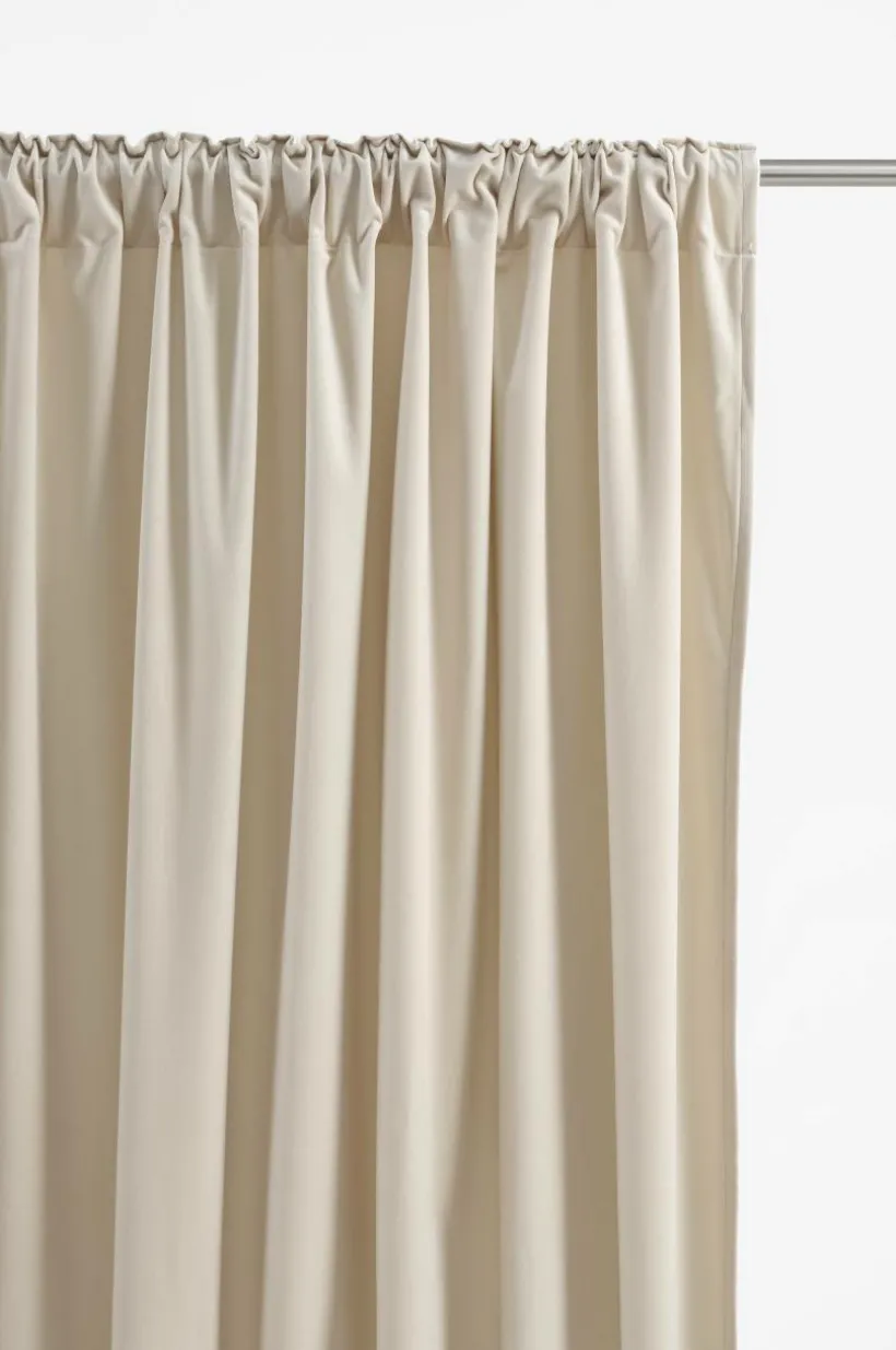 En gardinlängd i enfärgad sammet av polyester. Sammet har fin lyster och mjuk känsla, färgen skimrar vackert i olika ljus. Längden har påsytt multifunktionsband. Gardinen kan hängas upp med fingerkrokar, kanal samt dold hälla.