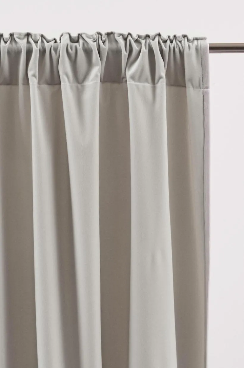 En gardinlängd i enfärgad sammet av polyester. Sammet har fin lyster och mjuk känsla, färgen skimrar vackert i olika ljus. Längden har påsytt multifunktionsband. Gardinen kan hängas upp med fingerkrokar, kanal samt dold hälla.
