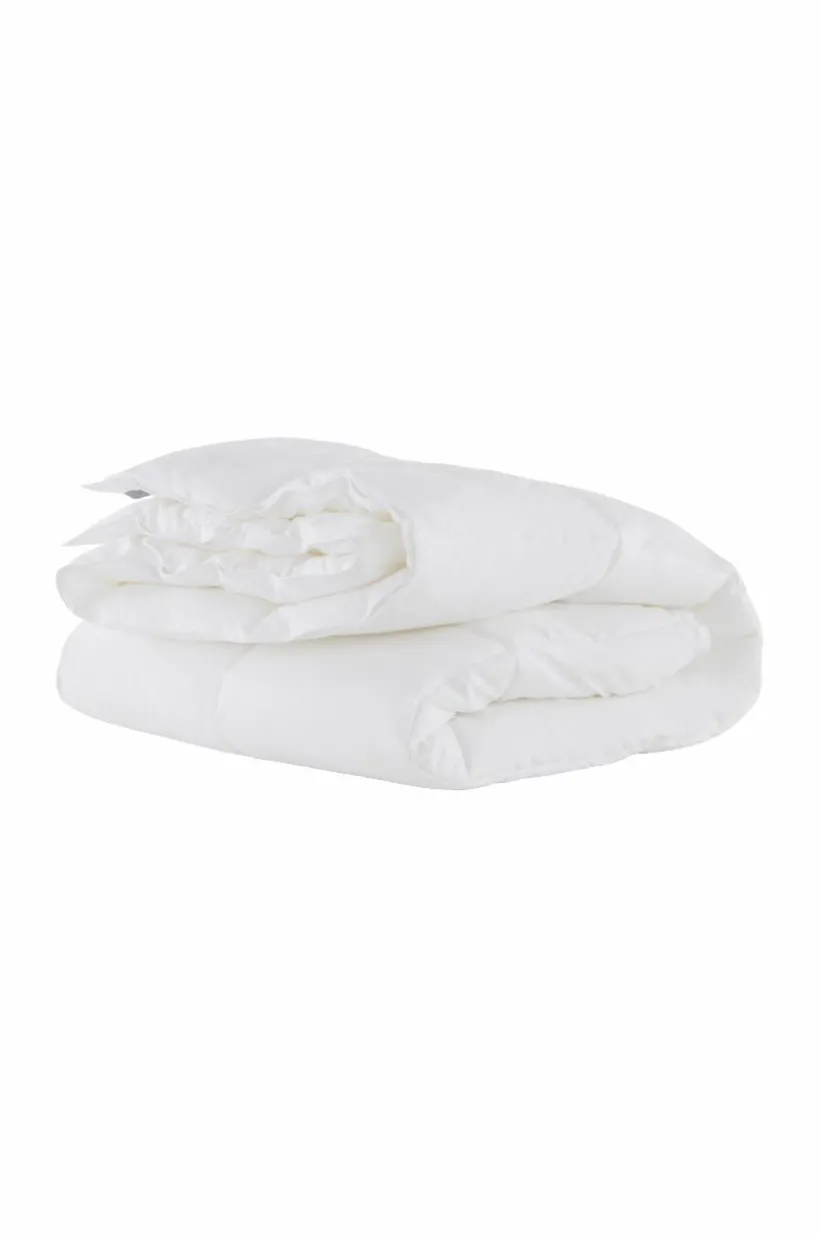 Täcke för enkelsäng av bomullspercale med syntetfyllning av plast plockad från haven. Täcket är rutquiltat och har sydda mellanväggar för att hålla fyllningen på plats. Täcket är förkrympt och krymper därför inte i tvätten. .