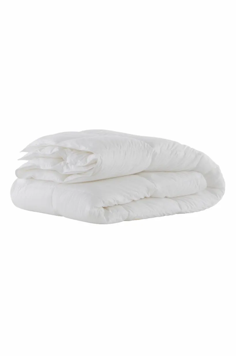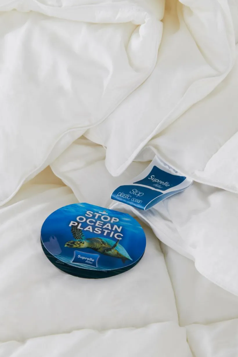 Svalt täcke för dubbelsäng av bomullspercale med syntetfyllning av plast plockad från haven. Täcket är rutquiltat och har sydda mellanväggar för att hålla fyllningen på plats. Täcket är förkrympt och krymper därför inte i tvätten.