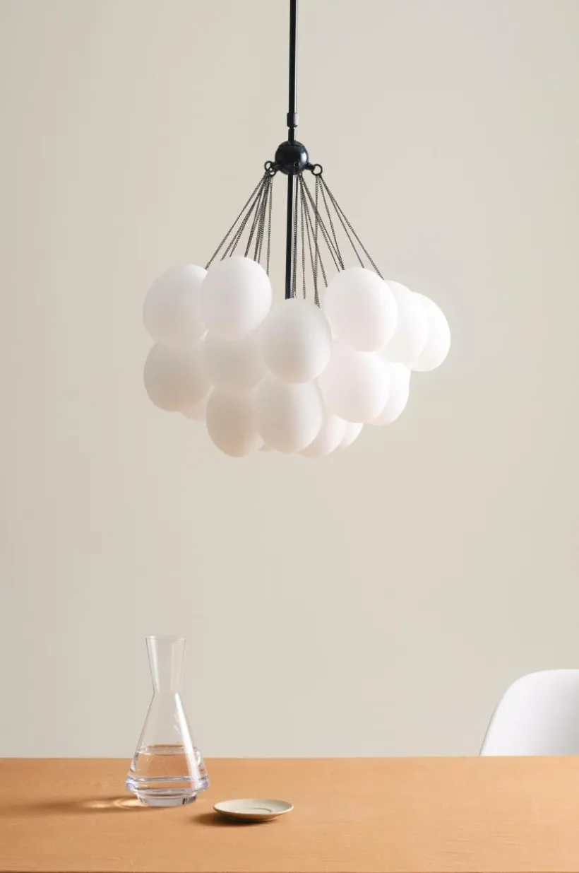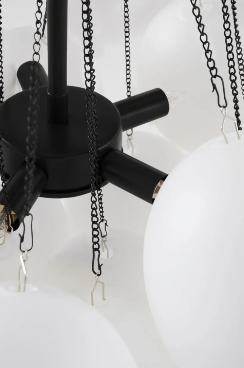 Taklampa med 21 runda klot av opalglas, i fem av kuporna finns en ljushållare vilket gör att lampan sprider ett behagligt sken. Kuporna hänger i en härlig klunga och bildar en pampig och spännande taklampa över ditt matsalsbord till exempel. Stommen och takkoppen är av järn. Lampan är jordad, klass 1. På grund av EU-regler behövs en separat takkontakt i vissa länder. Takkontakten ska vara jordad (klass 1) och köps separat.