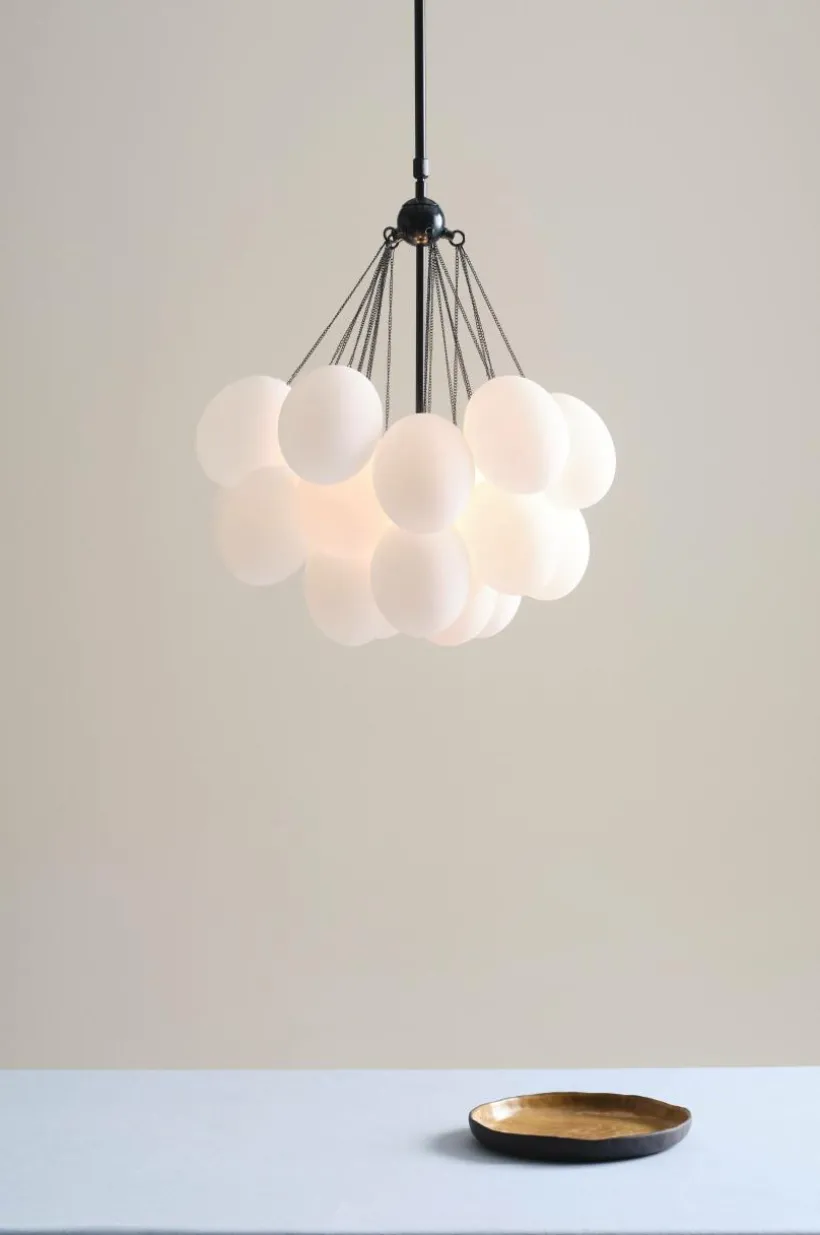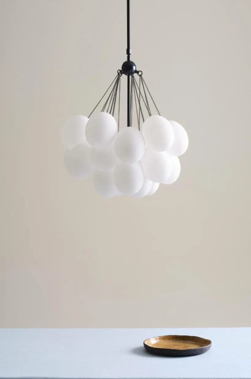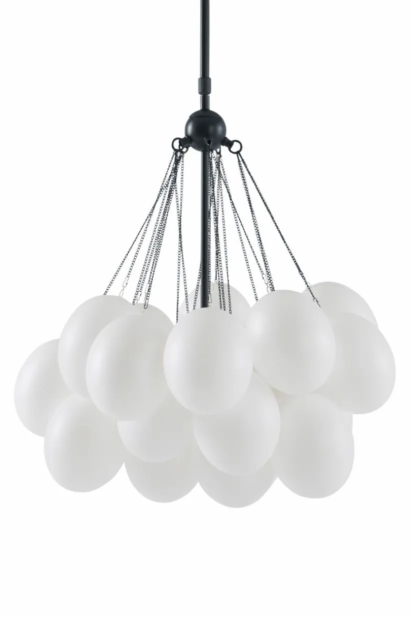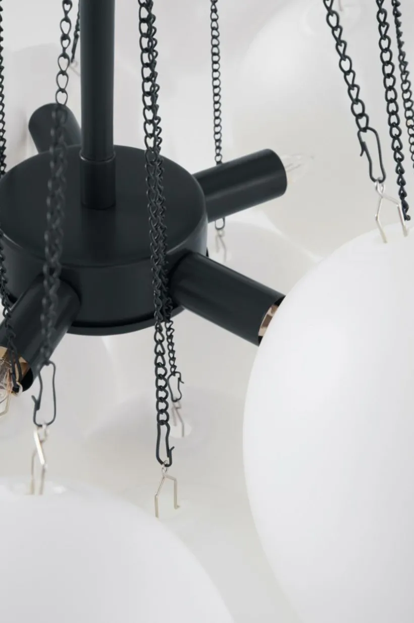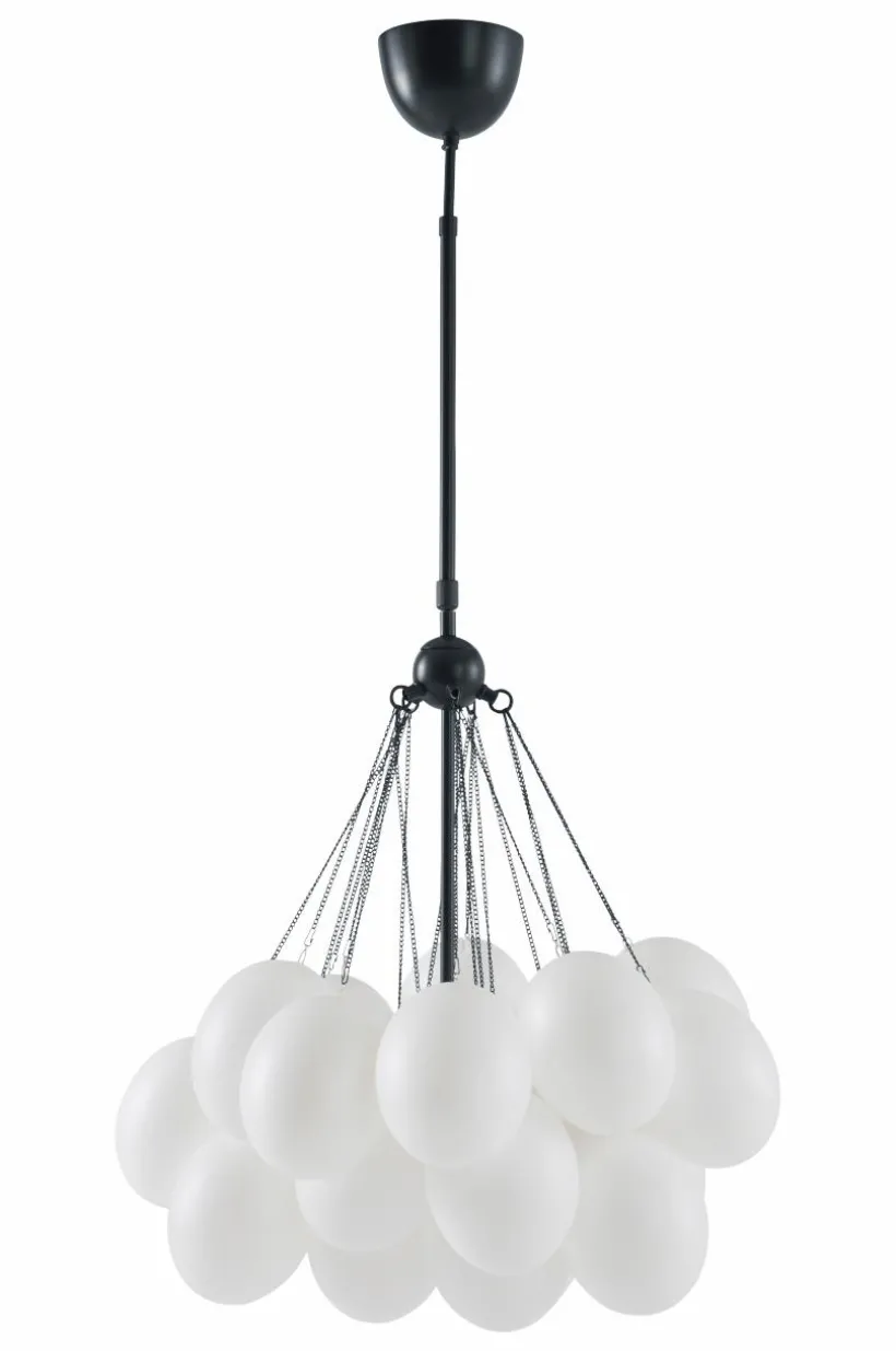 Taklampa med 21 runda klot av opalglas, i fem av kuporna finns en ljushållare vilket gör att lampan sprider ett behagligt sken. Kuporna hänger i en härlig klunga och bildar en pampig och spännande taklampa över ditt matsalsbord till exempel. Stommen och takkoppen är av järn. Lampan är jordad, klass 1. På grund av EU-regler behövs en separat takkontakt i vissa länder. Takkontakten ska vara jordad (klass 1) och köps separat.