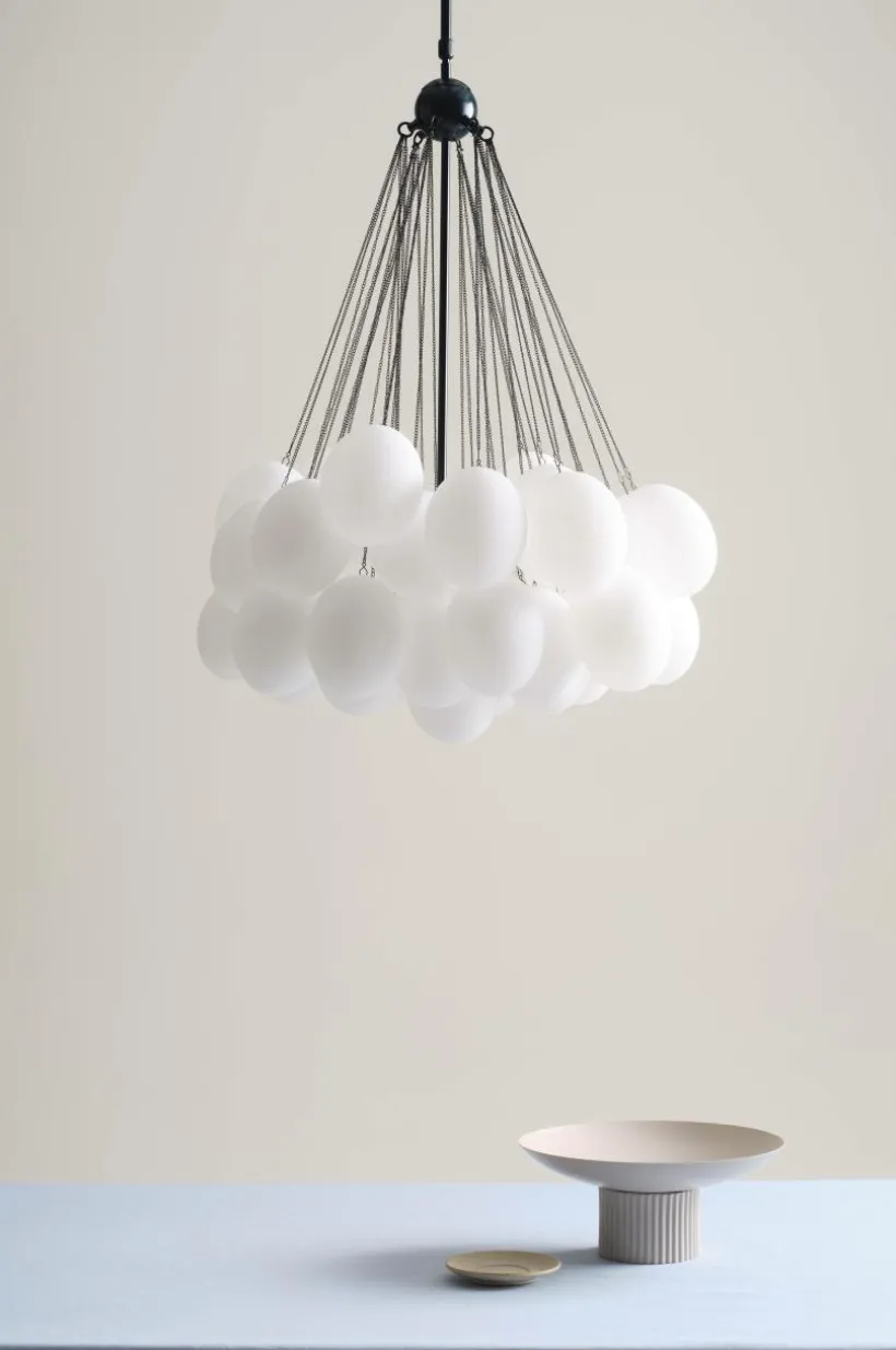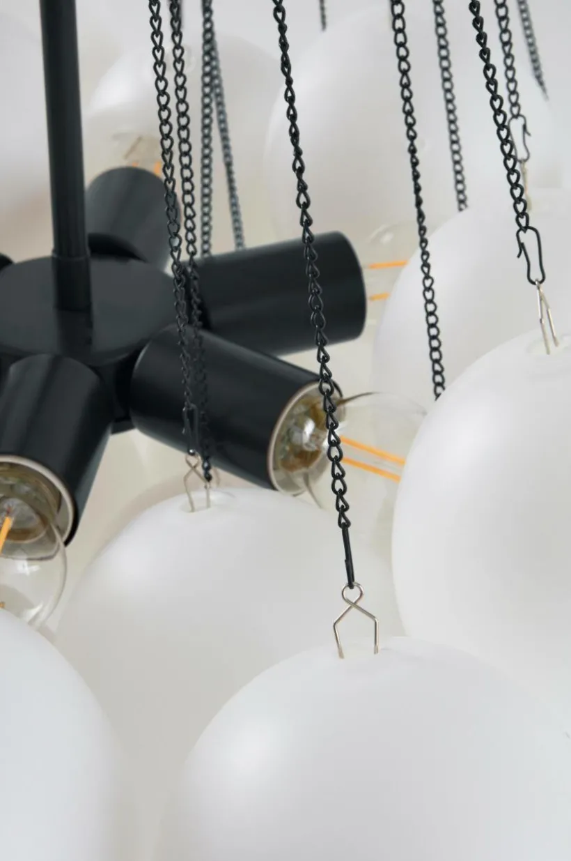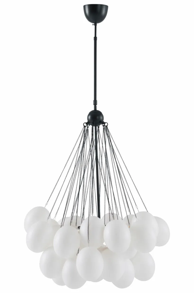Taklampa med 37 runda klot av opalglas, i sex av kuporna finns en ljushållare vilket gör att lampan sprider ett behagligt sken. Kuporna hänger i en härlig klunga och bildar en pampig och spännande taklampa över ditt matsalsbord till exempel. Stommen och takkoppen är av järn. Lampan är jordad, klass 1. På grund av EU-regler behövs en separat takkontakt i vissa länder. Takkontakten ska vara jordad (klass 1) och köps separat.