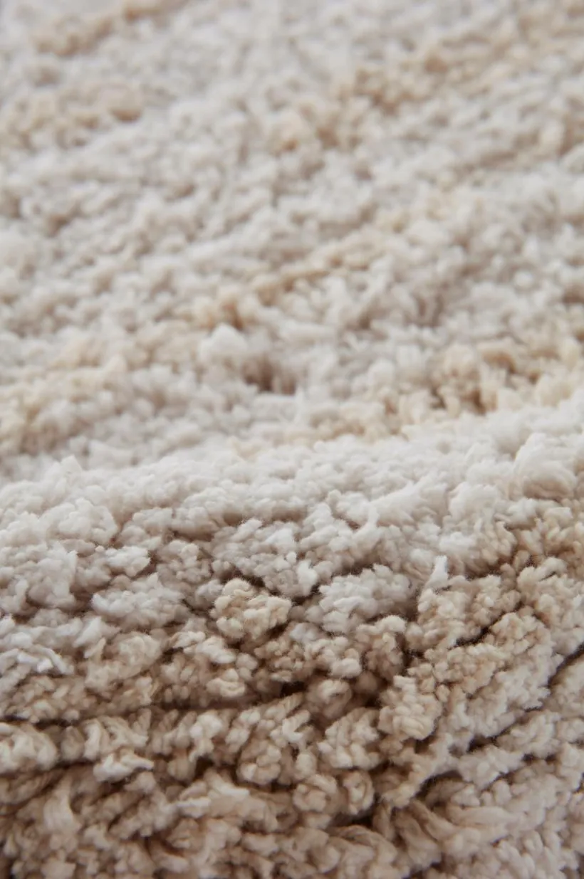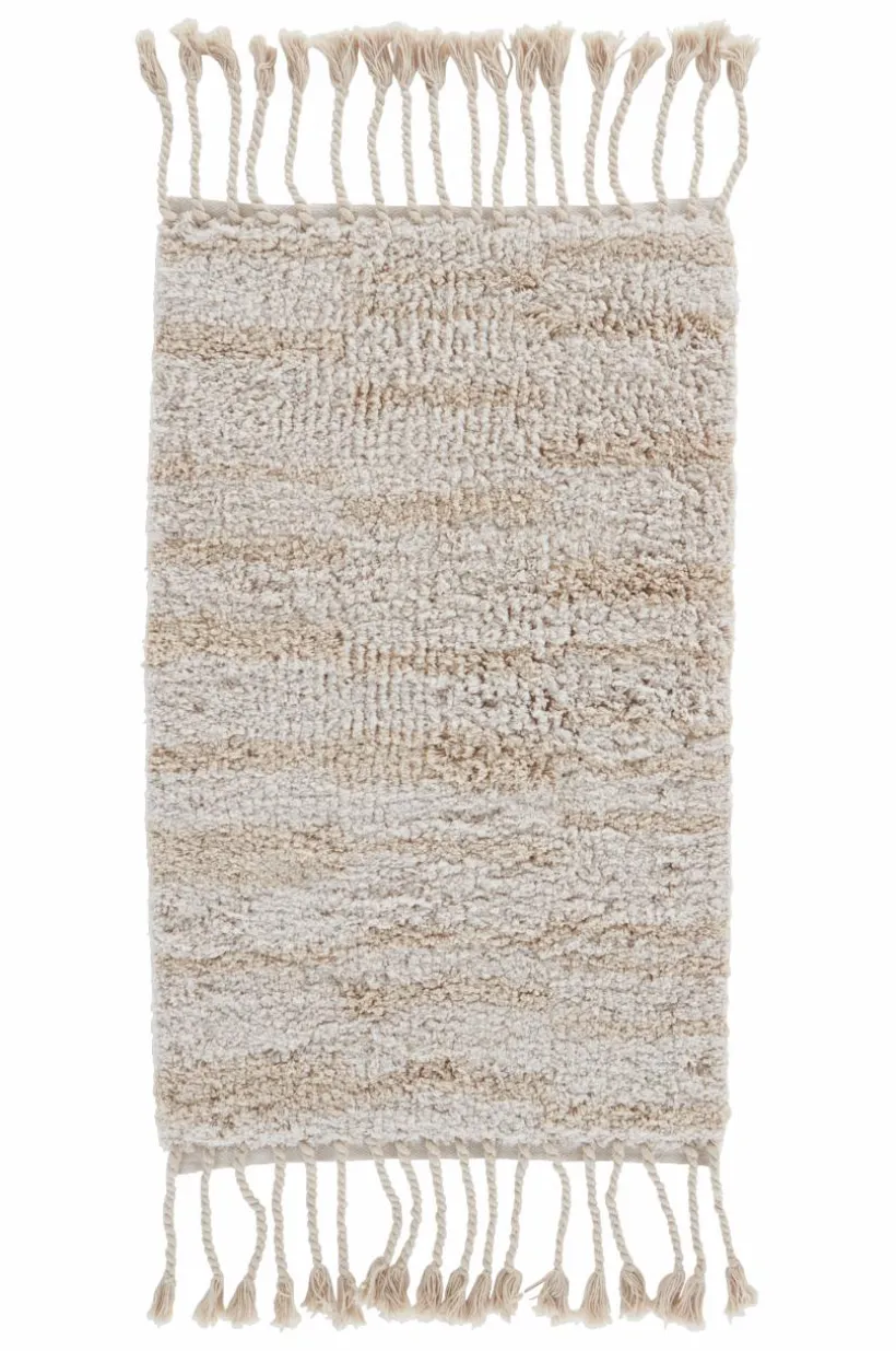 Handvävd badrumsmatta av mjuk bomull med lång, läcker frans. Mattan har snyggt, oregelbundet randmönster och hantverket gör varje matta unik. Franslängd 20 cm. Lugghöjd 2-2,2 cm. Tjocklek 2,2-2,4 cm. 3200-3400 g/m².