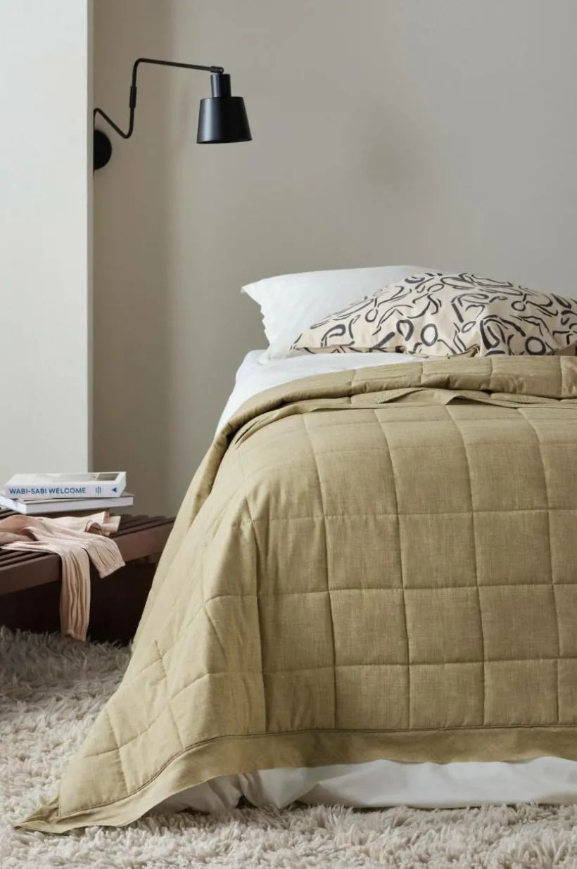 Överkast för enkelsäng. SENTE är av bomull och polyester och har garnfärgat utseende som ger en mjuk och hemtrevlig känsla. Överkastet är rutquiltat med smidig fyllning av polyester. En tunn, rå kant runt om är detaljen som ger överkastet speciell inramning. Kuddfodral medföljer ej, köps separat.
