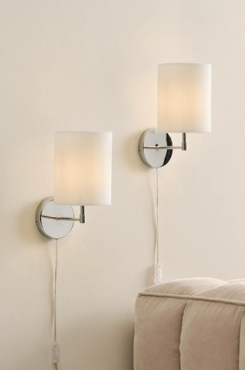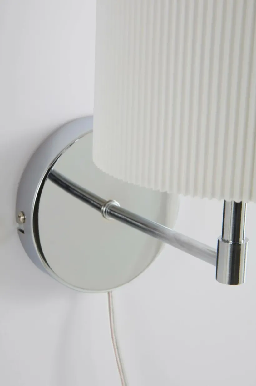 Förpackning med två vägglampor. Varje lampa har en fin, veckad bomullsskärm som sprider ett mjukt sken. Lampfoten är tillverkad av järn. Transparent PVC-kabel med strömbrytare på kabeln. Dessa två lampor är perfekta för att ge elegans till ditt vardagsrum, men de passar också bra i din hall, ditt sovrum eller var du än behöver vacker belysning.