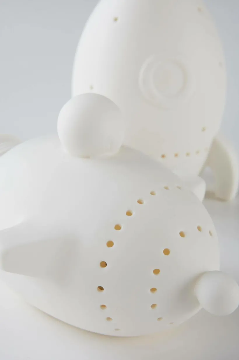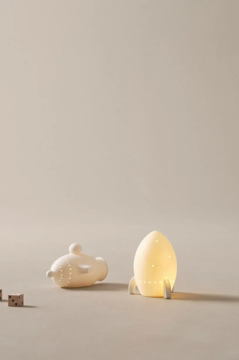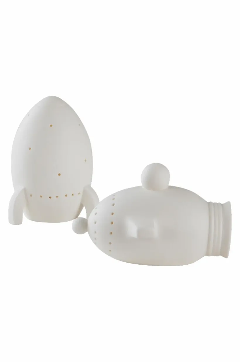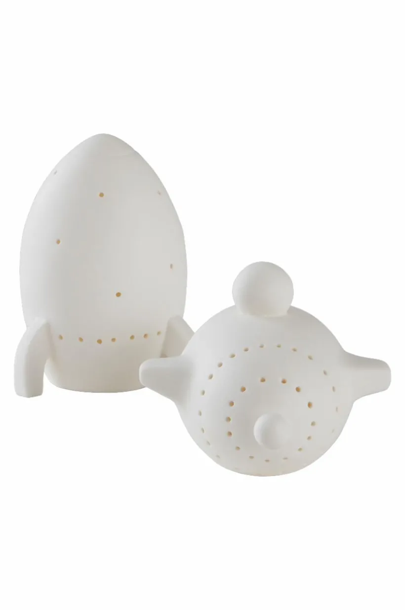 2-pack nattlampor av porslin med LED-belysning. Den ena är formad som en liten rymdraket och den andra som en rymdfarkost, båda är lätt genomskinliga, så de sprider ett mjukt och mysigt sken. De är perfekta att ha tända på natten, som varsamt ledljus eller för barn som kan känna sig tryggare av att det är lite upplyst runt omkring. Batteridrivna med liten av- och påknapp under lampan.