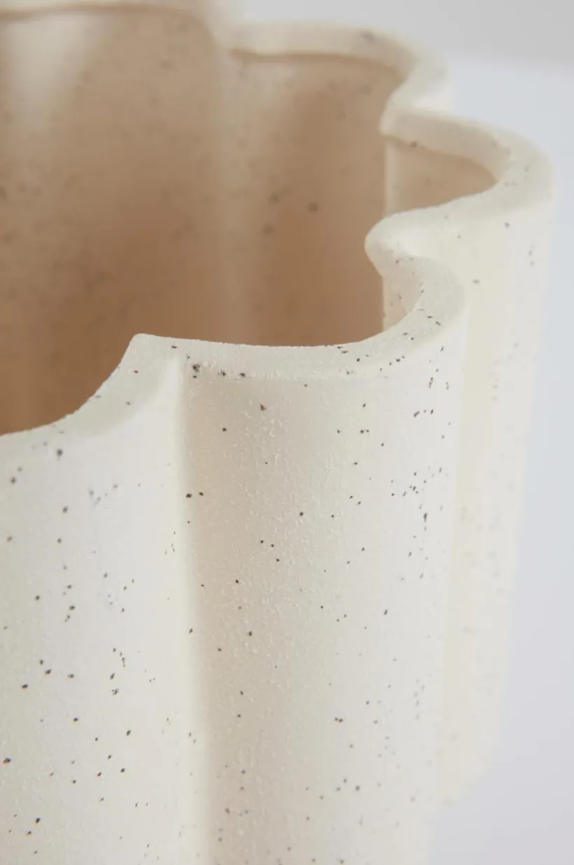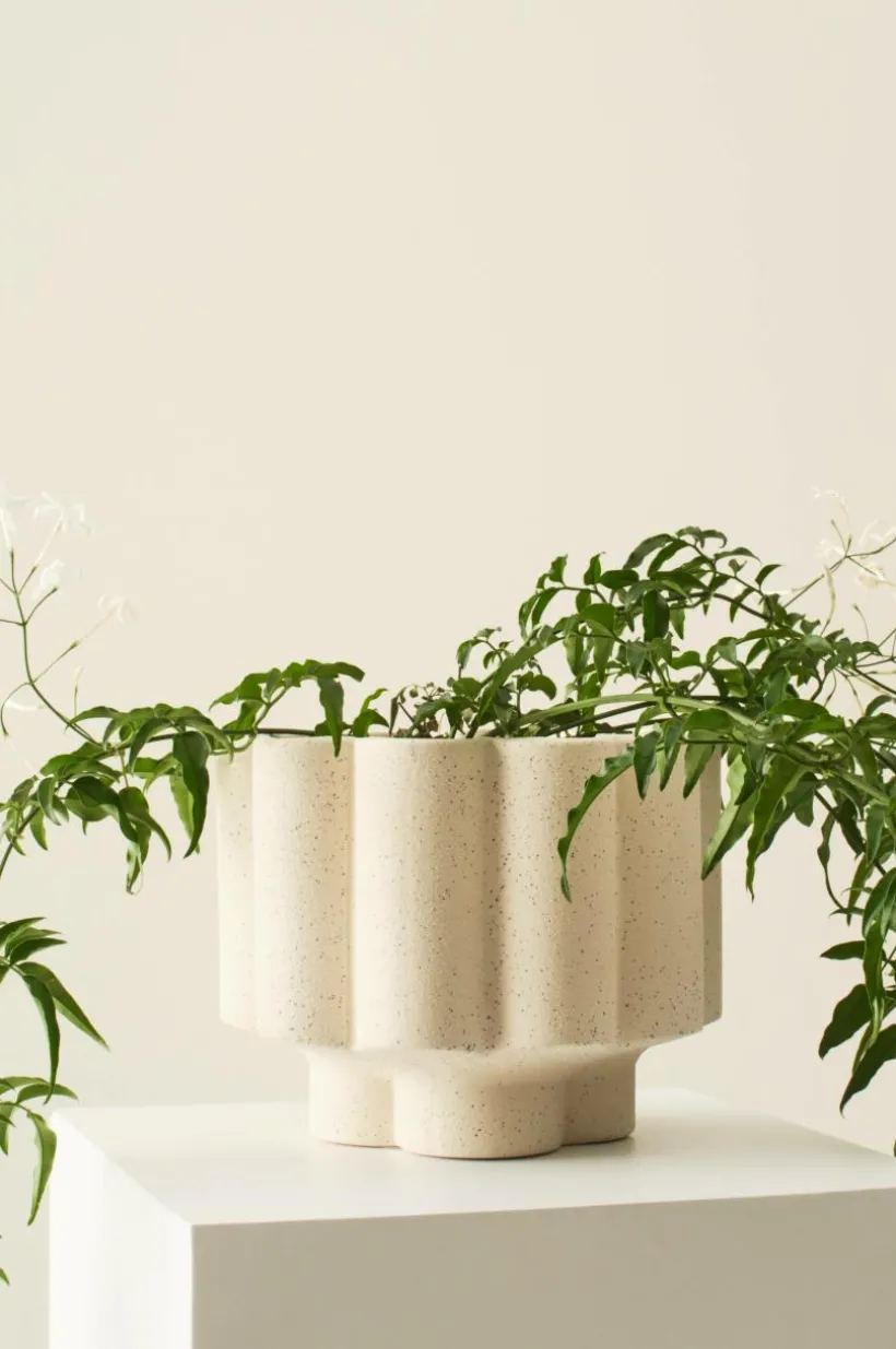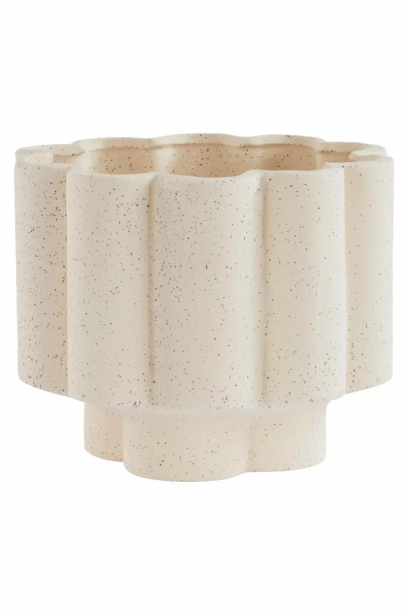 Enfärgad kruka av keramik med stenfinish, formad som en blomma. Foten i mitten gör att krukan kommer upp några centimeter från underlaget. Krukan har glaserats för hand. Även insidan är glaserad. Det fina hantverket gör varje kruka unik. Keramik kan släppa igenom fukt.