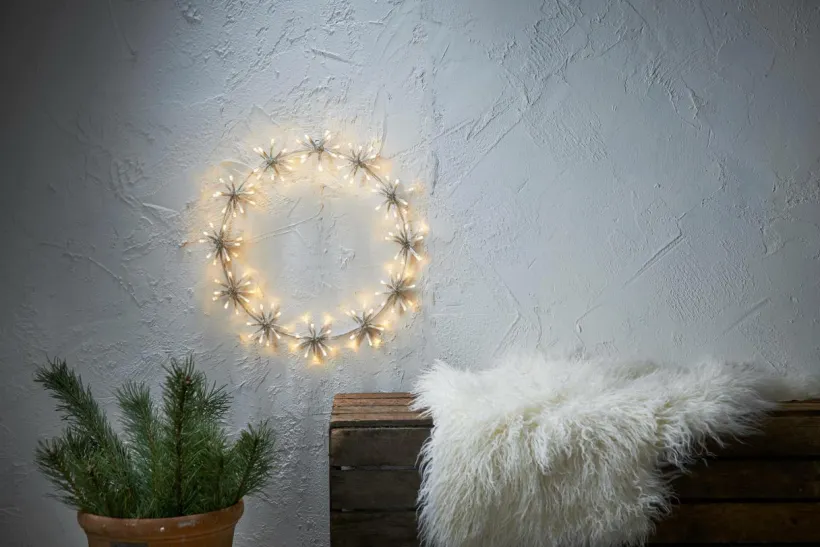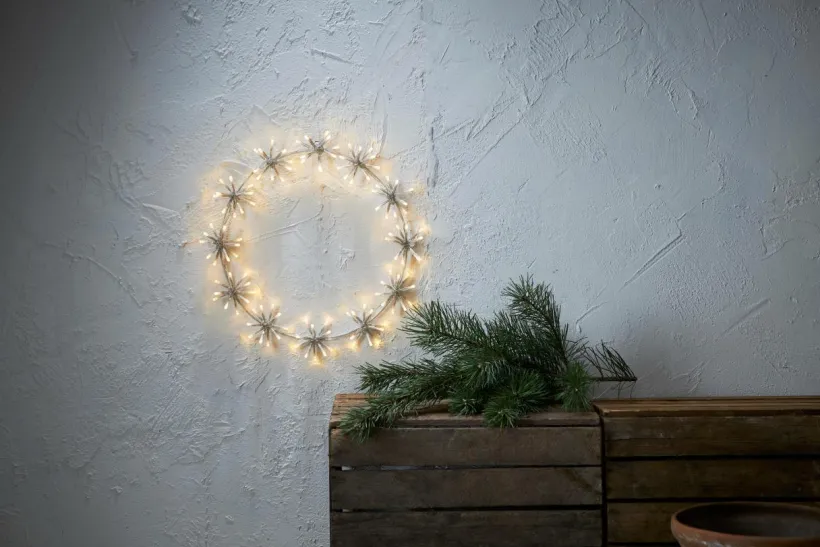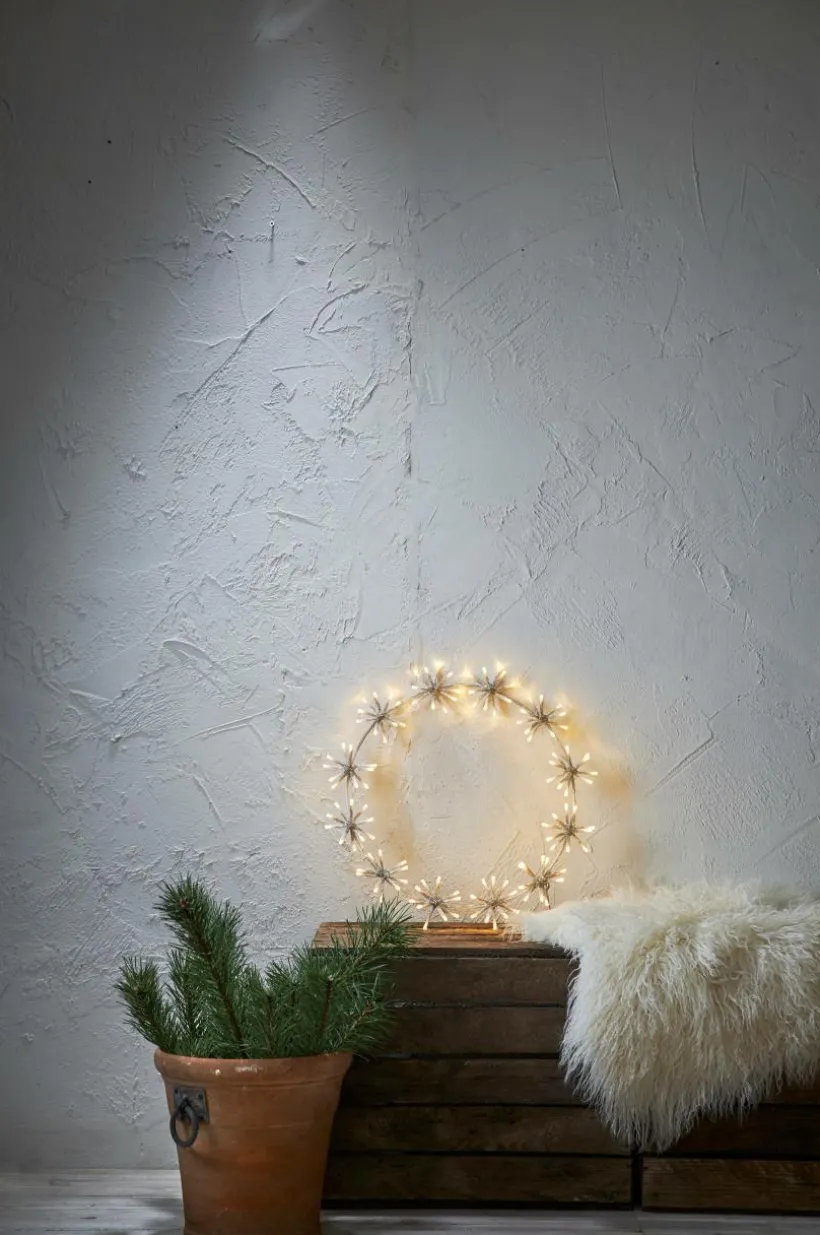 Hängande utomhusdekoration med härligt varmvitt ljussken, skapar en fin stämning i trädgården. Storlek 50 cm med 120 ljuspunkter med IP44 transformator för utomhusbruk.