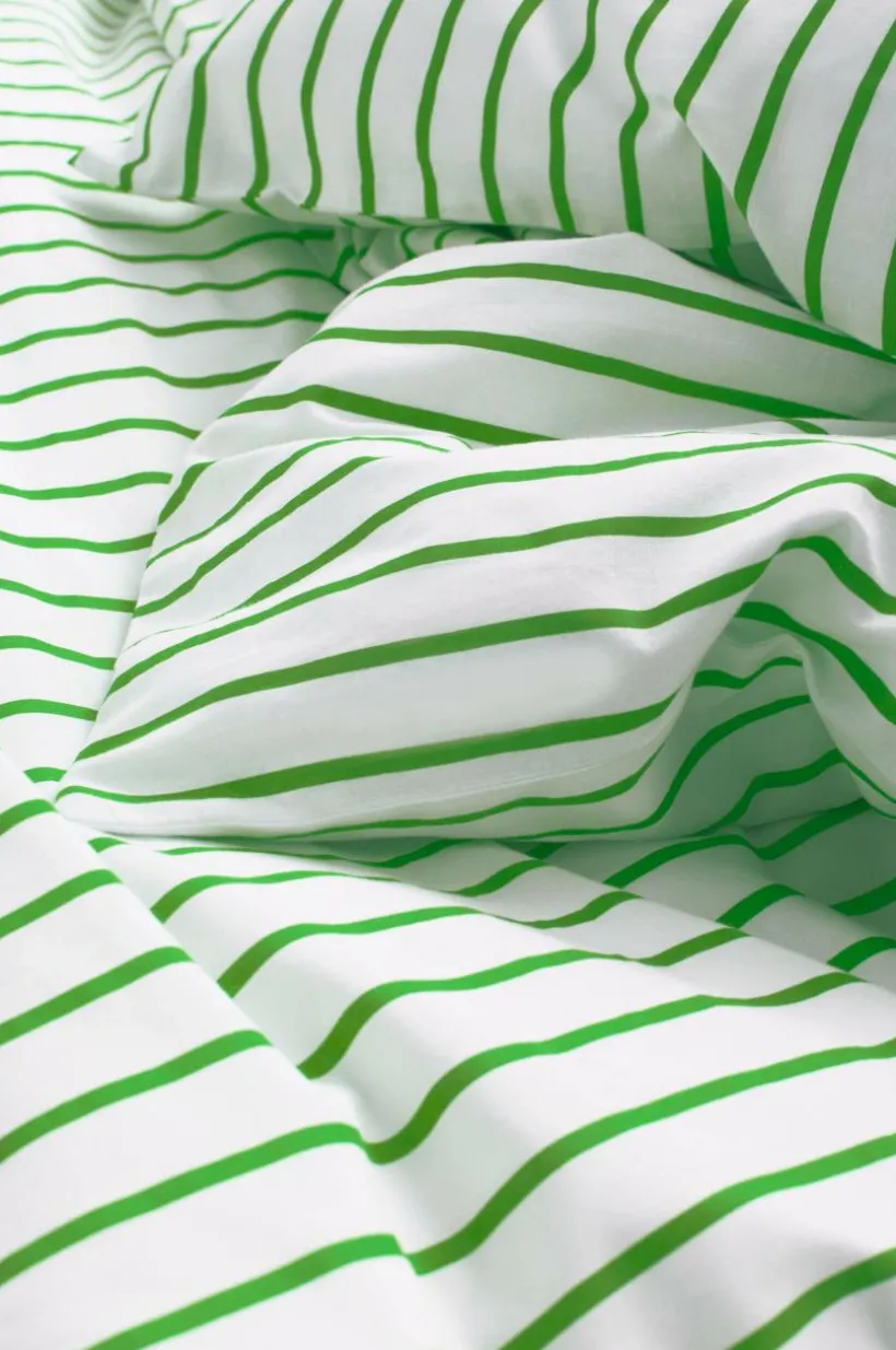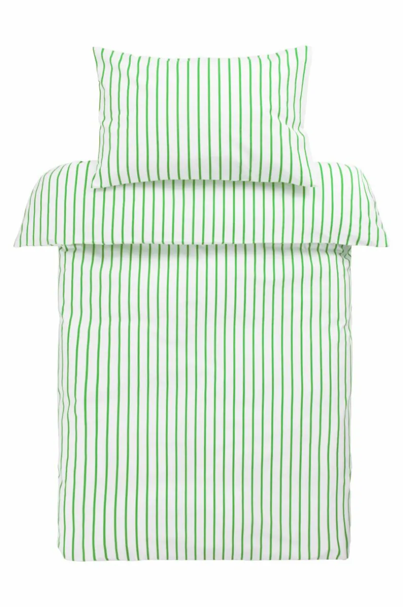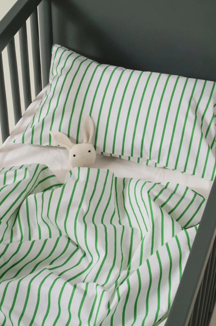SIMA påslakan i ekologisk bomull som är skräddarsytt för att passa spjälsängen och ge en mjuk känsla för ditt barns vilsamma sömn. Tryckta ränder i krispiga färger.