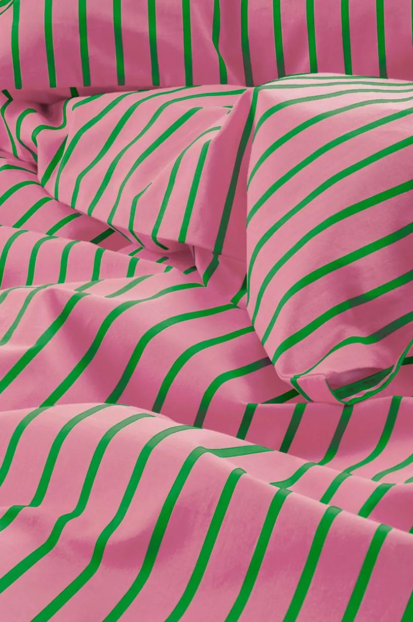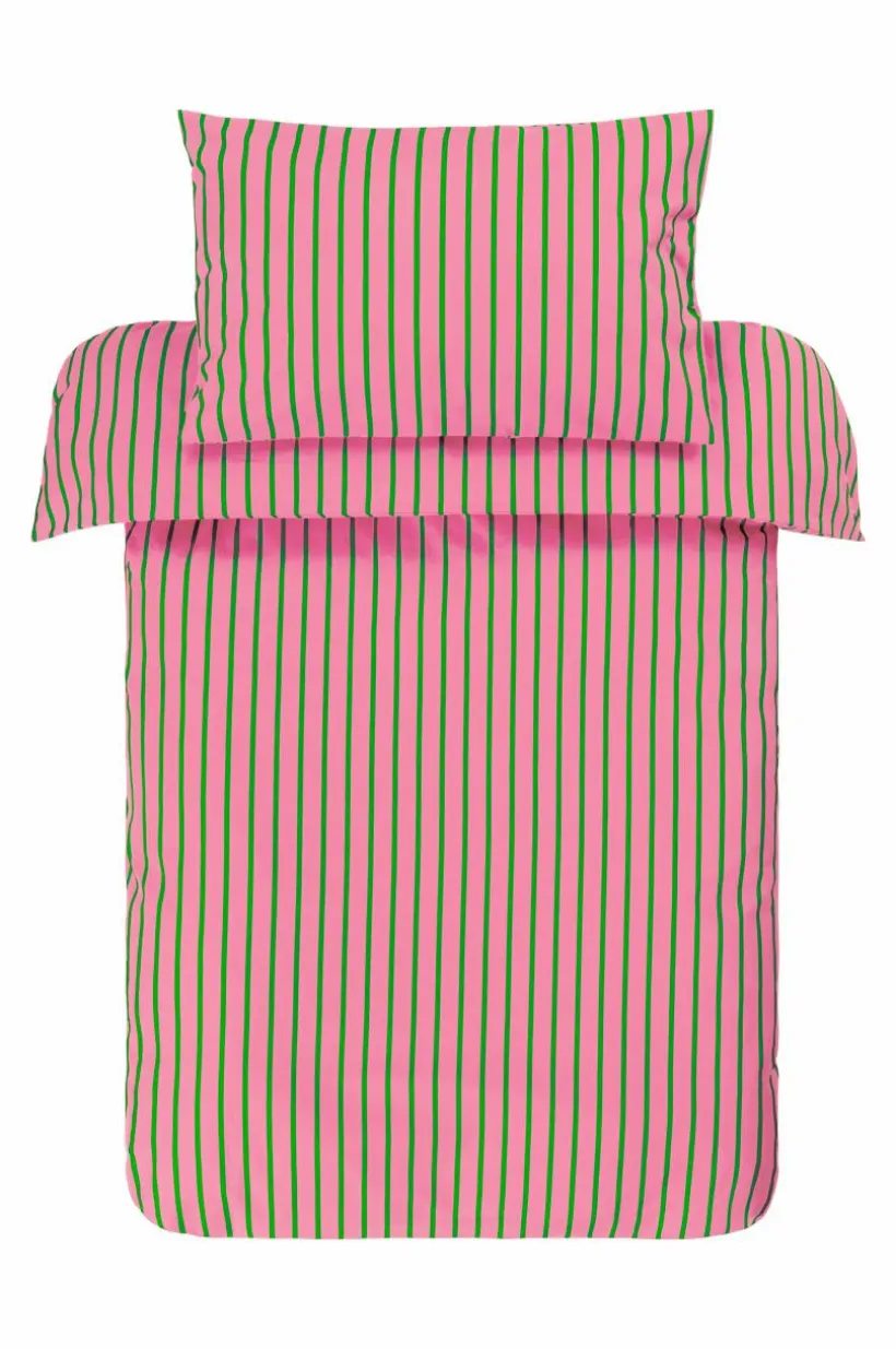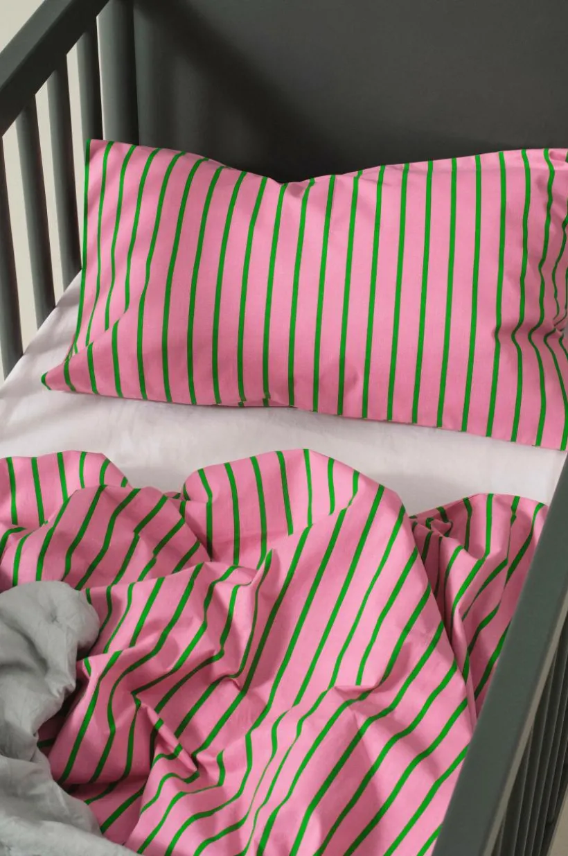 SIMA påslakan i ekologisk bomull som är skräddarsytt för att passa spjälsängen och ge en mjuk känsla för ditt barns vilsamma sömn. Tryckta ränder i krispiga färger.