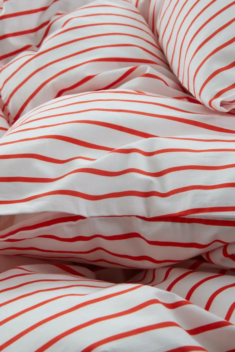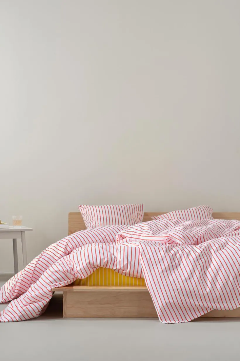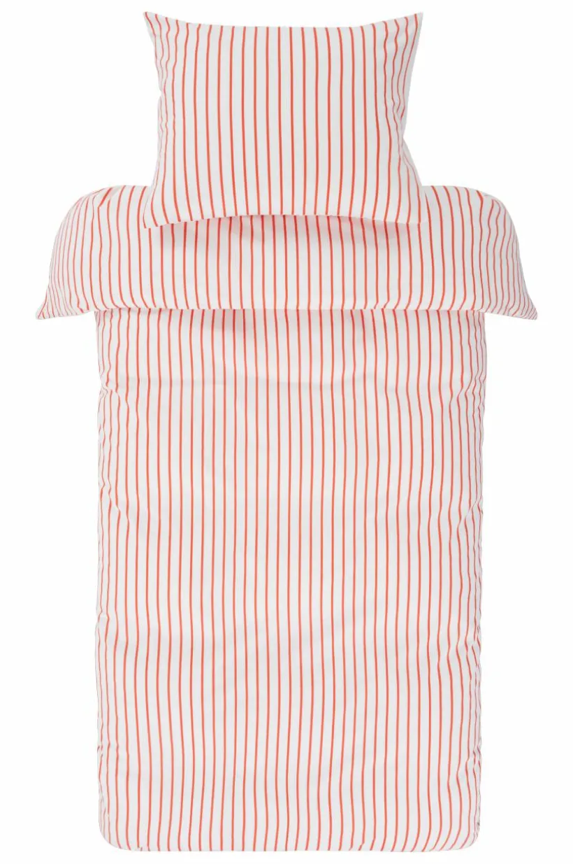 SIMA bäddset tillverkat av ekologisk bomull. Tryckta ränder i krispiga färger. Praktiska handhål för täcket. Förvandla ditt sovrum till en vilsam plats.