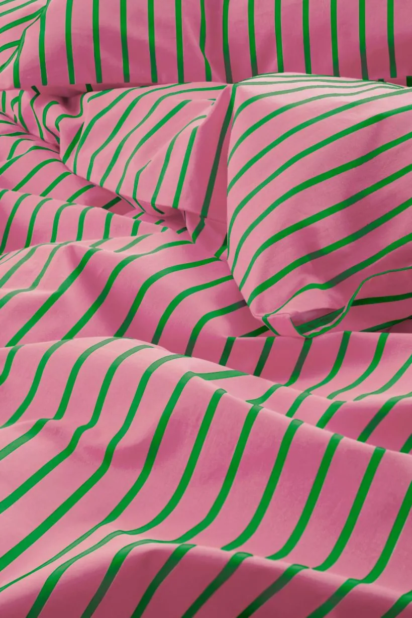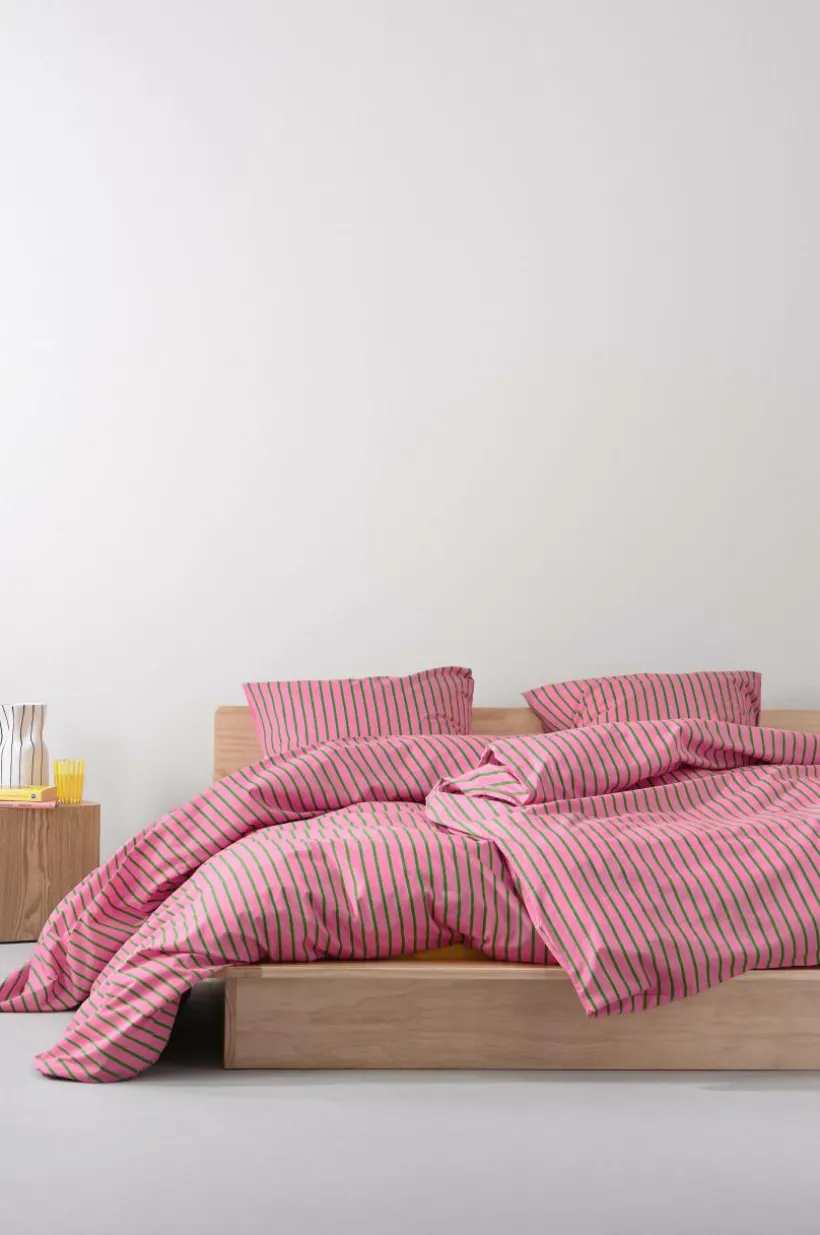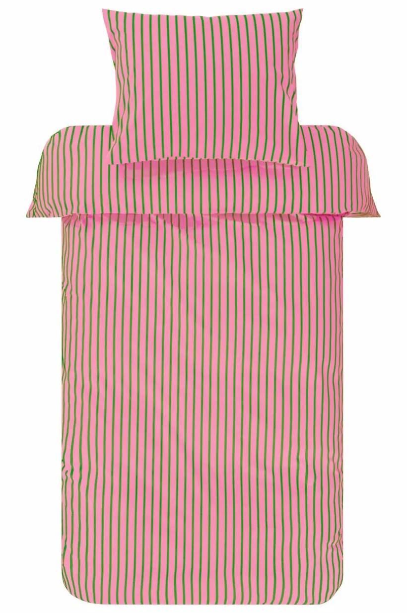 SIMA bäddset tillverkat av ekologisk bomull. Tryckta ränder i krispiga färger. Praktiska handhål för täcket. Förvandla ditt sovrum till en vilsam plats.